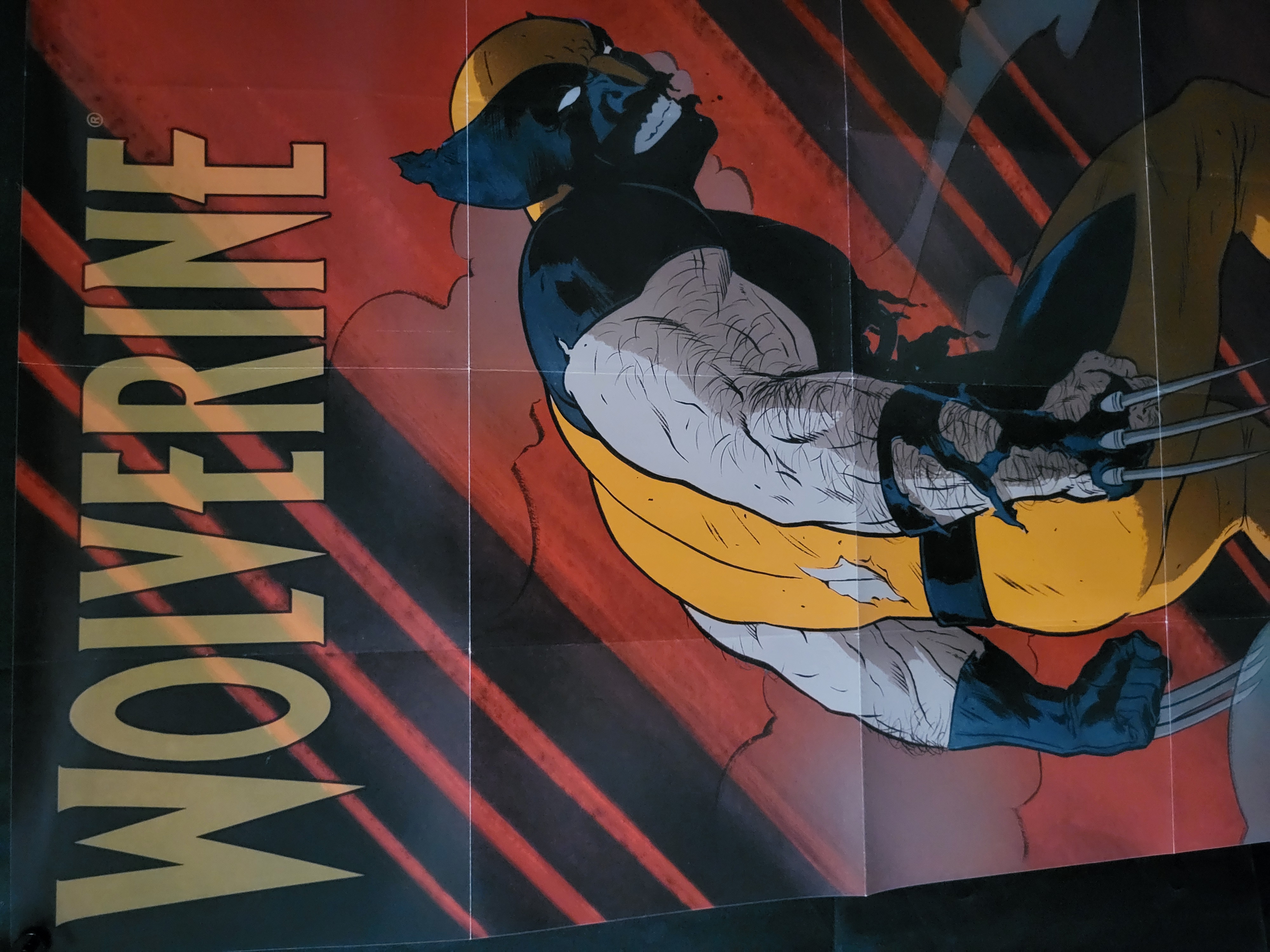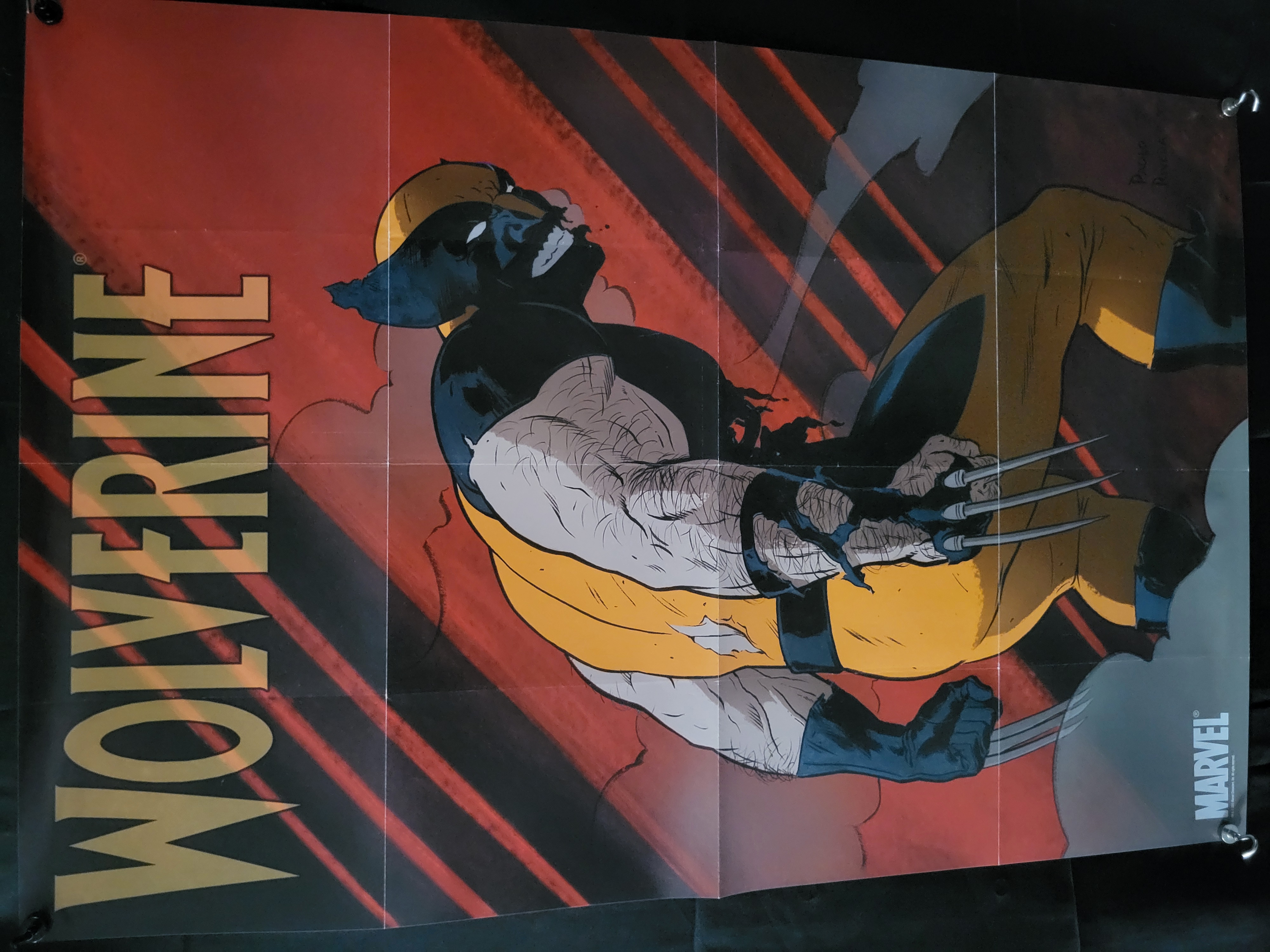BID PER WHAT YOU SEE IN THE PHOTO, NOT THE AI GENERATED TITLES AND DESCRIPTIONS! This Marvel Comics promotional poster features artwork by Paolo Rivera, originally produced for the cover of Wolverine Volume 4, Issue 5.1 in 2011. The graphic depicts the character Wolverine in a dynamic pose with claws extended, wearing his traditional yellow and blue costume. The layout includes large vertical Wolverine text on the left and the Marvel brand logo in the lower right corner. The background is composed of red and black tones with stylized speed lines. This item is a paper-based promotional graphic distributed in a factory-folded format.