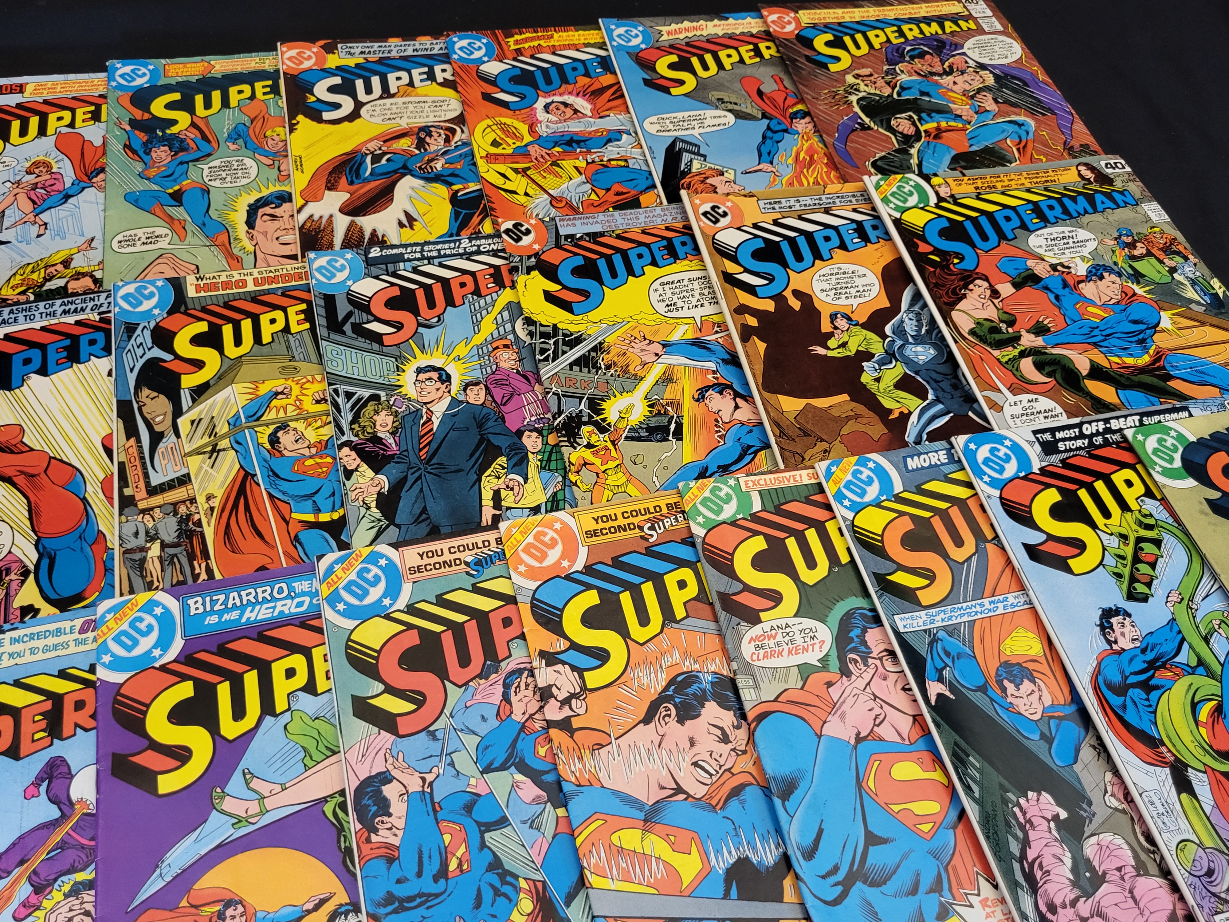BID PER WHAT YOU SEE IN THE PHOTO, NOT THE AI GENERATED TITLES AND DESCRIPTIONS! This collection of DC Comics Superman titles dates from the late 1970s and early 1980s, representing the Bronze Age of comic books. The group includes various individual issues such as No. 327, 344, 345, and 348. Cover prices range from 40 to 50 cents. The covers feature storylines involving characters such as Bizarro, Kobra, Lex Luthor, and Rose and the Thorn. Each issue is constructed with standard newsprint interiors and glossy cover stock secured by staple bindings. Notable cover art from the era is present throughout the assortment.