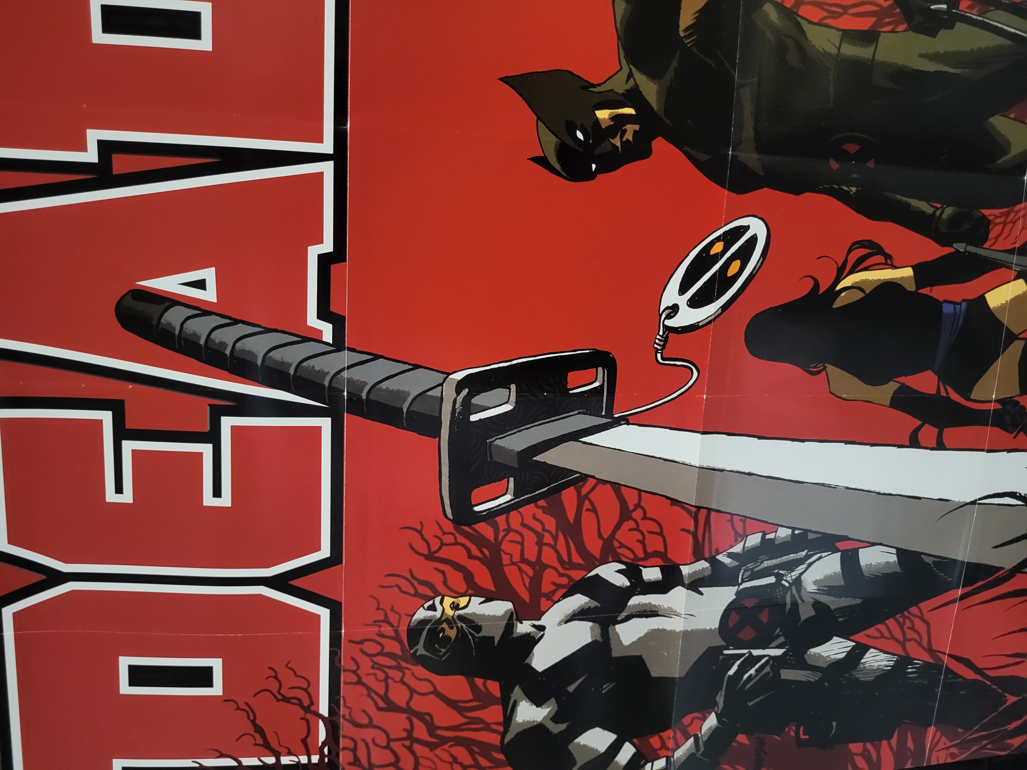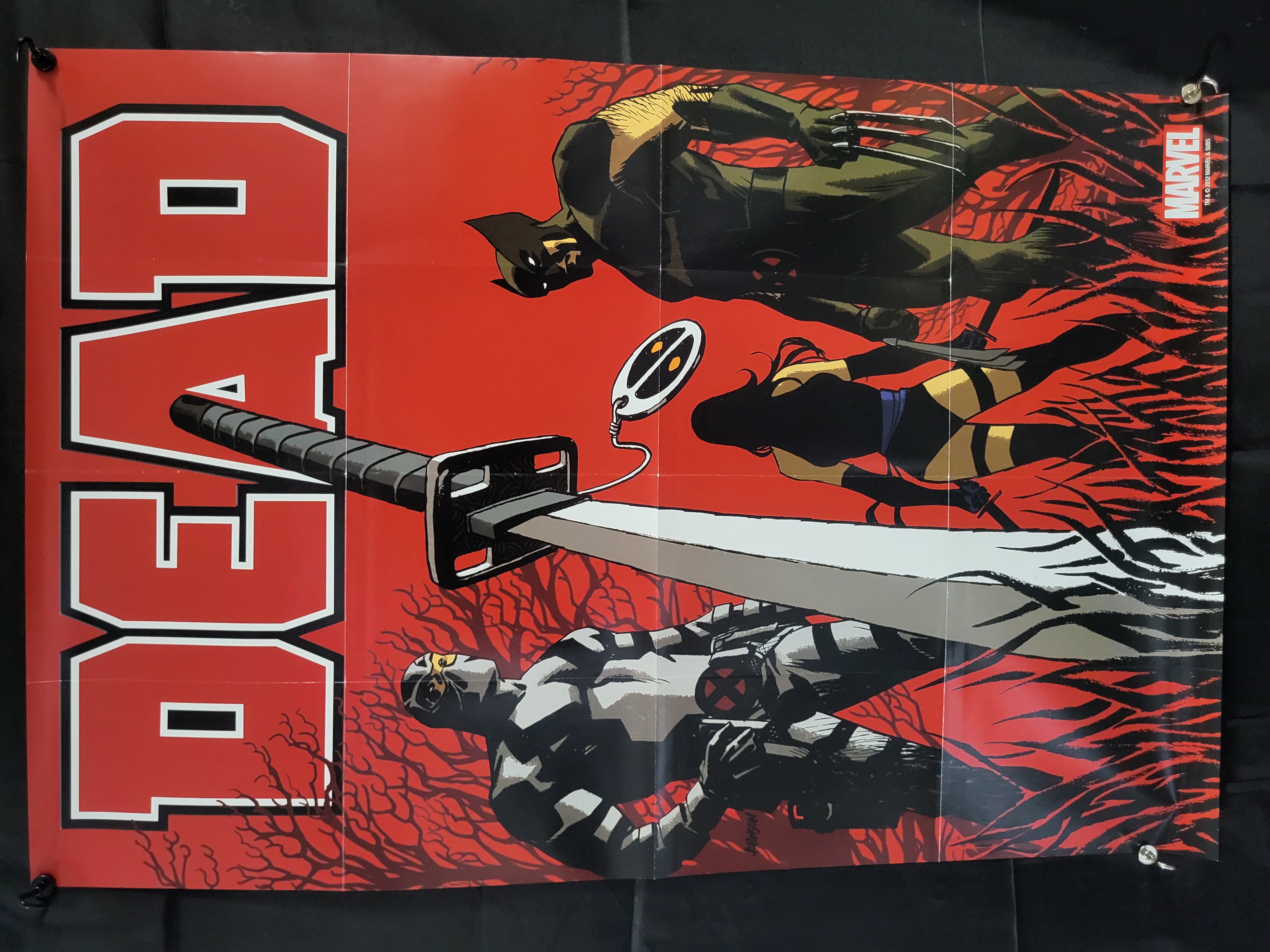 BID PER WHAT YOU SEE IN THE PHOTO, NOT THE AI GENERATED TITLES AND DESCRIPTIONS! This promotional Marvel Comics poster, issued in 2012, features artwork by Dave Johnson for the Deadpool #50 story arc titled Dead. The composition depicts characters Deadpool, Wolverine, and Psylocke against a red background with stylized black silhouettes of trees. A large katana with a Deadpool-themed charm occupies the foreground. The left side of the poster features the word DEAD in large, white-outlined block lettering. The upper right corner bears the Marvel logo and the copyright line TM & © 2012 MARVEL & SUBS. The artist signature JOHNSON is printed near the bottom center. The poster is printed on paper and was originally distributed folded.