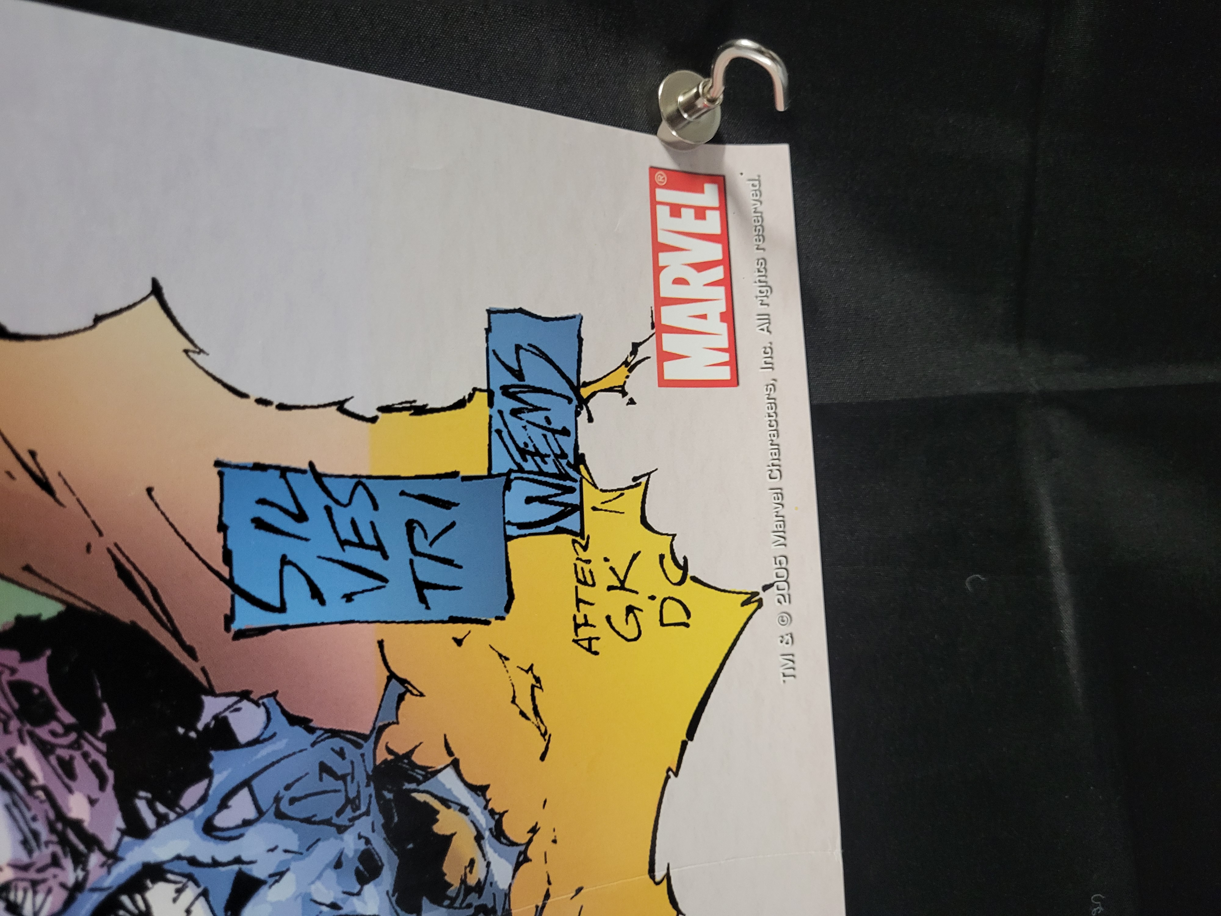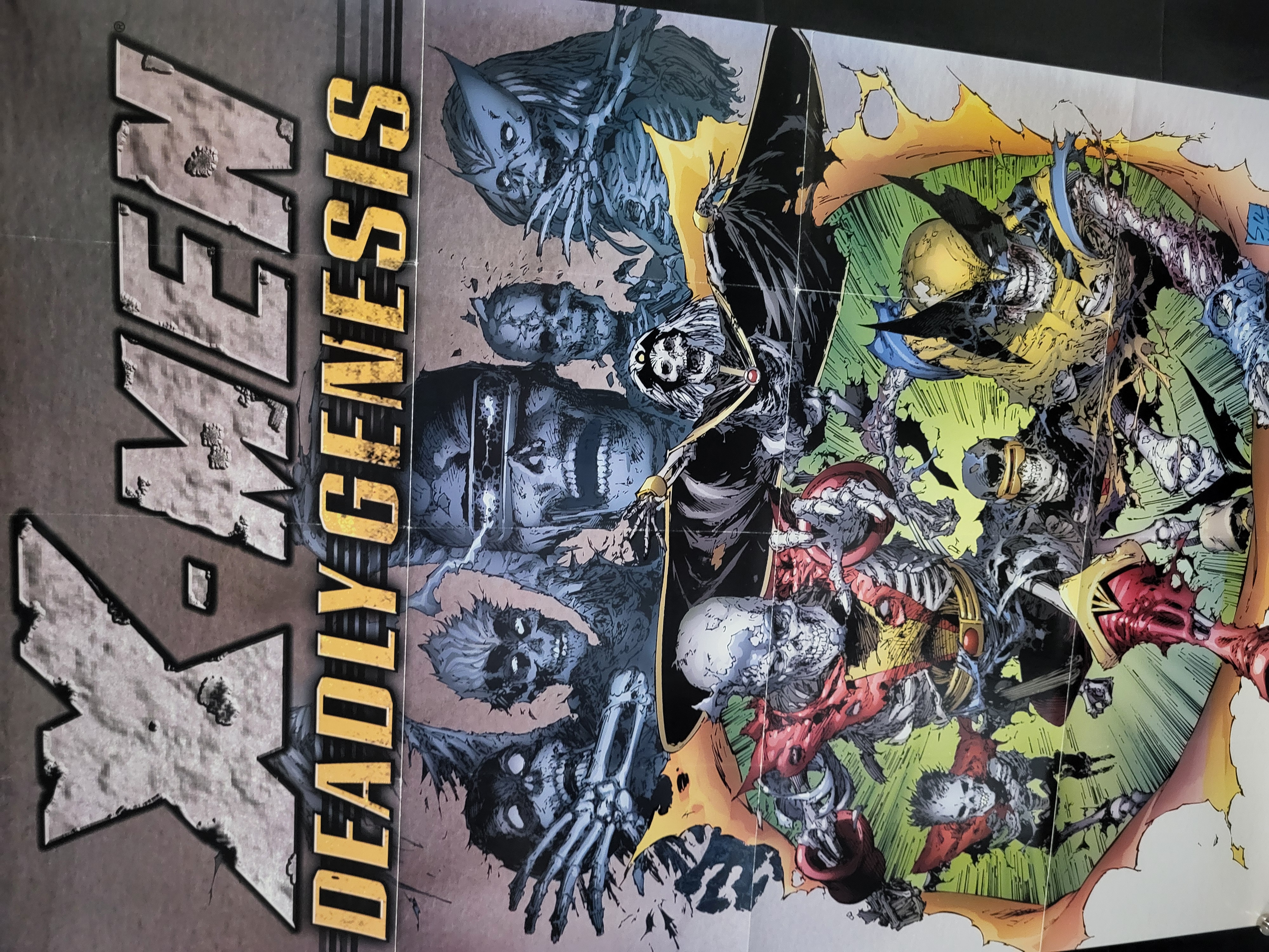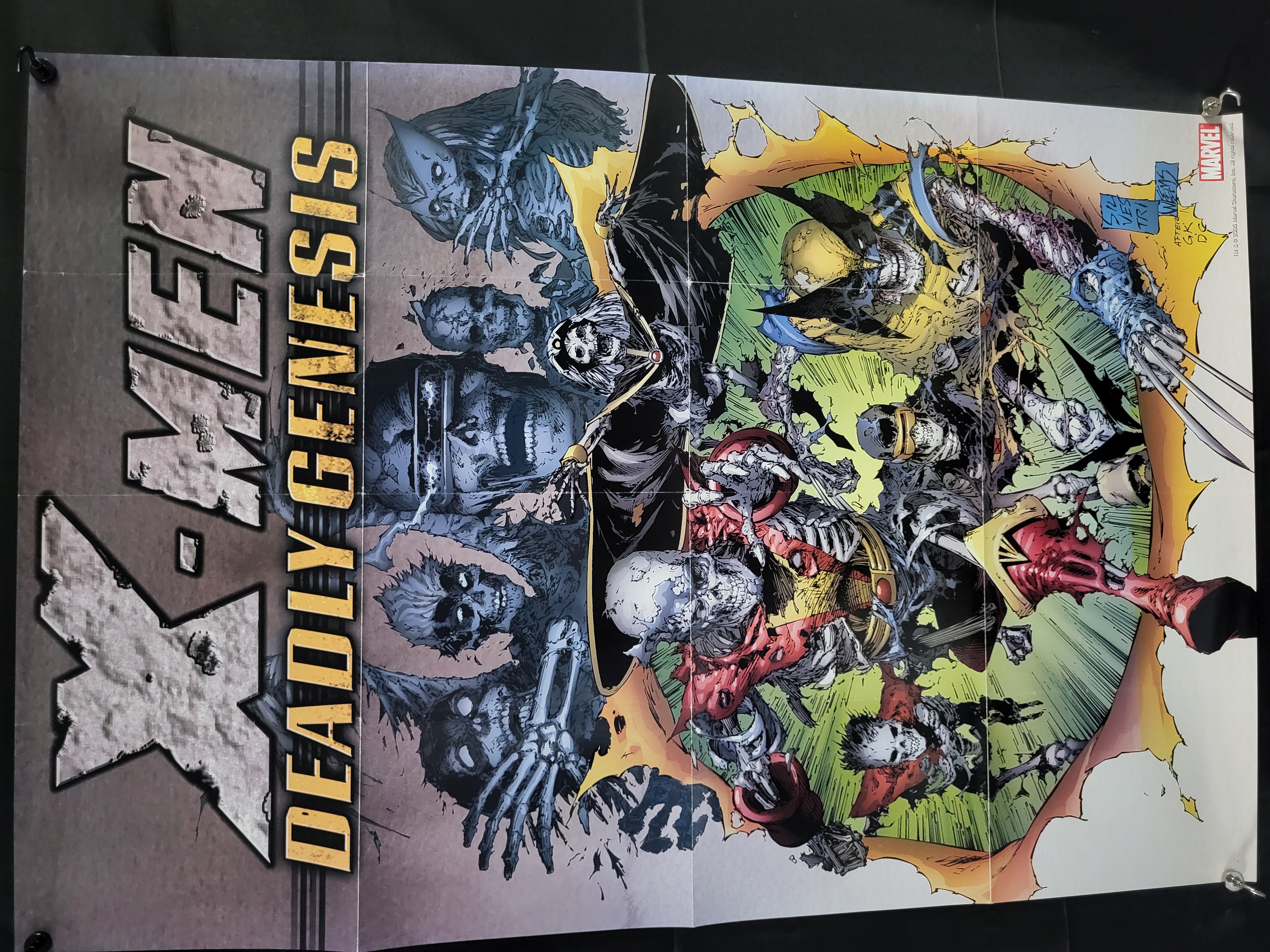 BID PER WHAT YOU SEE IN THE PHOTO, NOT THE AI GENERATED TITLES AND DESCRIPTIONS! A promotional paper poster for the Marvel Comics series X-Men Deadly Genesis, published in 2005. The artwork, credited to Marc Silvestri and Weems, depicts stylized skeletal versions of iconic X-Men characters including Wolverine, Storm, Colossus, and Nightcrawler. The poster prominently features the title X-MEN DEADLY GENESIS in large textured lettering alongside the Marvel logo and legal copyright information. The item is printed on paper and was originally distributed with machine folds for inclusion in comic shipments or retail kits.