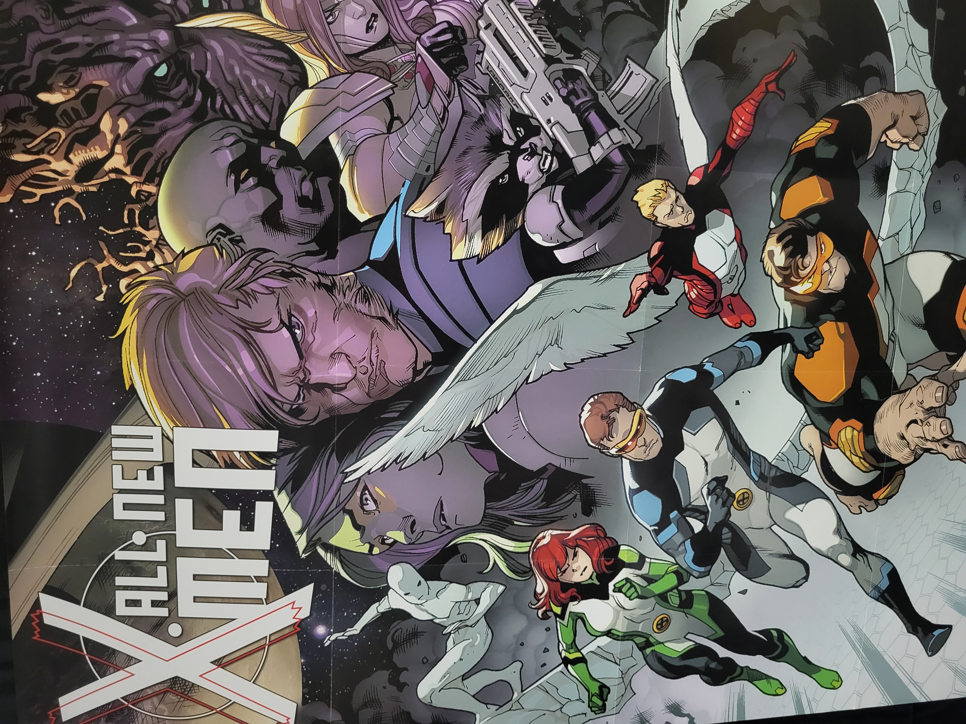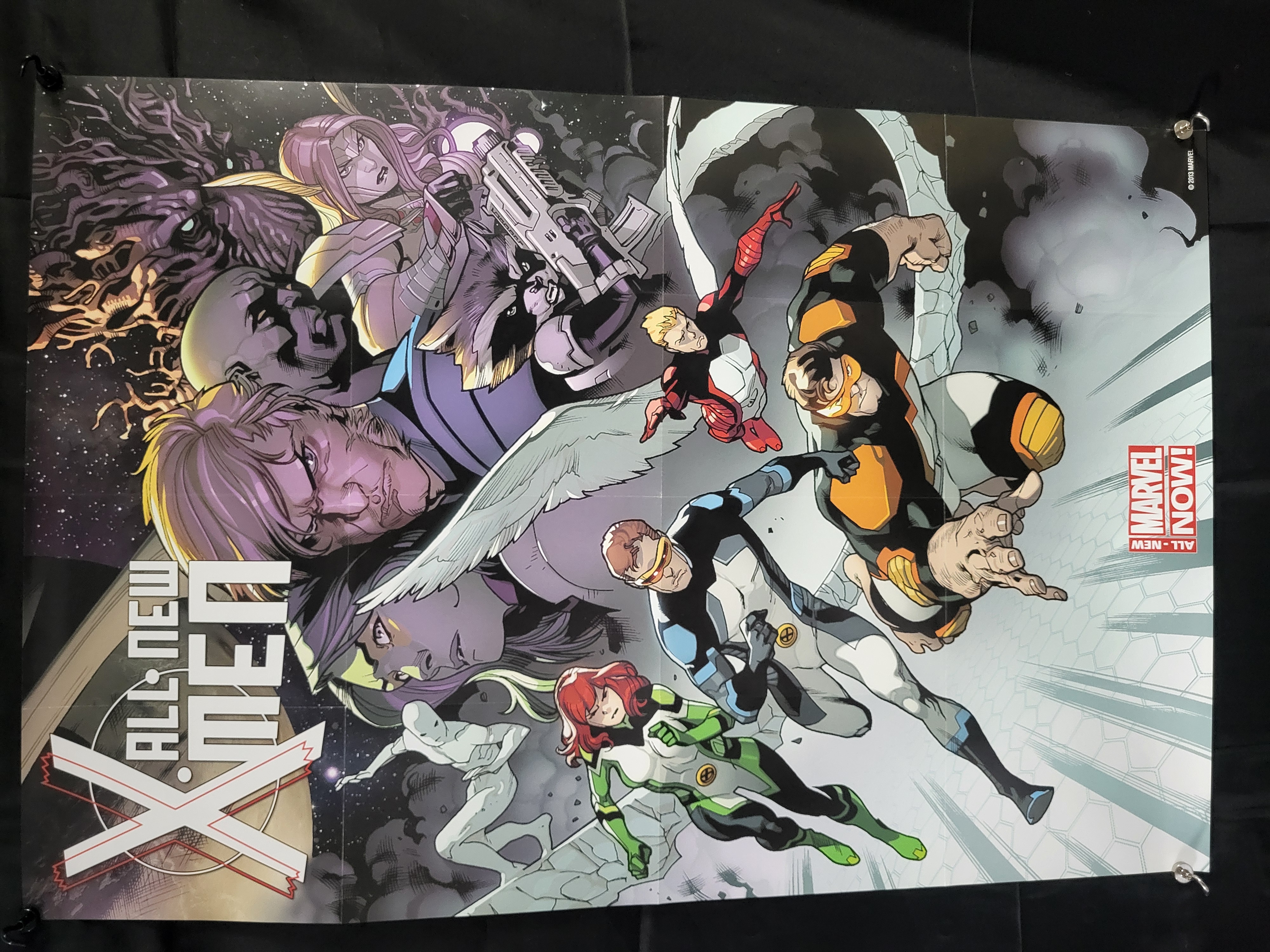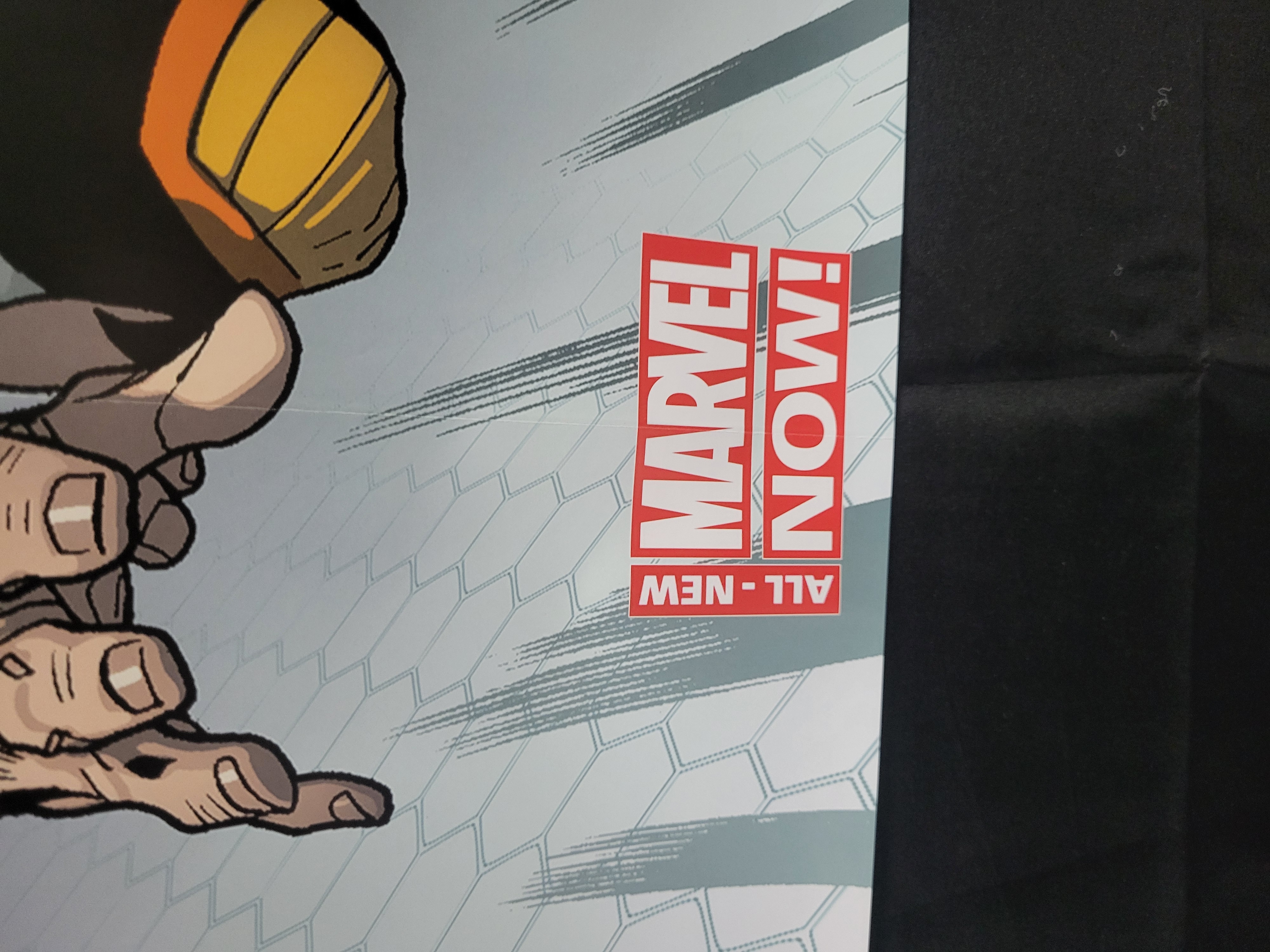 BID PER WHAT YOU SEE IN THE PHOTO, NOT THE AI GENERATED TITLES AND DESCRIPTIONS! A color promotional poster for Marvel Comics’ All-New X-Men series, dated 2013. The printed paper item features a dynamic character montage including the time-displaced original five X-Men (Cyclops, Jean Grey, Beast, Iceman, and Angel) alongside members of the Guardians of the Galaxy (Star-Lord, Gamora, Drax, Rocket Raccoon, and Groot). The poster was produced to advertise the All-New Marvel Now! branding initiative. It displays the All-New X-Men title logo in the lower left and the red All-New Marvel Now! logo on the right. A copyright notice reading © 2013 MARVEL is printed in the upper right corner.