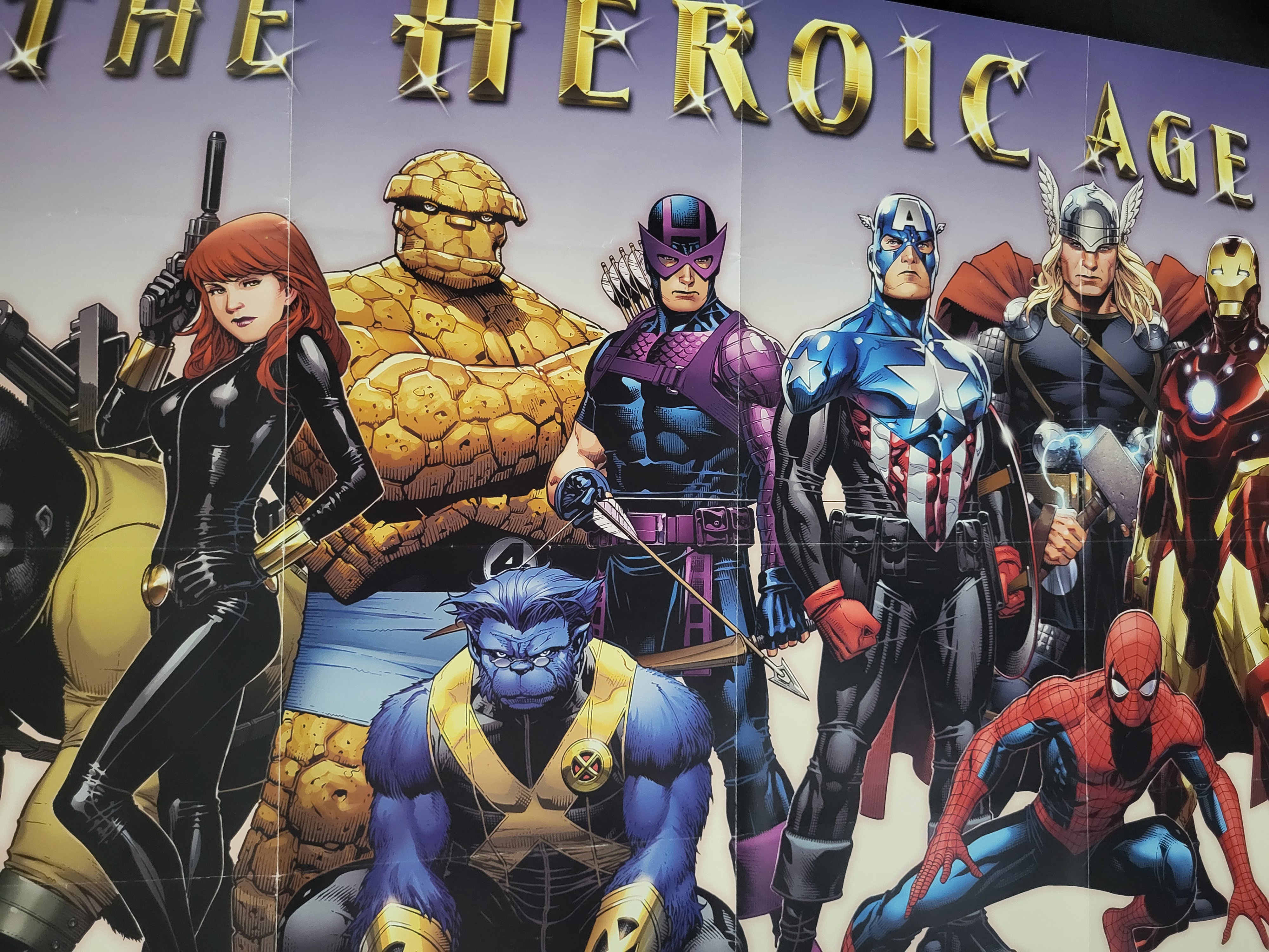BID PER WHAT YOU SEE IN THE PHOTO, NOT THE AI GENERATED TITLES AND DESCRIPTIONS! A promotional Marvel Comics poster for the 2010 event titled The Heroic Age, featuring artwork by Jim Cheung. The full-color illustration depicts a group of Marvel superheroes including Captain America, Iron Man, Thor, Spider-Man, Black Widow, The Thing, Beast, Hawkeye, and Gorilla-Man. The title is displayed in stylized gold lettering across the top. The Marvel logo and a 2010 copyright notice are located in the bottom left corner. The item is printed on paper and was originally distributed as a folded insert.