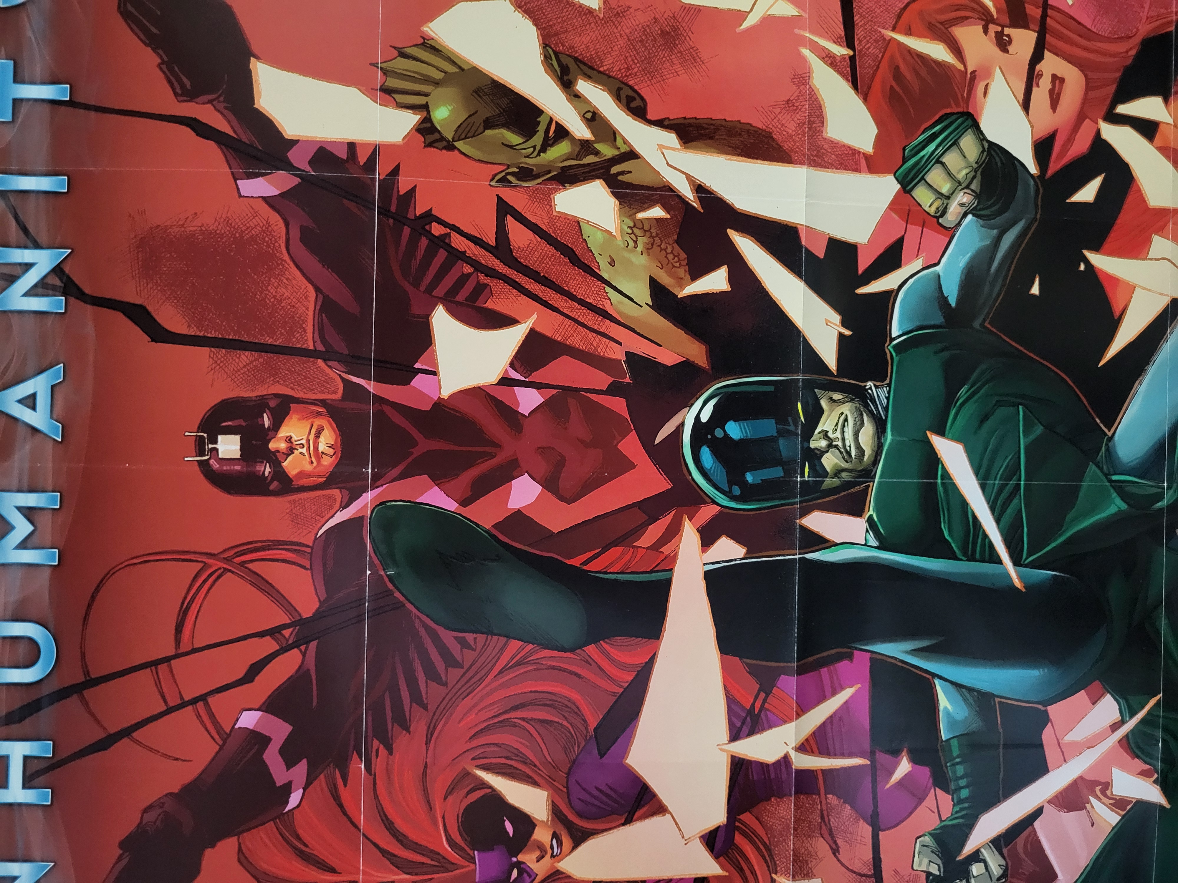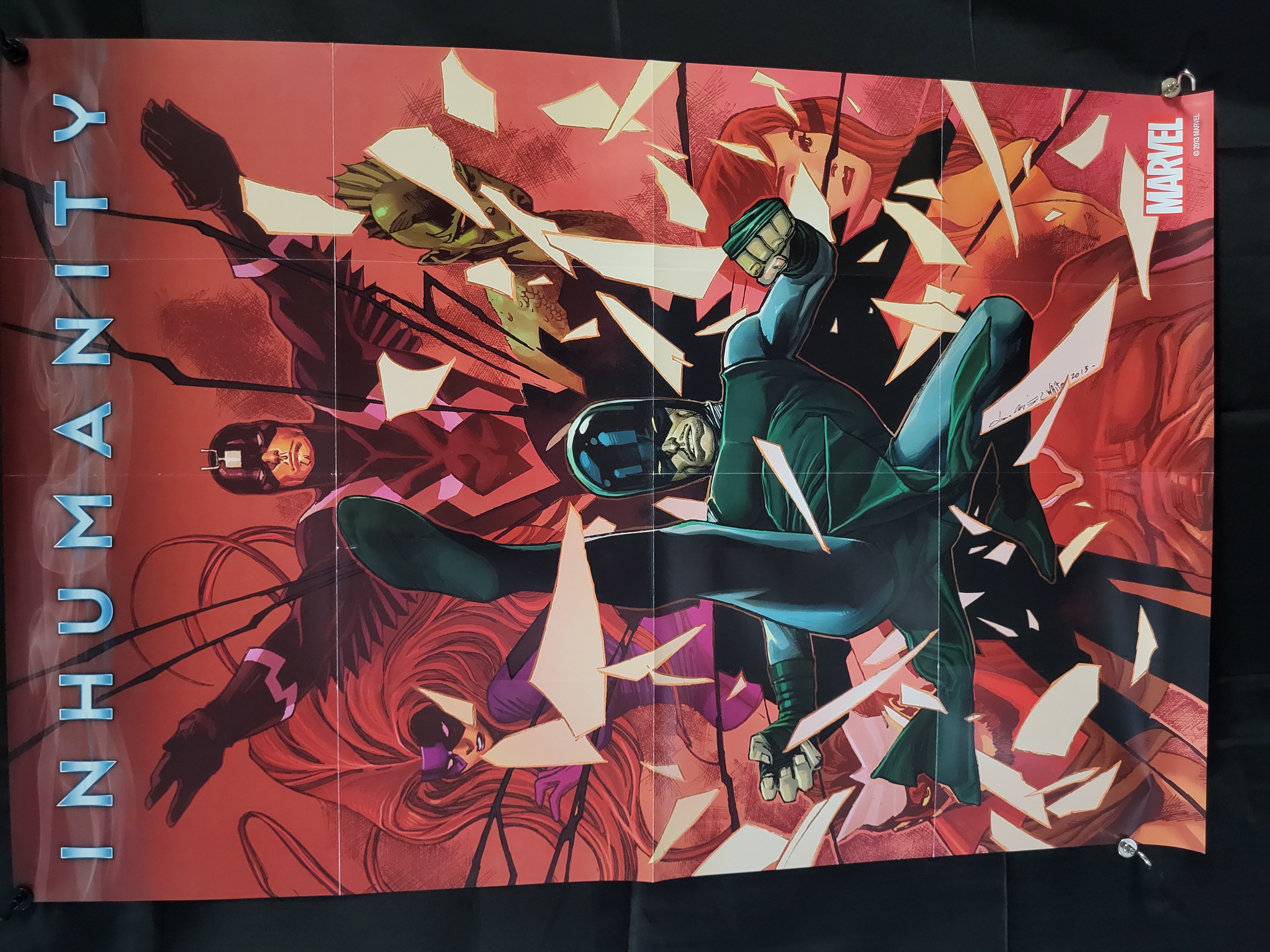 BID PER WHAT YOU SEE IN THE PHOTO, NOT THE AI GENERATED TITLES AND DESCRIPTIONS! A Marvel Comics promotional poster for the 2013 Inhumanity event. The paper poster features stylized artwork depicting various Inhumans characters, including Black Bolt, Medusa, Karnak, and Triton, set against a red-toned background with a shattered glass motif. The text INHUMANITY is printed vertically along the left side. The Marvel logo and a 2013 copyright notice are located in the upper right corner. An artist signature and the date 2013 are visible in the center-right area.