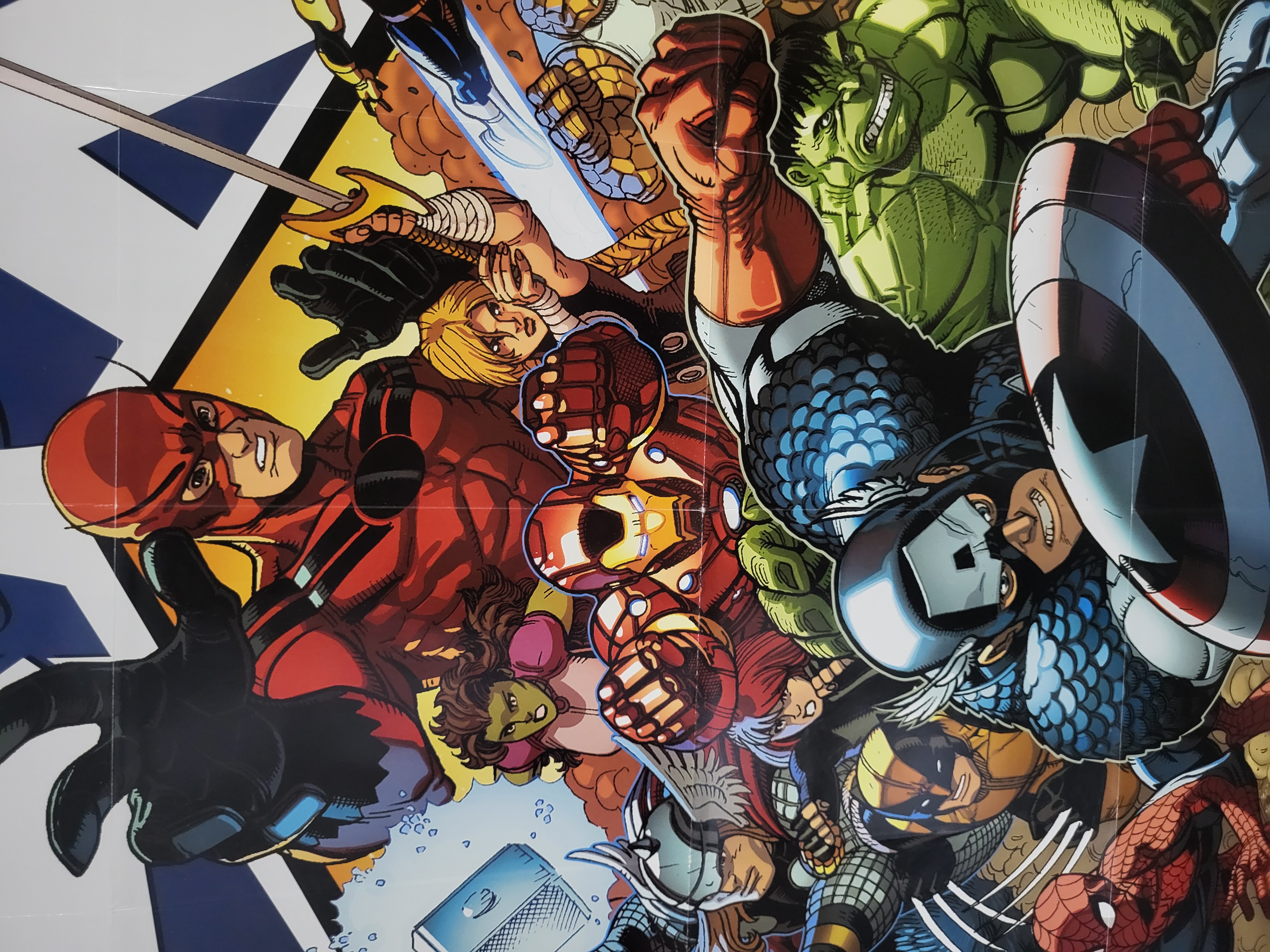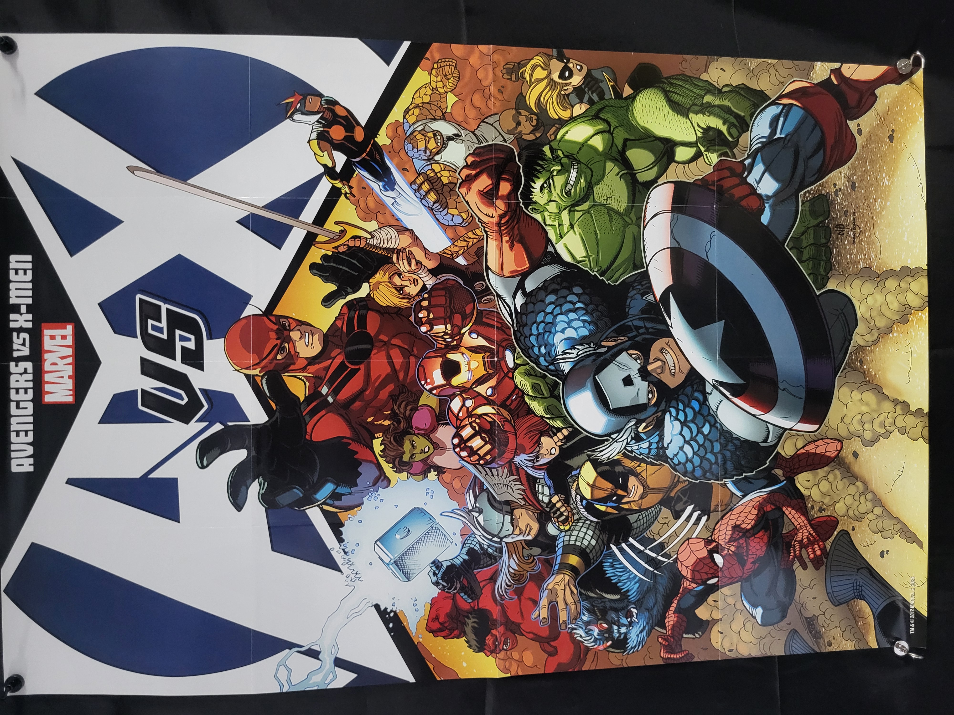 BID PER WHAT YOU SEE IN THE PHOTO, NOT THE AI GENERATED TITLES AND DESCRIPTIONS! A 2012 Marvel Avengers vs X-Men promotional poster featuring artwork by Nick Bradshaw. The illustration depicts various Marvel Universe characters including Captain America, Iron Man, the Hulk, Wolverine, Spider-Man, and Thor. The characters are positioned in front of large, overlapping A and X emblems. The Avengers vs X-Men title and Marvel logo are printed on the left side. The lower right corner includes the inscription TM and copyright 2012 MARVEL. The poster is printed on paper.