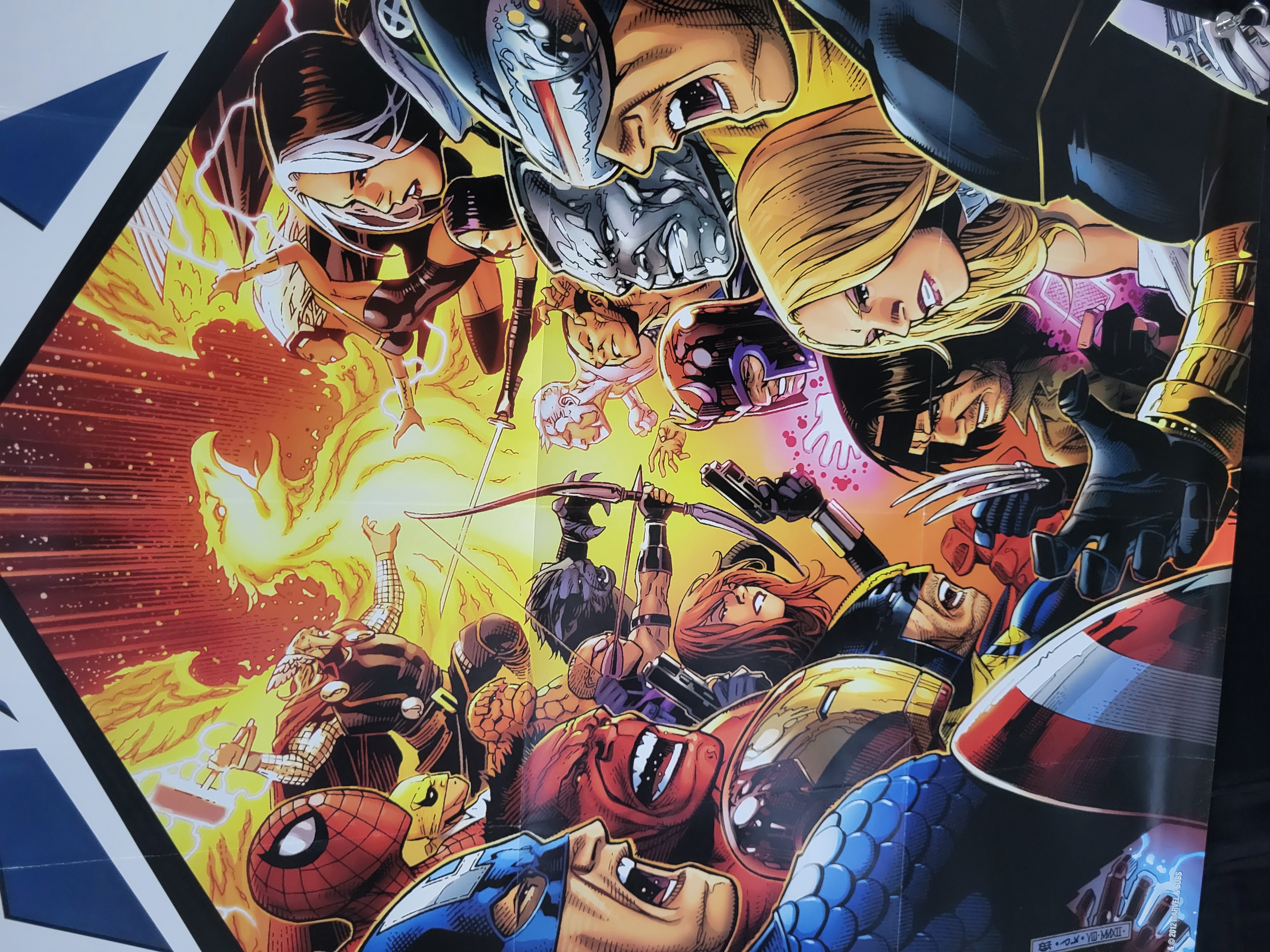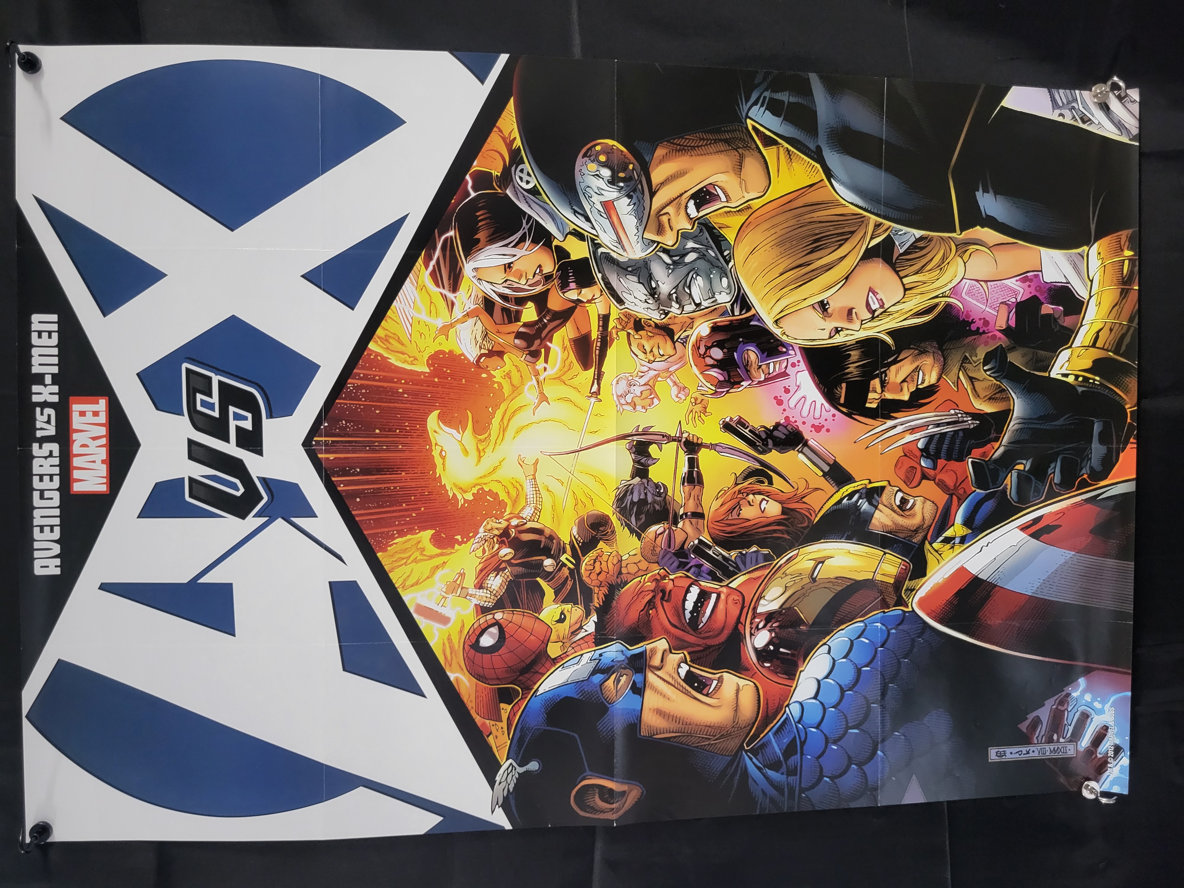 BID PER WHAT YOU SEE IN THE PHOTO, NOT THE AI GENERATED TITLES AND DESCRIPTIONS! A 2012 Marvel Comics promotional poster for the Avengers vs. X-Men crossover event. The artwork, signed in the plate by artist John Romita Jr. and dated VII-MMXII, depicts a battle between members of both teams, including Captain America, Cyclops, Iron Man, Wolverine, and Spider-Man, centered around a glowing Phoenix Force motif. The left side of the poster displays a large stylized AX logo with the text AVENGERS VS X-MEN and a classic red Marvel logo. Copyright information at the bottom right reads TM and copyright 2012 MARVEL and SUBS. The poster is printed on paper.
