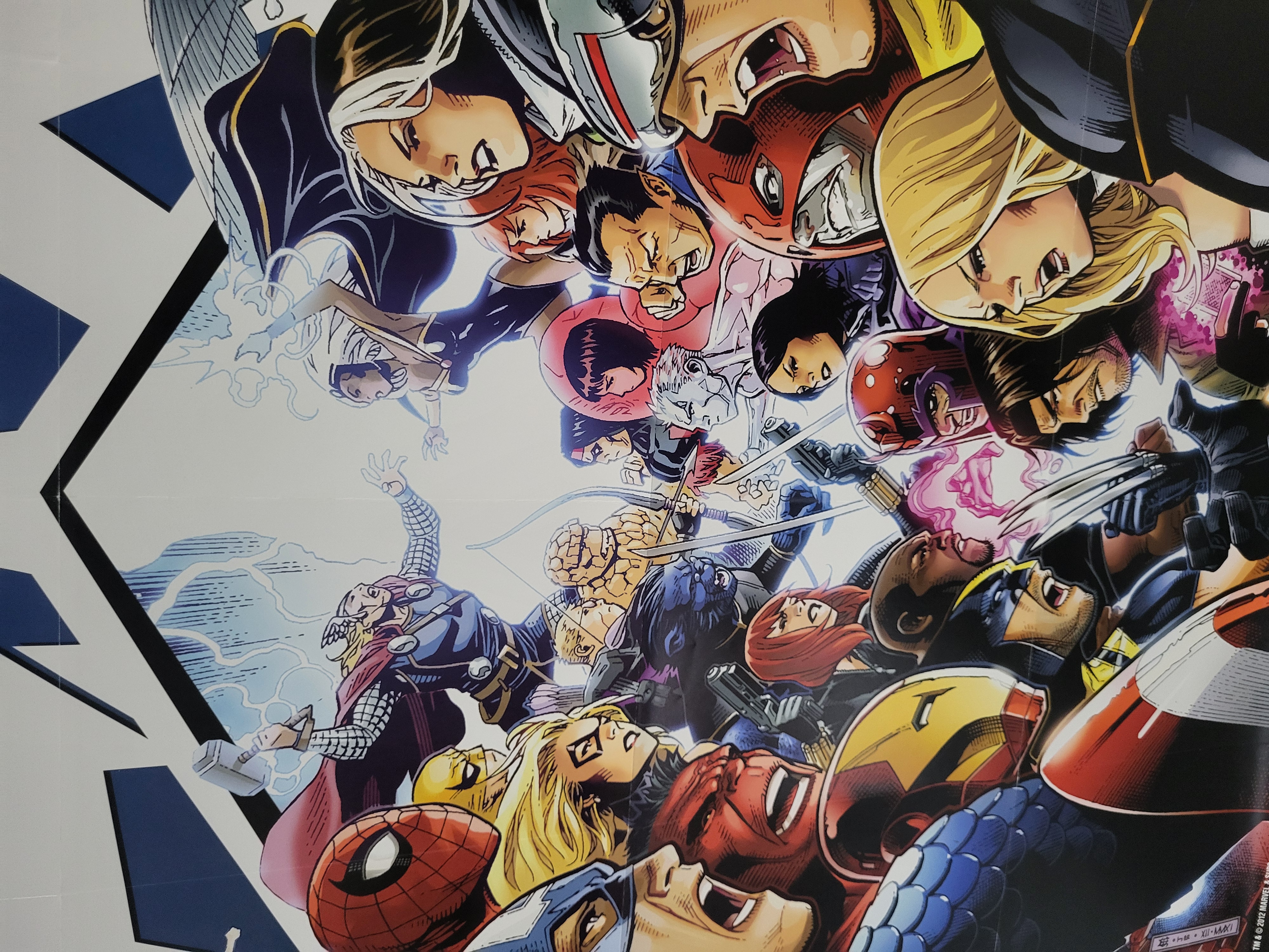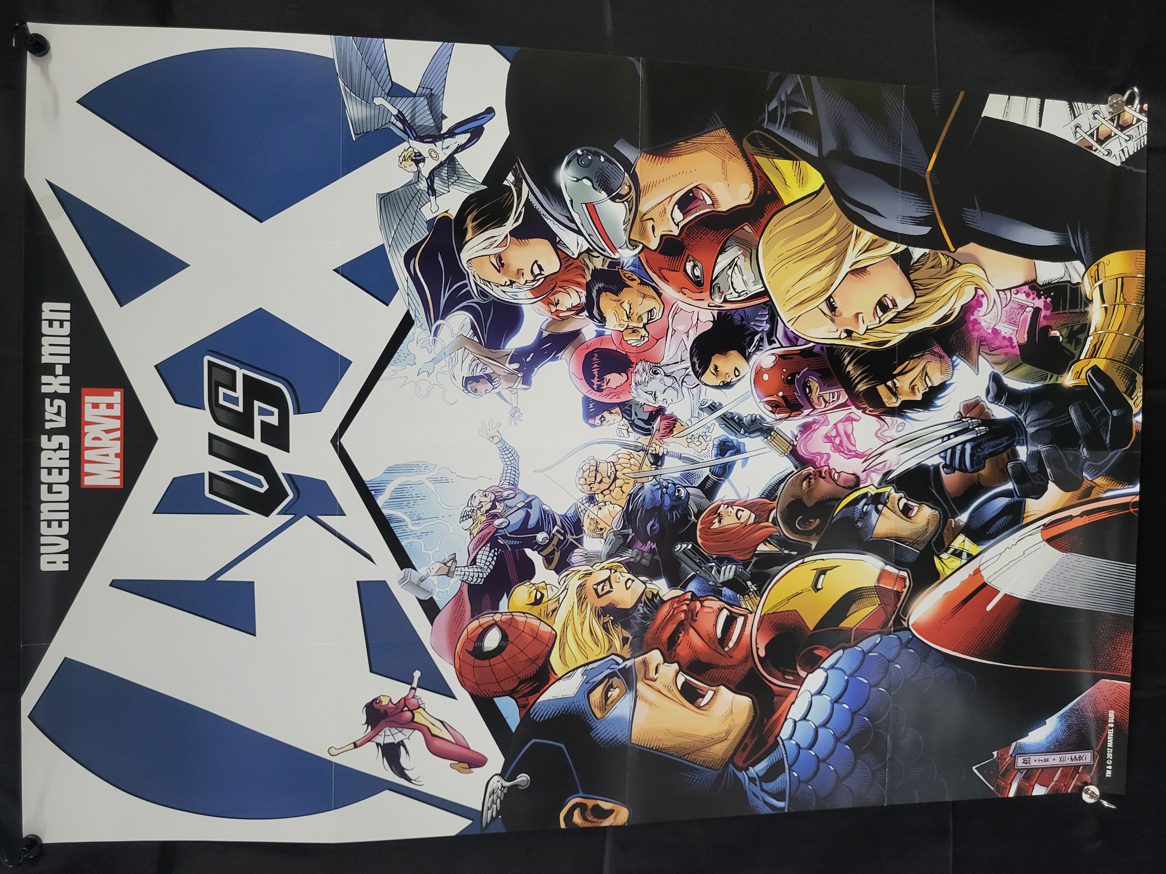 BID PER WHAT YOU SEE IN THE PHOTO, NOT THE AI GENERATED TITLES AND DESCRIPTIONS! A Marvel Avengers vs X-Men promotional paper poster featuring an illustrative composition of a confrontation between various characters from both teams. The artwork includes depictions of Captain America, Iron Man, Spider-Man, Thor, Wolverine, Cyclops, Rogue, and Emma Frost set against a large interlocking A and X background logo. The left side features the text AVENGERS vs X-MEN alongside the Marvel logo. Markings in the lower right corner include a copyright notice reading TM and 2012 MARVEL and SUBS and an artist date of XII-MMXI.