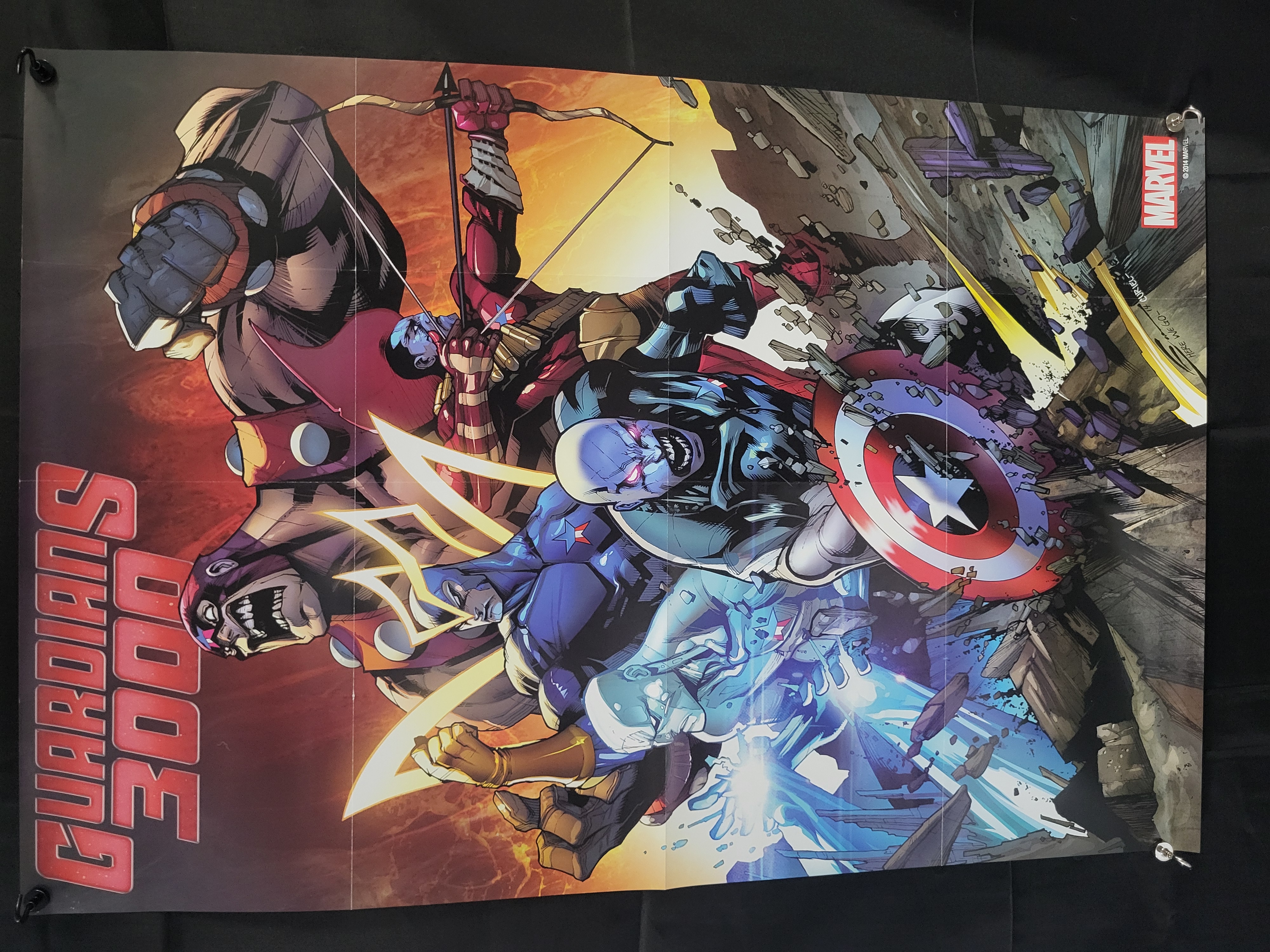 BID PER WHAT YOU SEE IN THE PHOTO, NOT THE AI GENERATED TITLES AND DESCRIPTIONS! This 2014 Marvel promotional poster features characters from the Guardians 3000 comic book series, including Yondu, Major Victory, Starhawk, Martinex, and Charlie-27. The artwork, attributed to artist Rafael Sandoval with colors by Curiel, depicts a dynamic battle scene in a modern comic book style. The large-format paper poster includes the vertical title Guardians 3000 on the left margin and the Marvel logo with a copyright notice reading © 2014 MARVEL in the upper-right corner. Artist signatures are visible in the lower-right field.