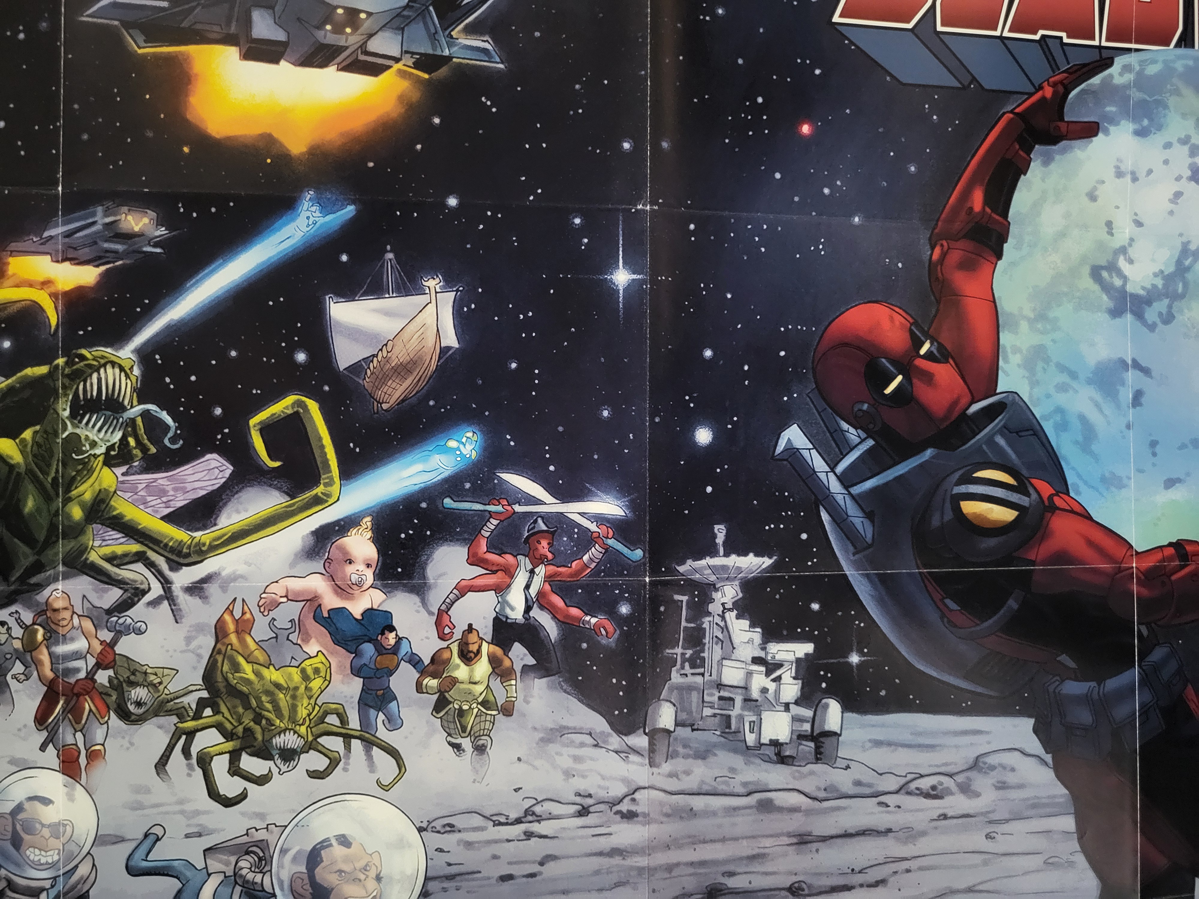 BID PER WHAT YOU SEE IN THE PHOTO, NOT THE AI GENERATED TITLES AND DESCRIPTIONS! This Marvel Comics promotional poster was issued in 2017 for Deadpool issue #30. The artwork, associated with Nathaniel Hawthorne, depicts the character Deadpool on a lunar surface with Earth in the background. The scene includes various extraterrestrial creatures, primates in spacesuits, a wizard, and spacecraft. The title DEADPOOL appears in red stylized text at the top right, while the MARVEL logo and a copyright notice for 2017 are located at the bottom left. The item is printed on paper and shows vertical and horizontal fold lines indicating it was likely a magazine or comic book insert.