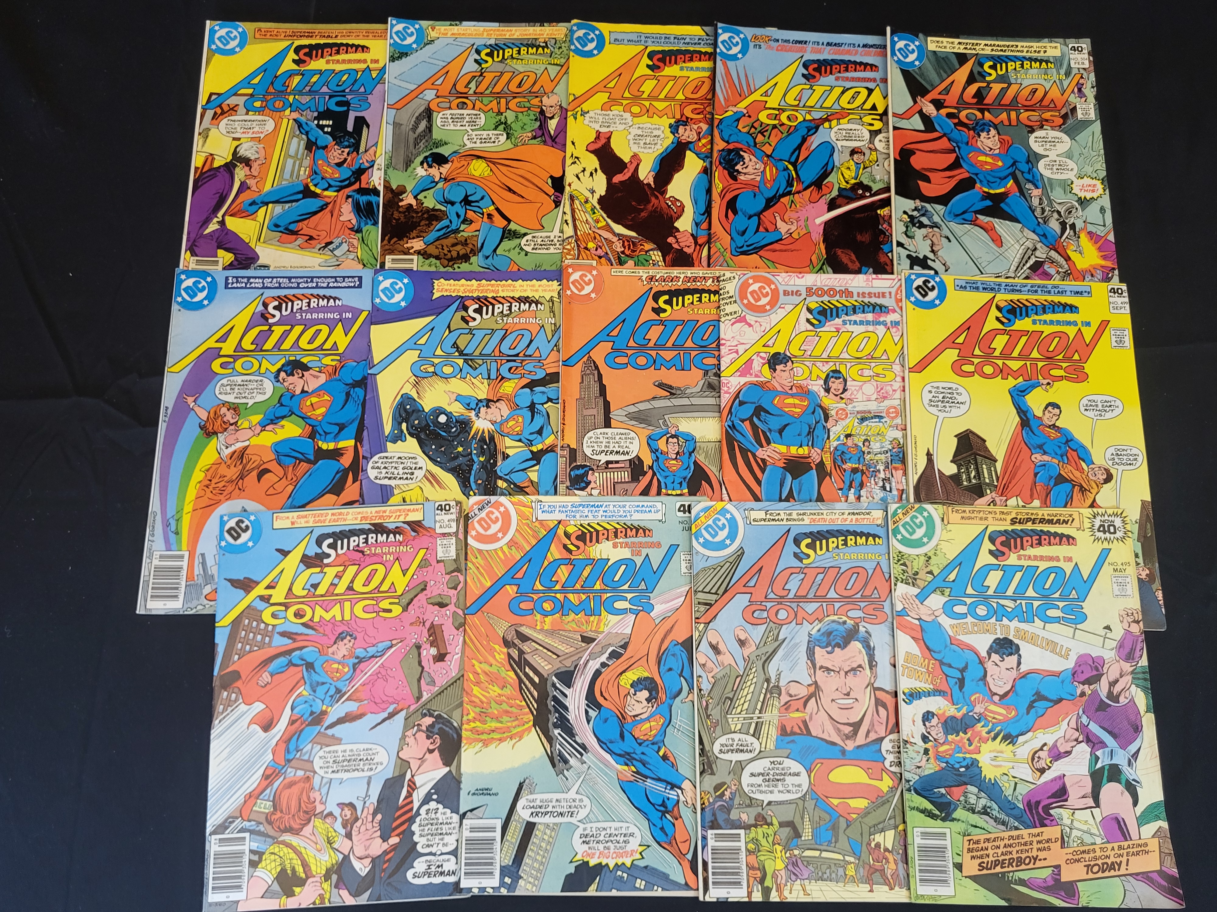 BID PER WHAT YOU SEE IN THE PHOTO, NOT THE AI GENERATED TITLES AND DESCRIPTIONS! A collection of vintage DC comic books from the late 1970s Bronze Age era, featuring various issues of Action Comics starring Superman. The group includes issues 491, 492, 493, 495, 496, 497, 498, 499, 500, 501, 503, and 504. Issue 500 is identified as the 500th anniversary issue. Each comic is in its original paper format with staple-bound construction and features cover illustrations with DC Comics branding. The issues represent the late 1970s publication period.