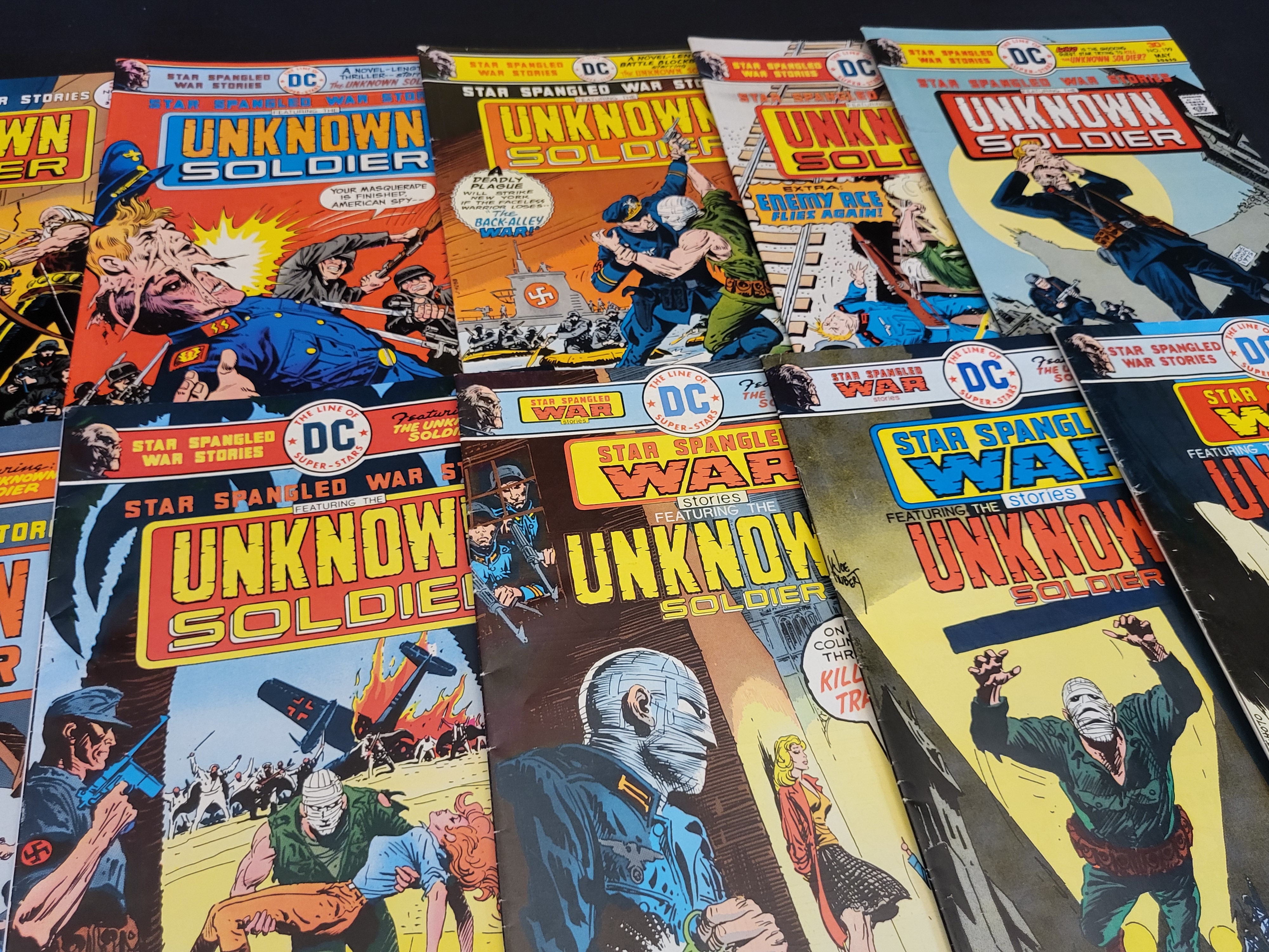 BID PER WHAT YOU SEE IN THE PHOTO, NOT THE AI GENERATED TITLES AND DESCRIPTIONS! A collection of vintage DC Comics Star Spangled War Stories featuring the Unknown Soldier, dating from the Bronze Age of comic books in the early 1970s. This group includes various issues such as No. 192, No. 199, and No. 201. The covers feature dynamic war-themed illustrations primarily by artist Joe Kubert. Each comic displays the characteristic DC circular logos, issue numbers, and original cover prices ranging from 20 to 30 cents. The books are printed on paper and represent the period where the title transitioned to focus on the Unknown Soldier character.