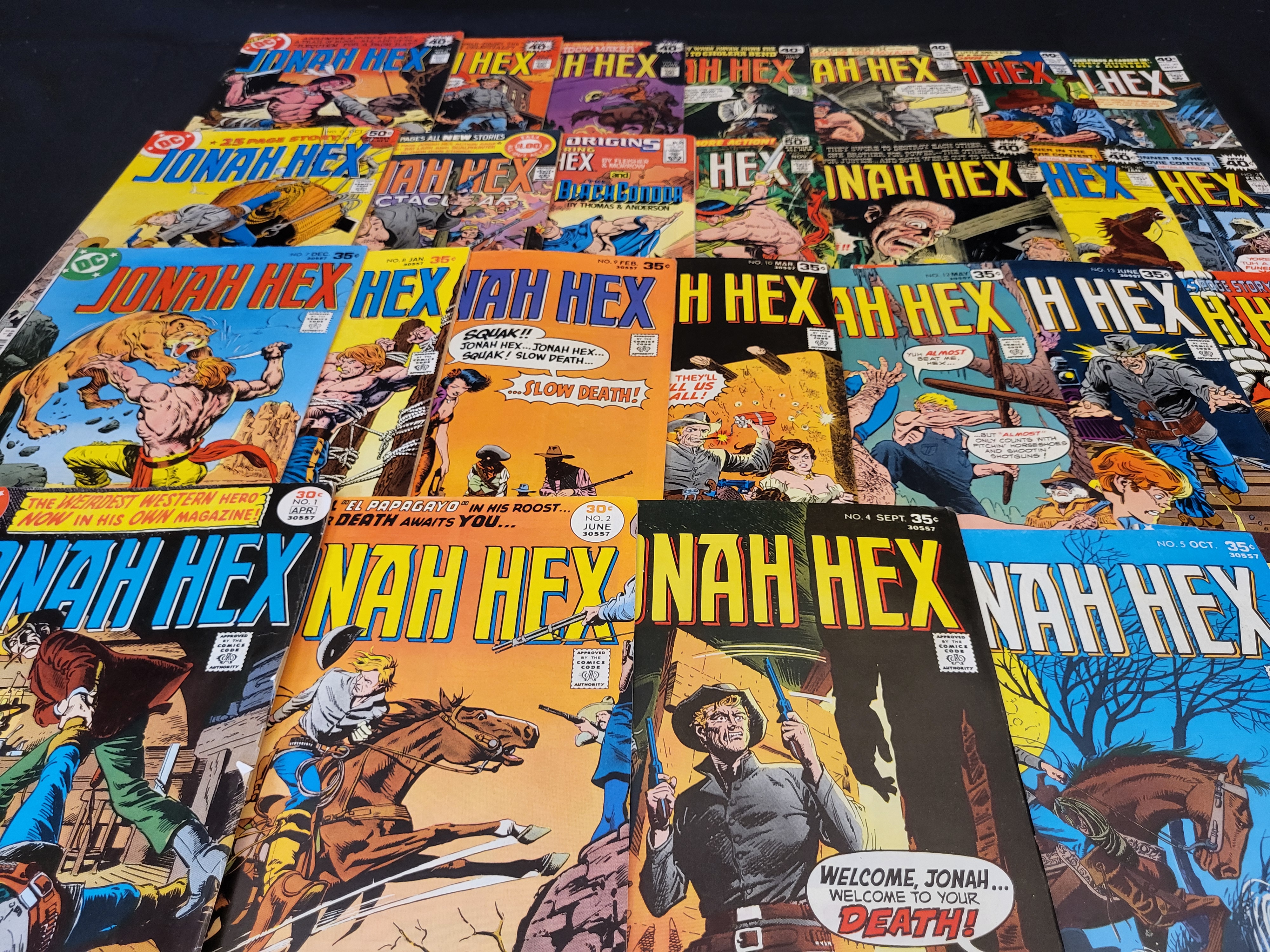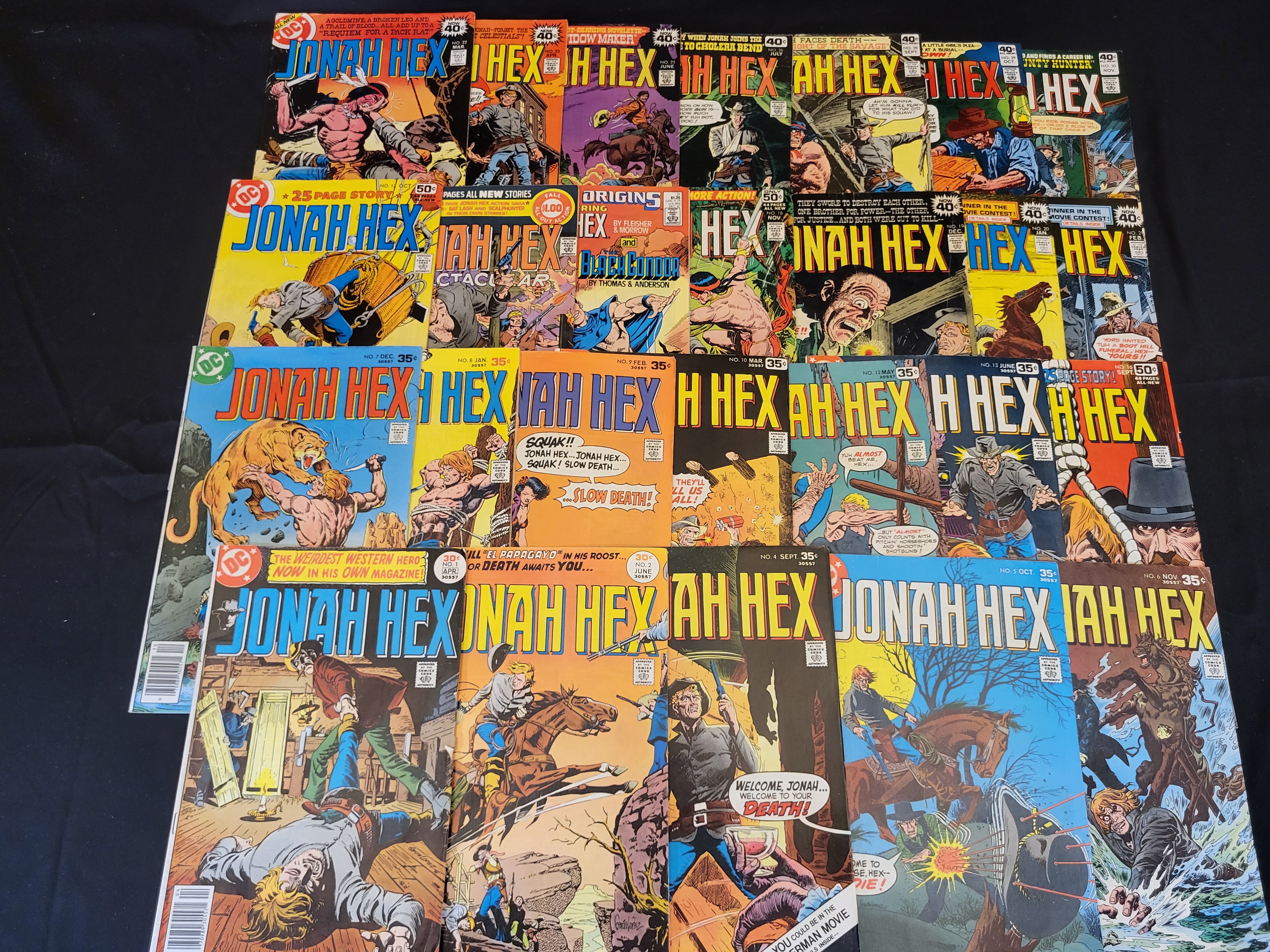 BID PER WHAT YOU SEE IN THE PHOTO, NOT THE AI GENERATED TITLES AND DESCRIPTIONS! This collection of DC Comics Jonah Hex comic books primarily dates from the late 1970s to the early 1980s. The group consists of various early and consecutive issues including number 1 (April 1977), 2, 4, 5, 6, 7, 8, 9, 10, 12, 13, 16, 17, 19, 21, 22, 23, 27, 29, 30, 31, 32, 39, and 40. These staple-bound paper issues feature cover art by various illustrators and display original price points ranging from 30 cents to 50 cents. The issues are part of the Bronze Age of comics and feature the titular Western character.