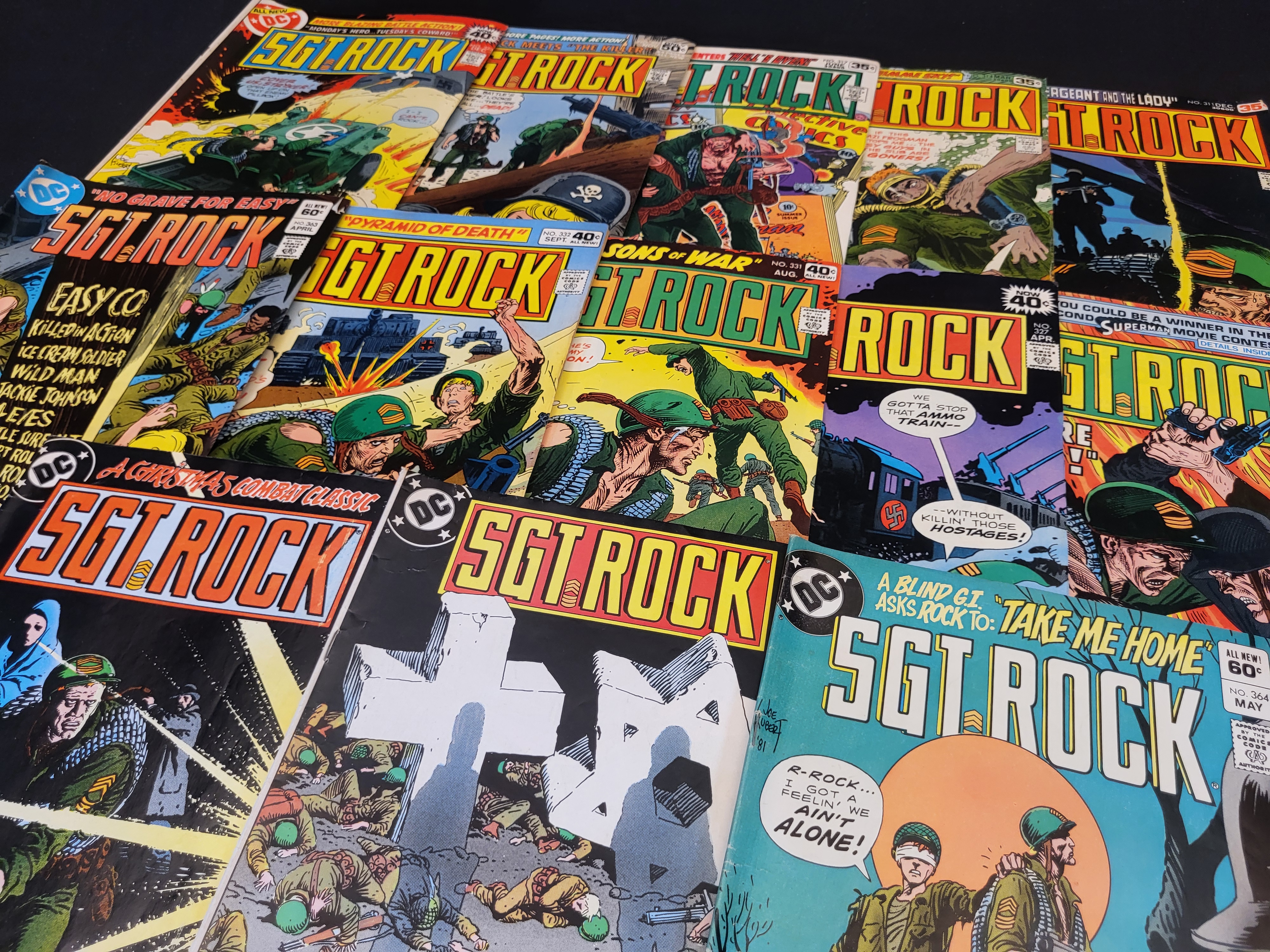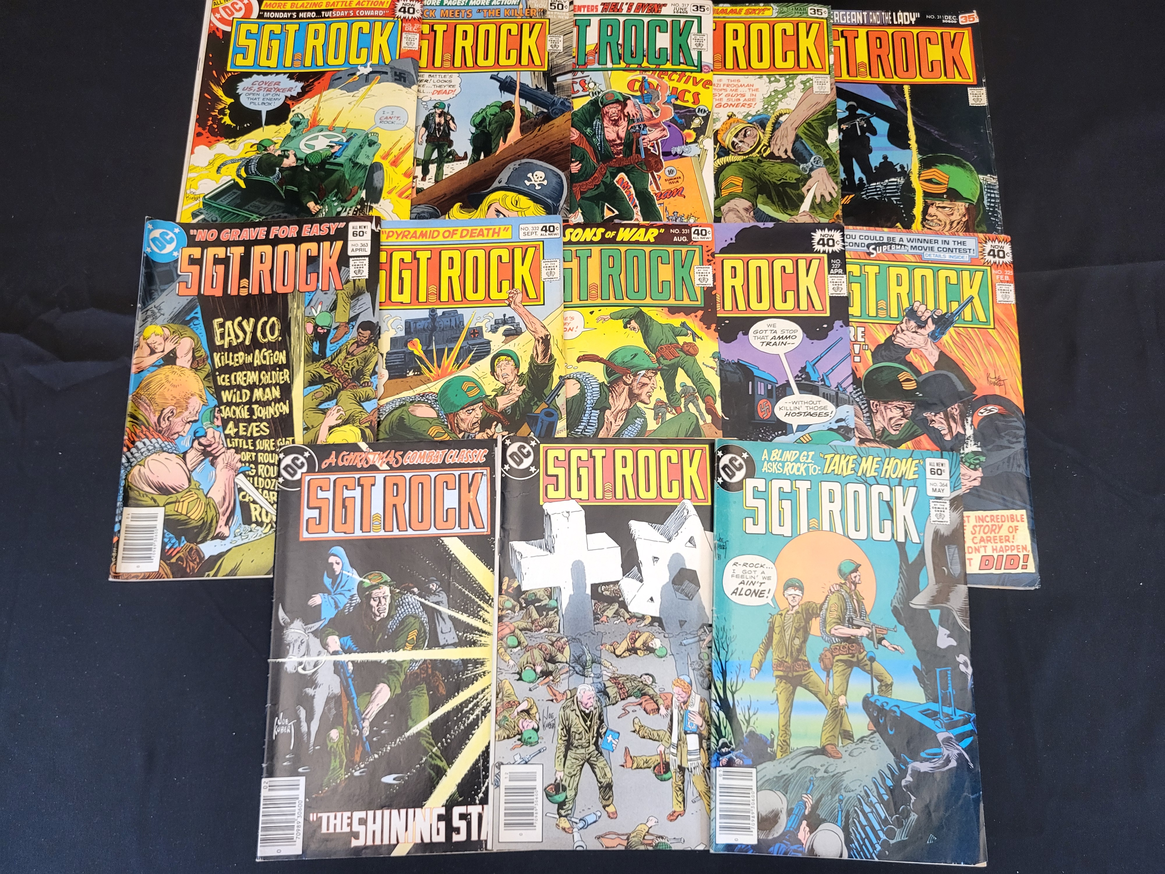BID PER WHAT YOU SEE IN THE PHOTO, NOT THE AI GENERATED TITLES AND DESCRIPTIONS! A collection of DC Comics Sgt. Rock comic books dating from the late 1970s to the early 1980s. This group of Bronze Age issues features war-themed cover art, including work by Joe Kubert. The lot includes various issue numbers such as 311, 317, 325, 327, 331, 332, 363, and 364. These staple-bound paper publications show original cover prices ranging from 35 cents to 60 cents.