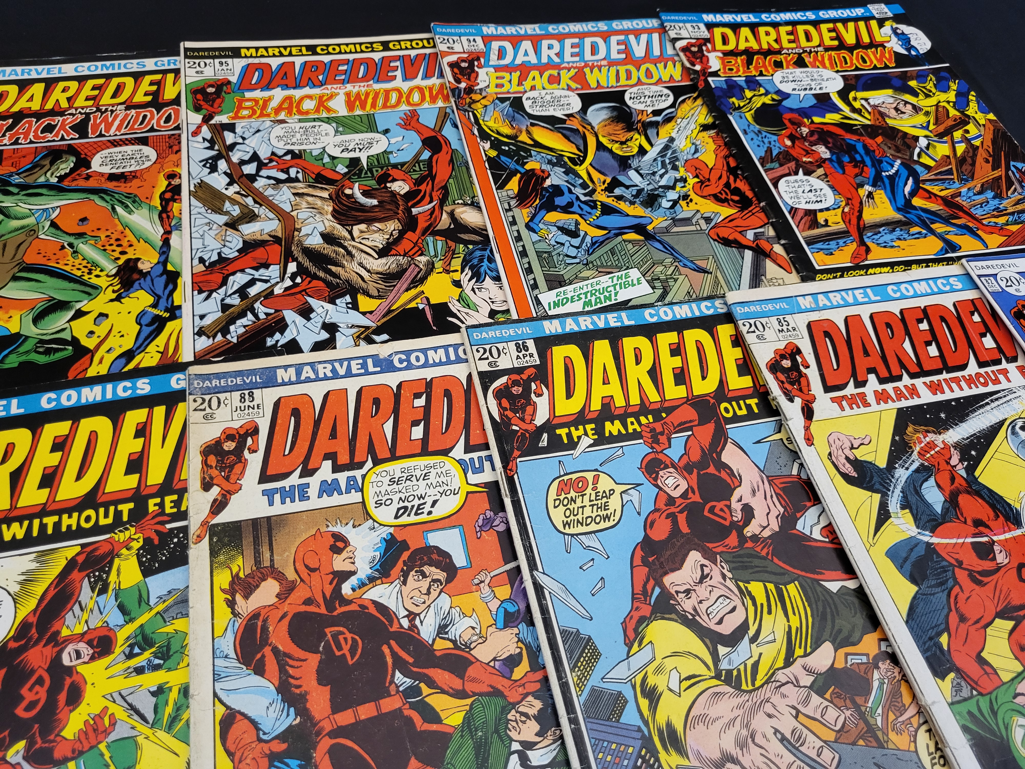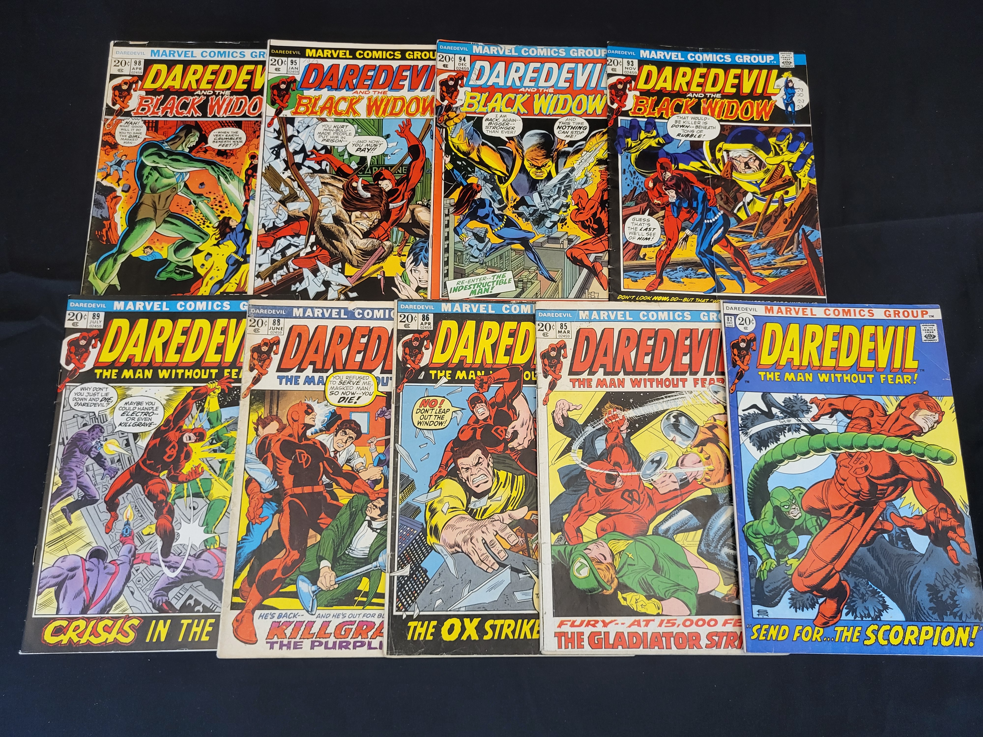 BID PER WHAT YOU SEE IN THE PHOTO, NOT THE AI GENERATED TITLES AND DESCRIPTIONS! A collection of vintage comic books published by the Marvel Comics Group featuring Daredevil and Daredevil and the Black Widow. These issues date from the early 1970s Bronze Age and include issue numbers 82, 85, 86, 88, 89, 93, 94, 95, and 98. The cover art depicts characters such as Daredevil, Black Widow, The Scorpion, The Gladiator, and The Ox. Each issue features a printed original price of 20 cents. The comics are presented in an ungraded state.