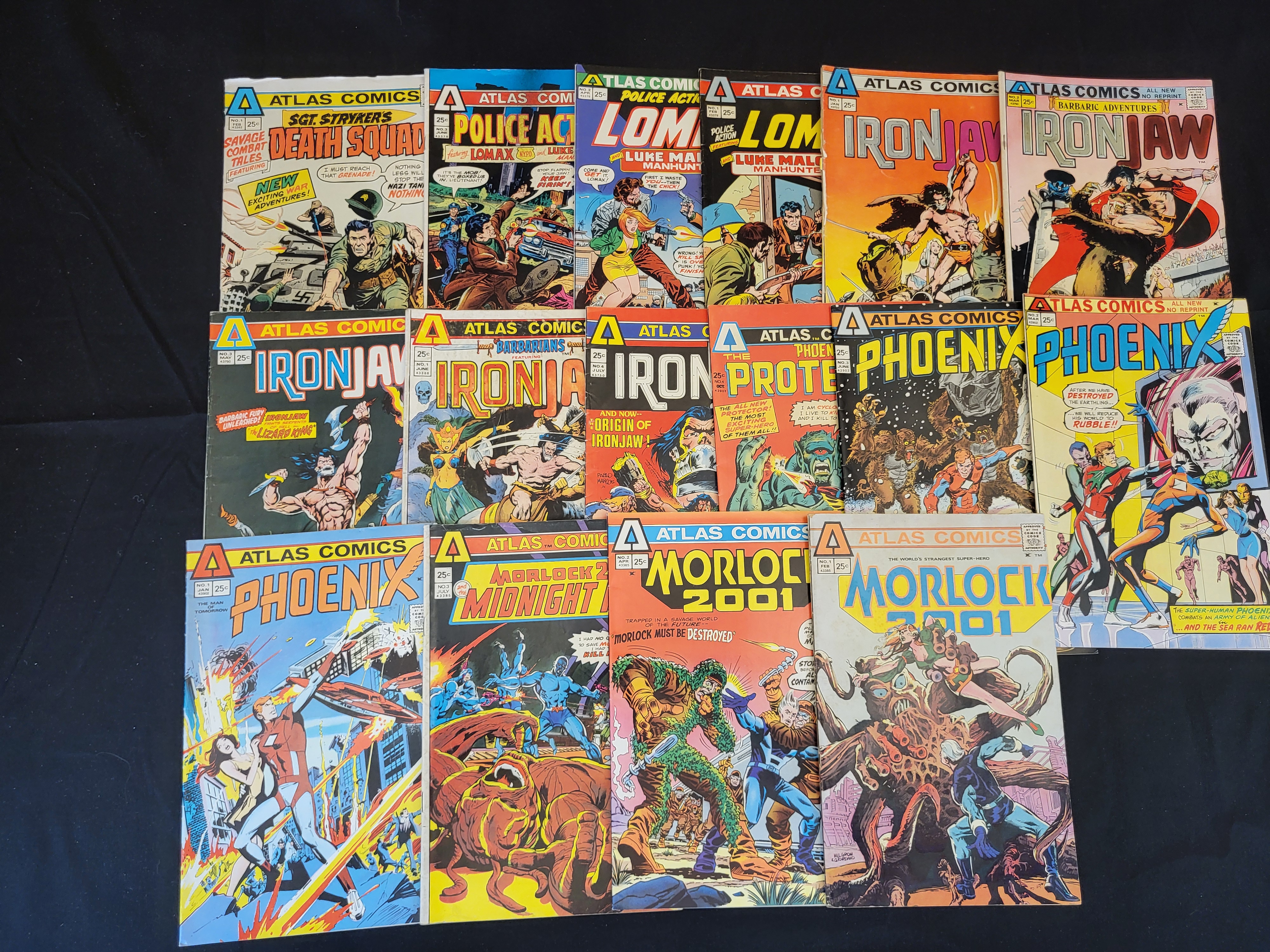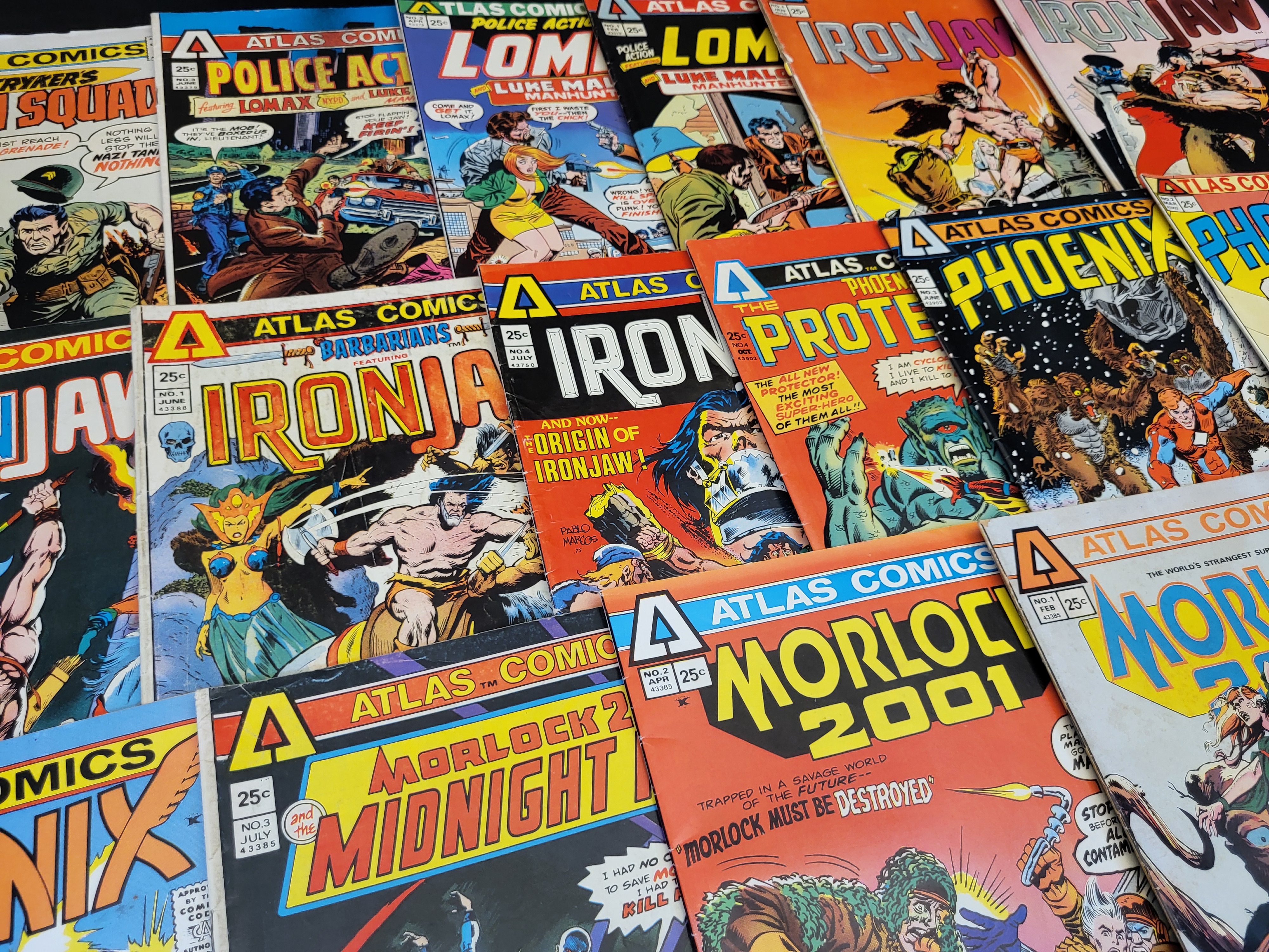 BID PER WHAT YOU SEE IN THE PHOTO, NOT THE AI GENERATED TITLES AND DESCRIPTIONS! A collection of Bronze Age comic books published by Atlas Comics during the Seaboard period, predominantly carrying 1975 publication dates. The group includes various titles such as Ironjaw, The Phoenix, Morlock 2001, Sgt. Stryker’s Death Squad, Police Action, and The Protector. These staple-bound issues feature 25-cent cover prices. The publications represent the short-lived line of comics produced by Seaboard Periodicals.
