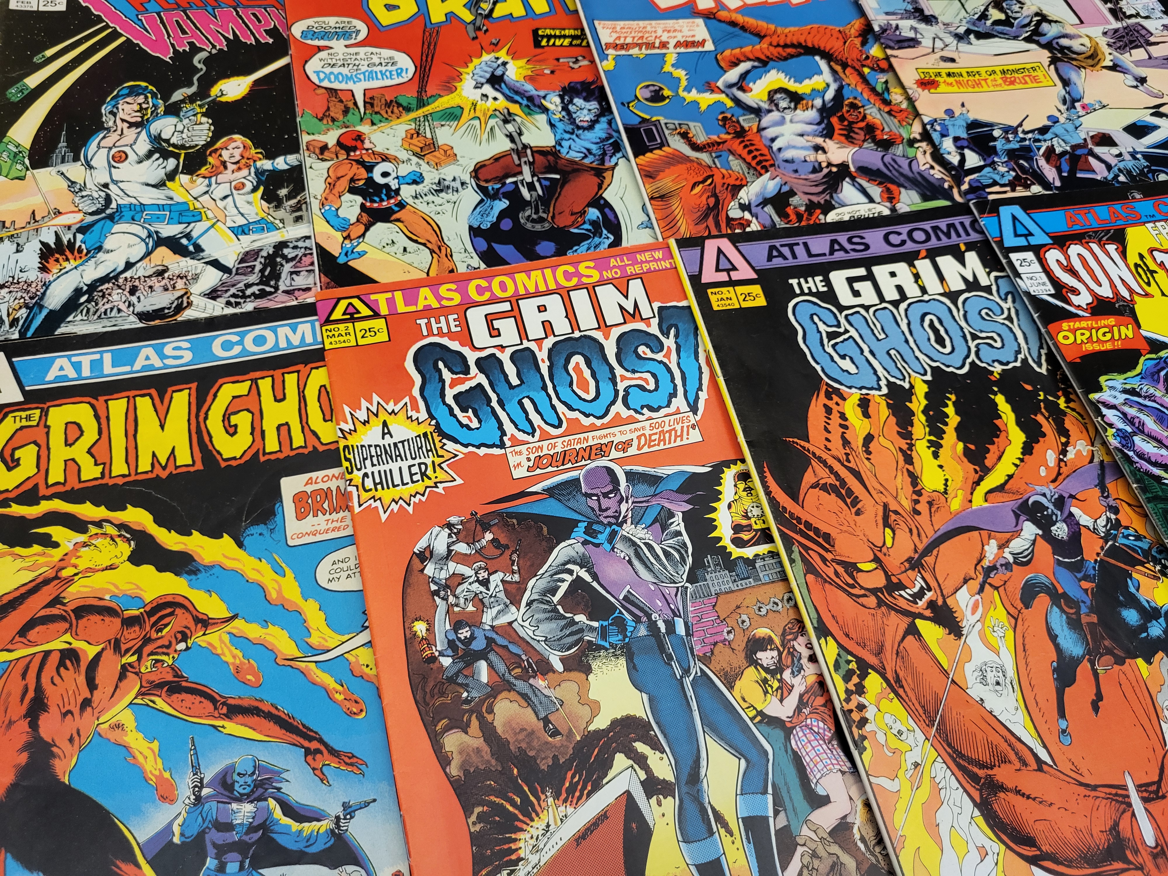 BID PER WHAT YOU SEE IN THE PHOTO, NOT THE AI GENERATED TITLES AND DESCRIPTIONS! A collection of vintage Bronze Age comic books published by Atlas Comics, also known as Seaboard Periodicals, circa 1975. The group includes various titles across the horror, fantasy, and science-fiction genres, specifically The Grim Ghost, The Brute, Planet of Vampires, Demon Hunter, and Fright featuring Son of Dracula. The collection features several number one origin issues. Each comic displays the original 25-cent cover price and the Atlas Comics logo. The books are constructed with color-illustrated covers and standard newsprint interiors.