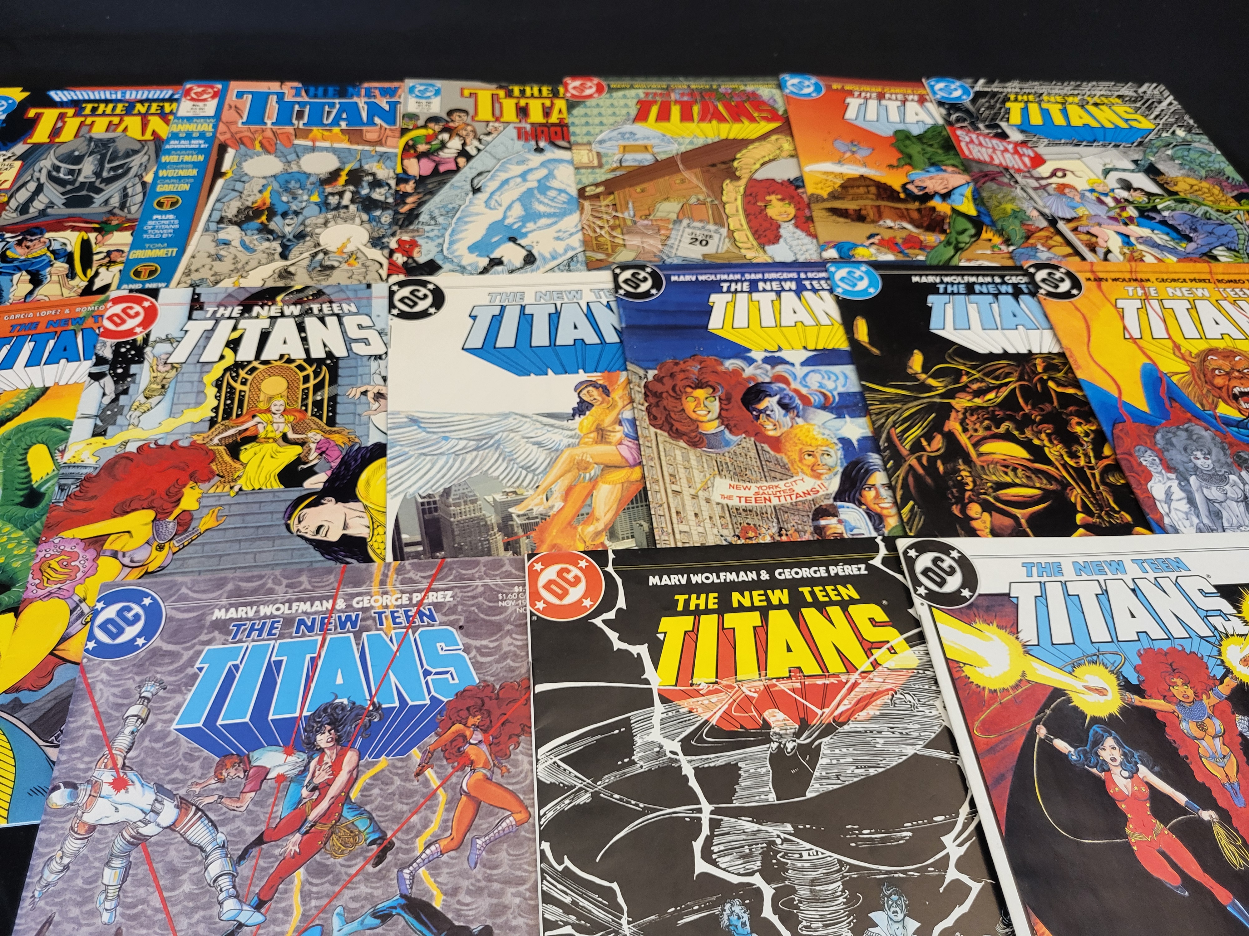 BID PER WHAT YOU SEE IN THE PHOTO, NOT THE AI GENERATED TITLES AND DESCRIPTIONS! A collection of vintage DC comic books from The New Teen Titans (Vol. 2) and The New Titans series. These printed paper collectibles feature artwork and storytelling by notable creators including Marv Wolfman, George Perez, and Dan Jurgens. The group includes various regular monthly issues and annuals dating from the mid-1980s to the early 1990s. Specific visible issues include The New Teen Titans number 1 (August 1984), number 3 (November 1984), and number 4 (January 1985), as well as The New Titans number 56, Annual number 5 (1989), and Annual number 7 (1991). The covers display diverse illustrations of the superhero ensemble and include original newsstand price markings.