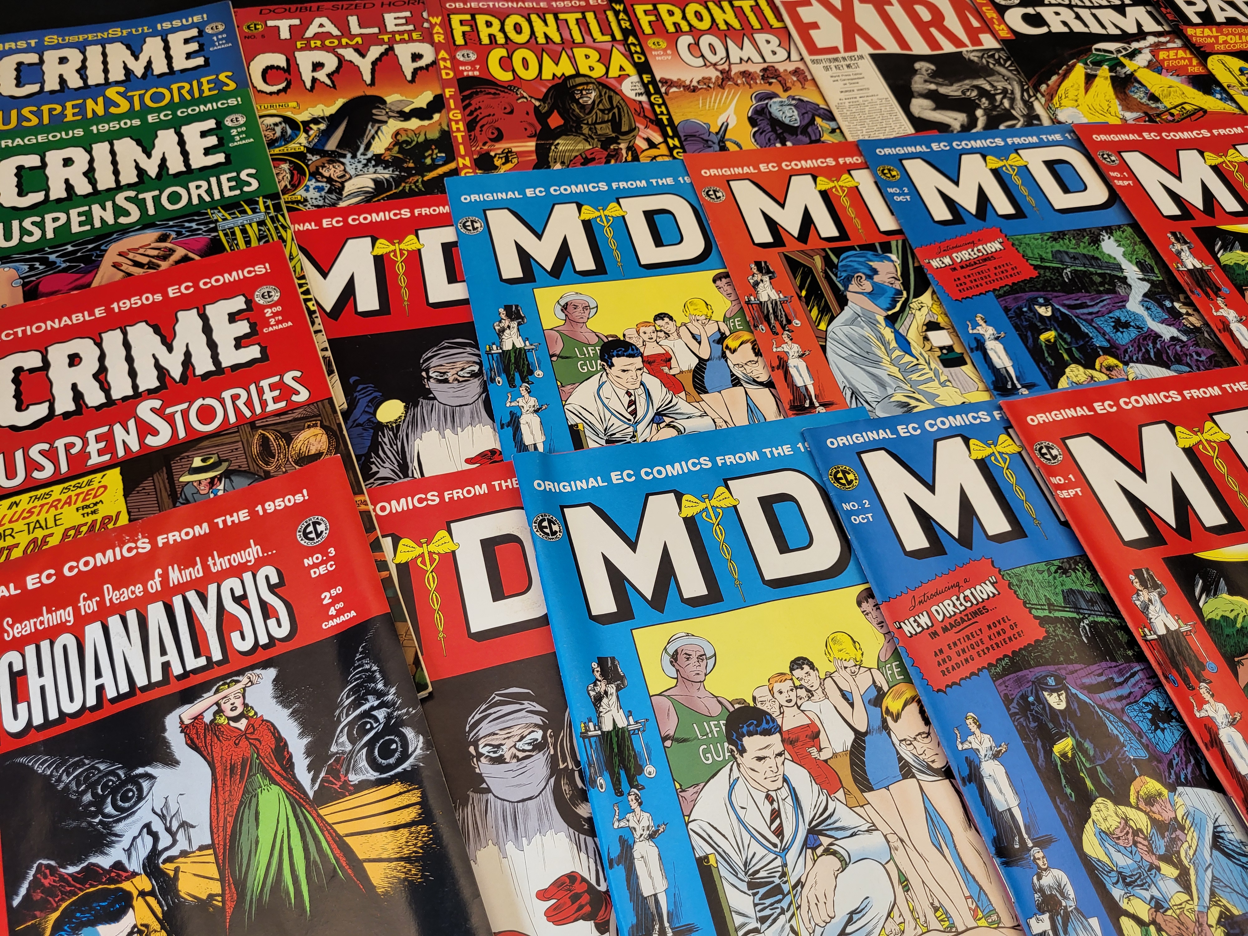 BID PER WHAT YOU SEE IN THE PHOTO, NOT THE AI GENERATED TITLES AND DESCRIPTIONS! A collection of contemporary softcover reprint comic books featuring various titles from the Entertaining Comics library. The assortment includes issues from series such as M.D., Crime SuspenStories, Psychoanalysis, Frontline Combat, Tales from the Crypt, Shock SuspenStories, Extra!, War Against Crime, and Crime Patrol. These publications are staple-bound and feature the EC logo along with modern headers identifying the contents as original stories from the 1940s and 1950s. The covers display genre-driven artwork characteristic of pre-Comics Code era horror, crime, war, and medical drama anthologies. Modern price markings in both US and Canadian currency are printed on the front covers.