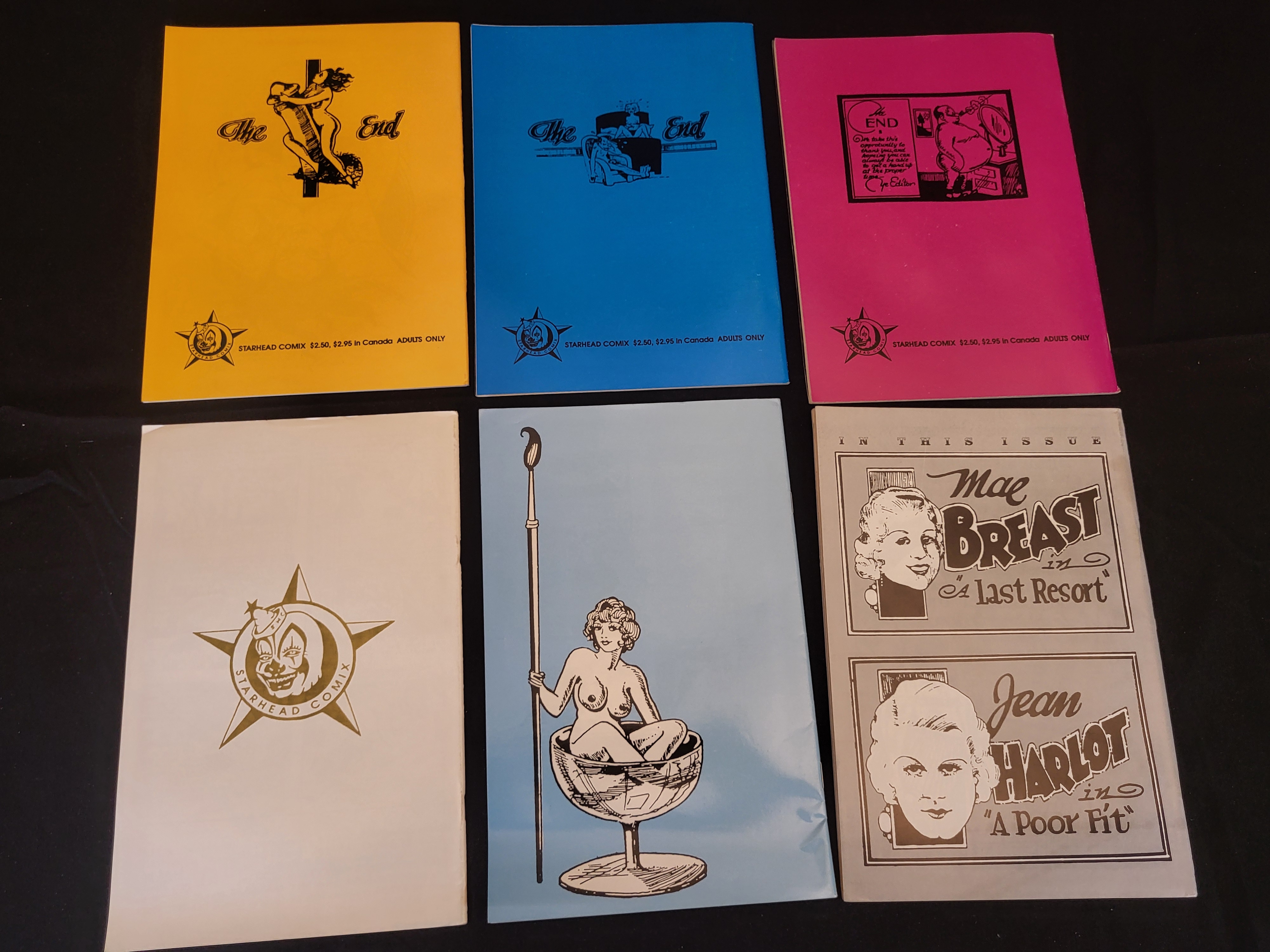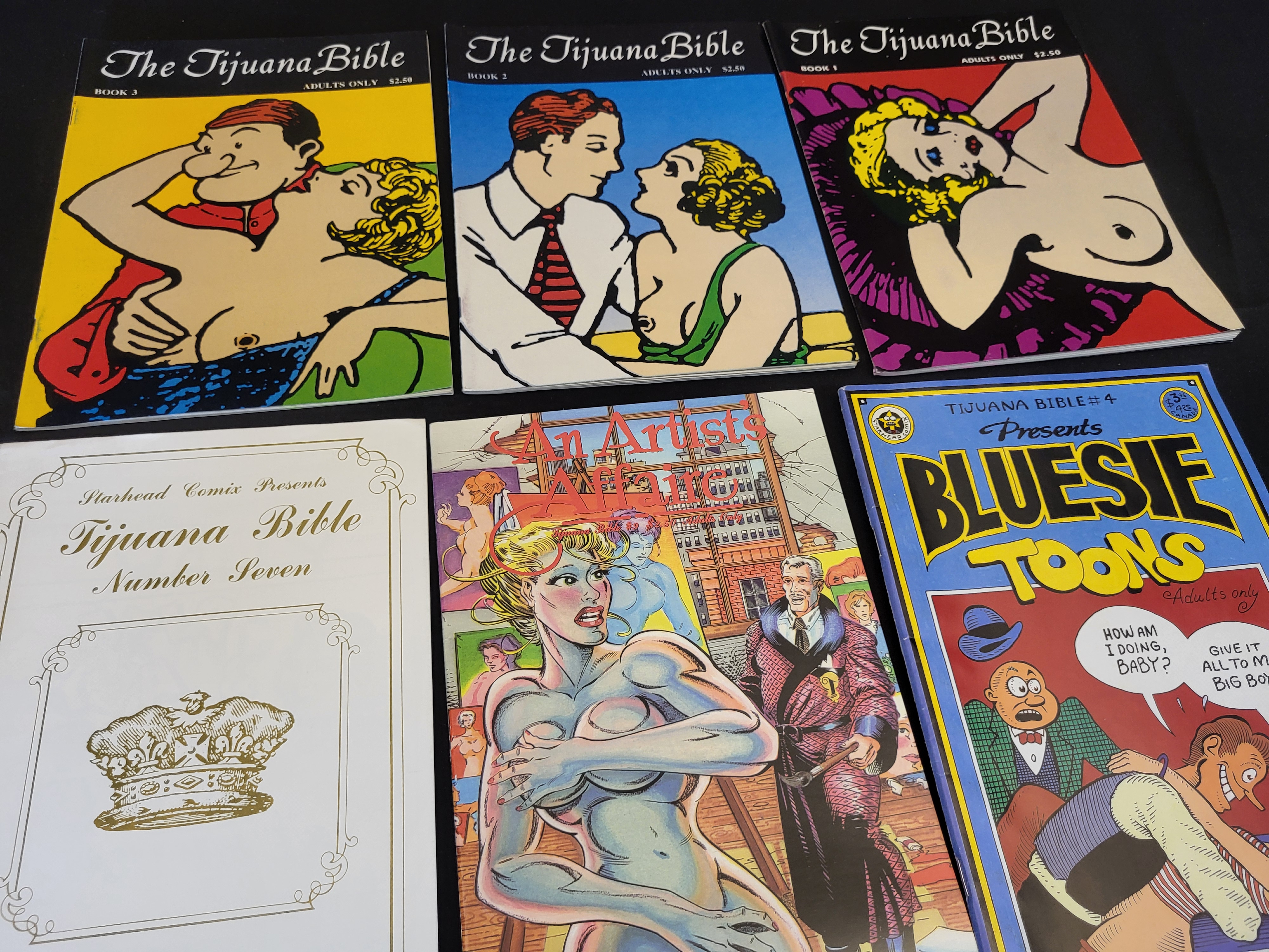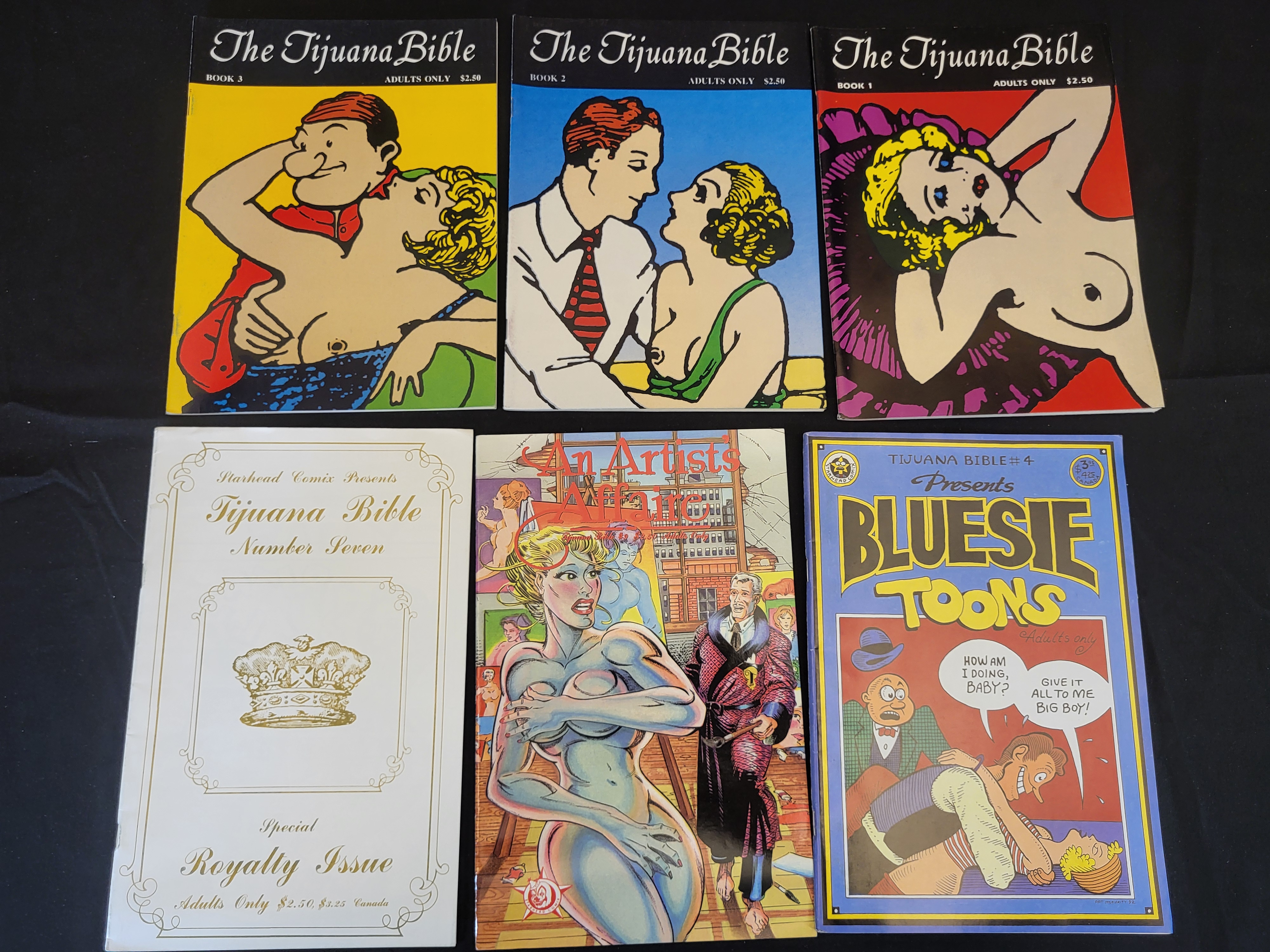 BID PER WHAT YOU SEE IN THE PHOTO, NOT THE AI GENERATED TITLES AND DESCRIPTIONS! A collection of adult-themed comic books published by Starhead Comix, consisting of modern reprints of historical Tijuana Bibles. The group includes The Tijuana Bible Books 1, 2, and 3; Tijuana Bible Number Seven: Special Royalty Issue; An Artist’s Affair; and Tijuana Bible #4: Bluesie Toons. These staple-bound publications feature cartoon illustrations of the human form and adult situations in the style of mid-20th-century underground erotica. Each cover is marked for Adults Only and displays original retail prices ranging from $2.50 to $3.25. The back covers feature the Starhead Comix logo and various thematic illustrations, including references to Mae Breast and Jean Harlot.