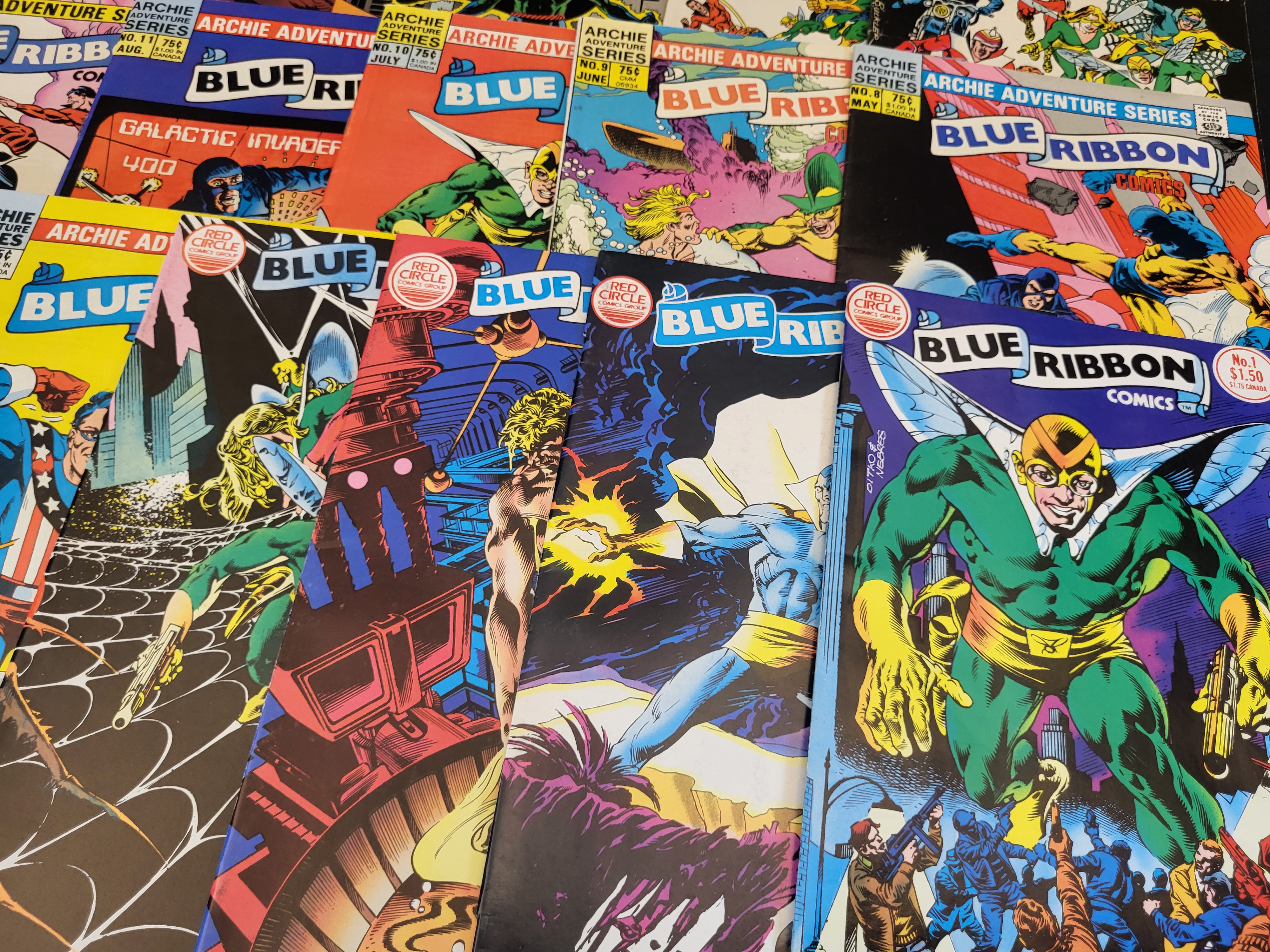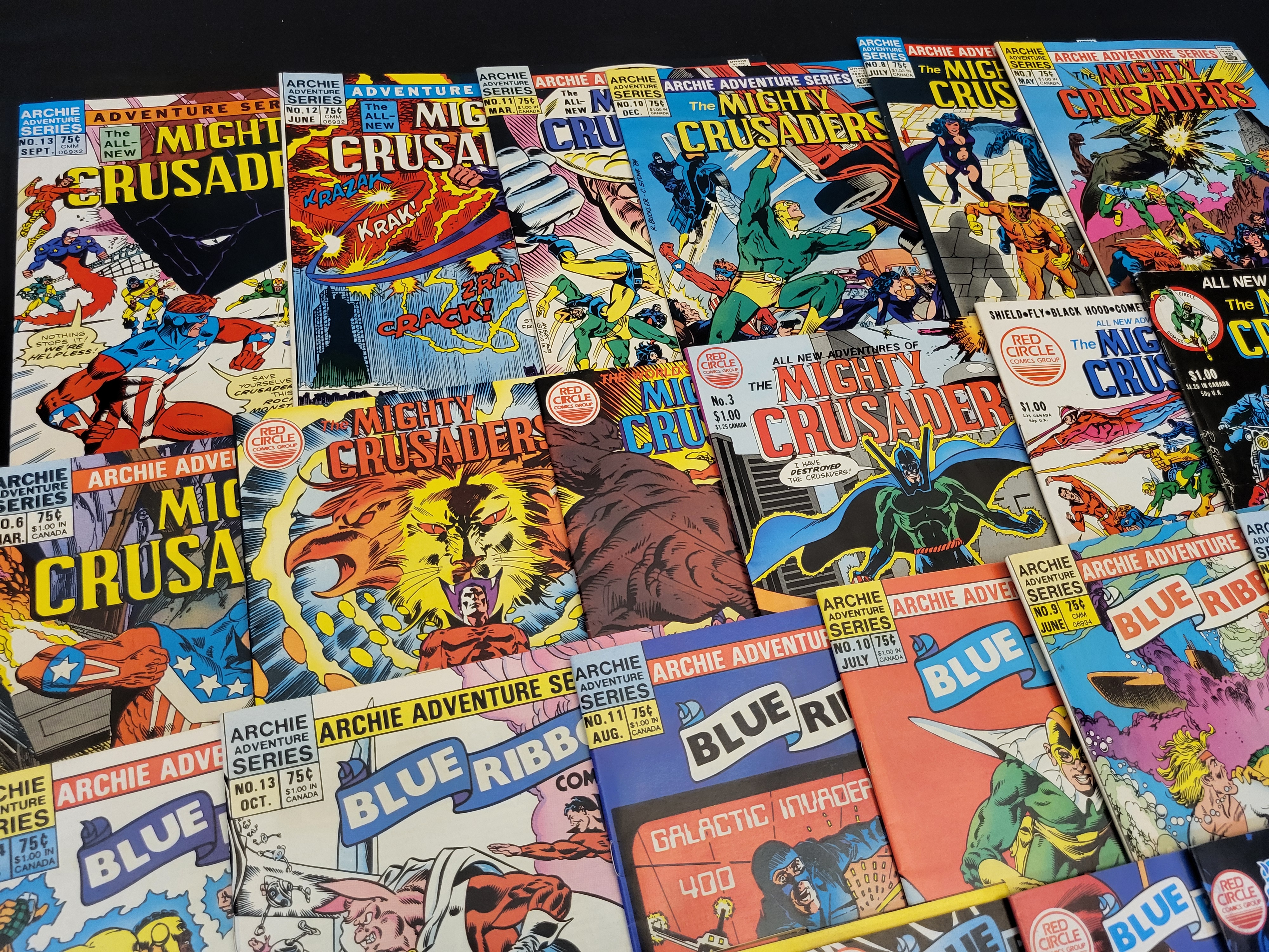 BID PER WHAT YOU SEE IN THE PHOTO, NOT THE AI GENERATED TITLES AND DESCRIPTIONS! A collection of vintage superhero comic books from the 1980s Archie Adventure Series and Red Circle Comics Group. The group primarily features various issues from The Mighty Crusaders and Blue Ribbon Comics titles. Individual issues show cover prices ranging from $0.75 to $1.50. Visible issue numbers include The Mighty Crusaders No. 1, No. 3, No. 6, No. 7, No. 8, No. 10, No. 11, No. 12, and No. 13, as well as Blue Ribbon Comics No. 1, No. 5, No. 6, No. 7, No. 8, No. 9, No. 10, No. 11, No. 13, and No. 14. The cover art depicts various superheroes including The Shield, Fly-Girl, The Black Hood, The Fox, and Lancelot Strong in dynamic action scenes. The items are presented unbagged and unboarded.