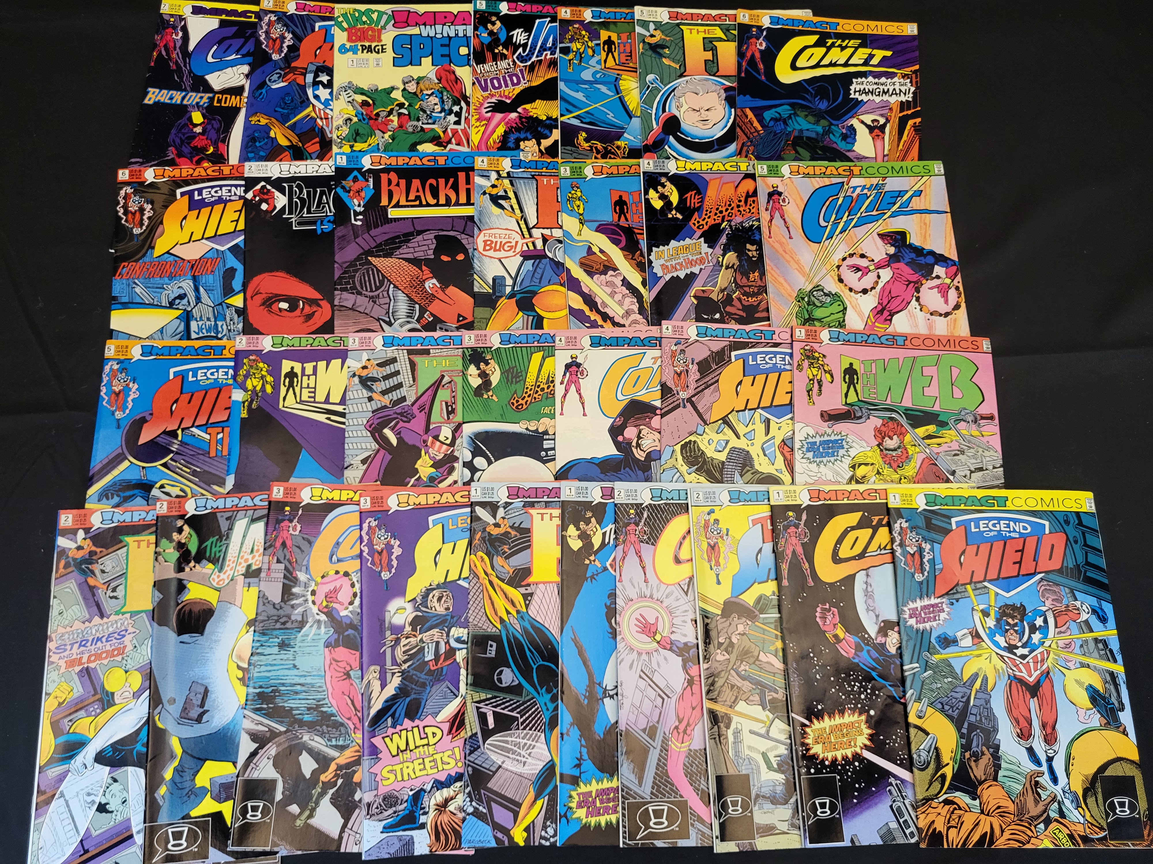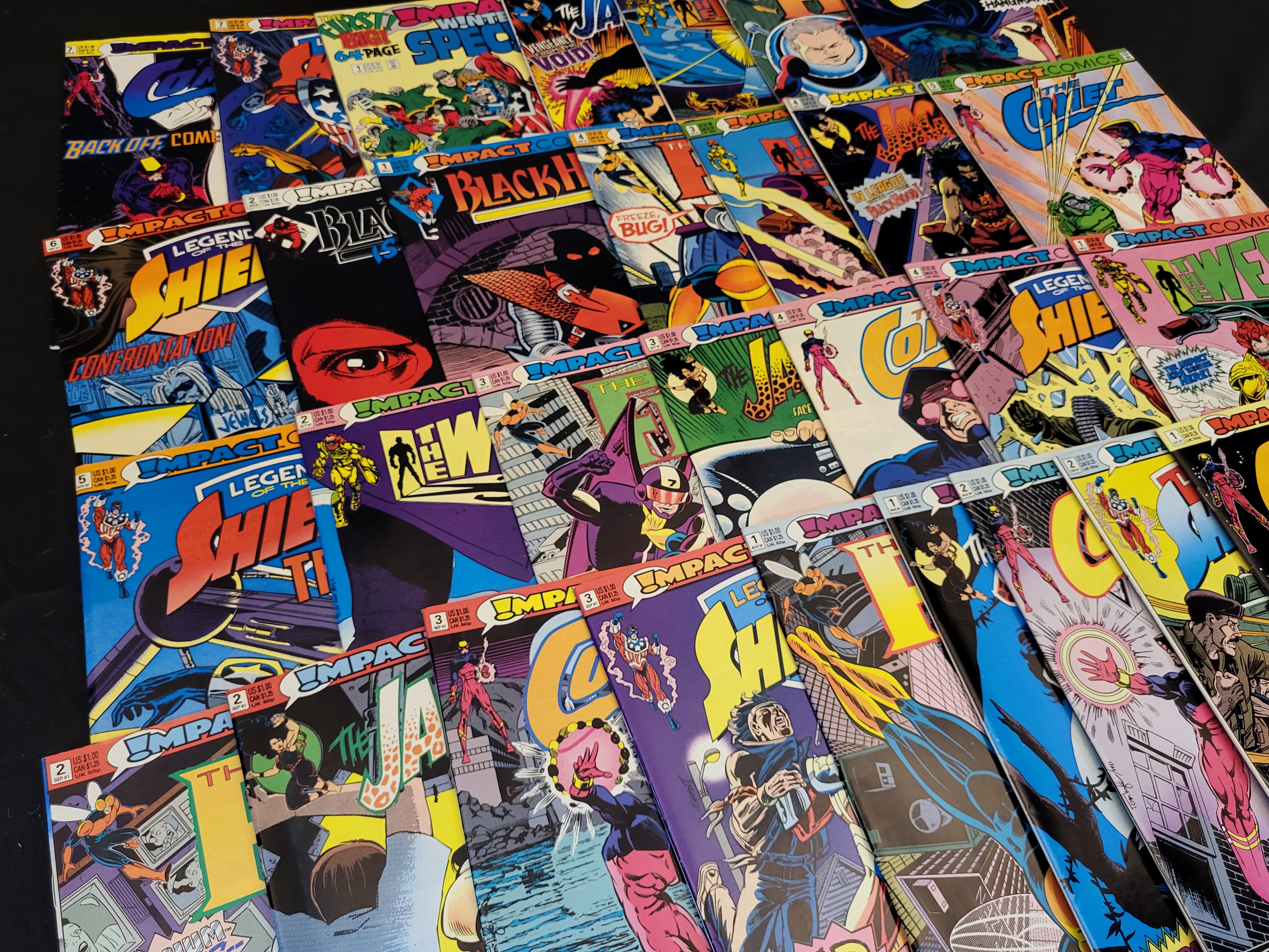 BID PER WHAT YOU SEE IN THE PHOTO, NOT THE AI GENERATED TITLES AND DESCRIPTIONS! A collection of comic books from the Impact Comics imprint of DC Comics, dating from 1991 to 1992. The group includes titles such as The Legend of the Shield, The Comet, The Jaguar, The Fly, The Web, and Black Hood, as well as a Winter Special issue. These items are constructed of stapled paper with color-printed covers and interiors. Each issue displays original cover pricing and numbering from the early 1990s period.