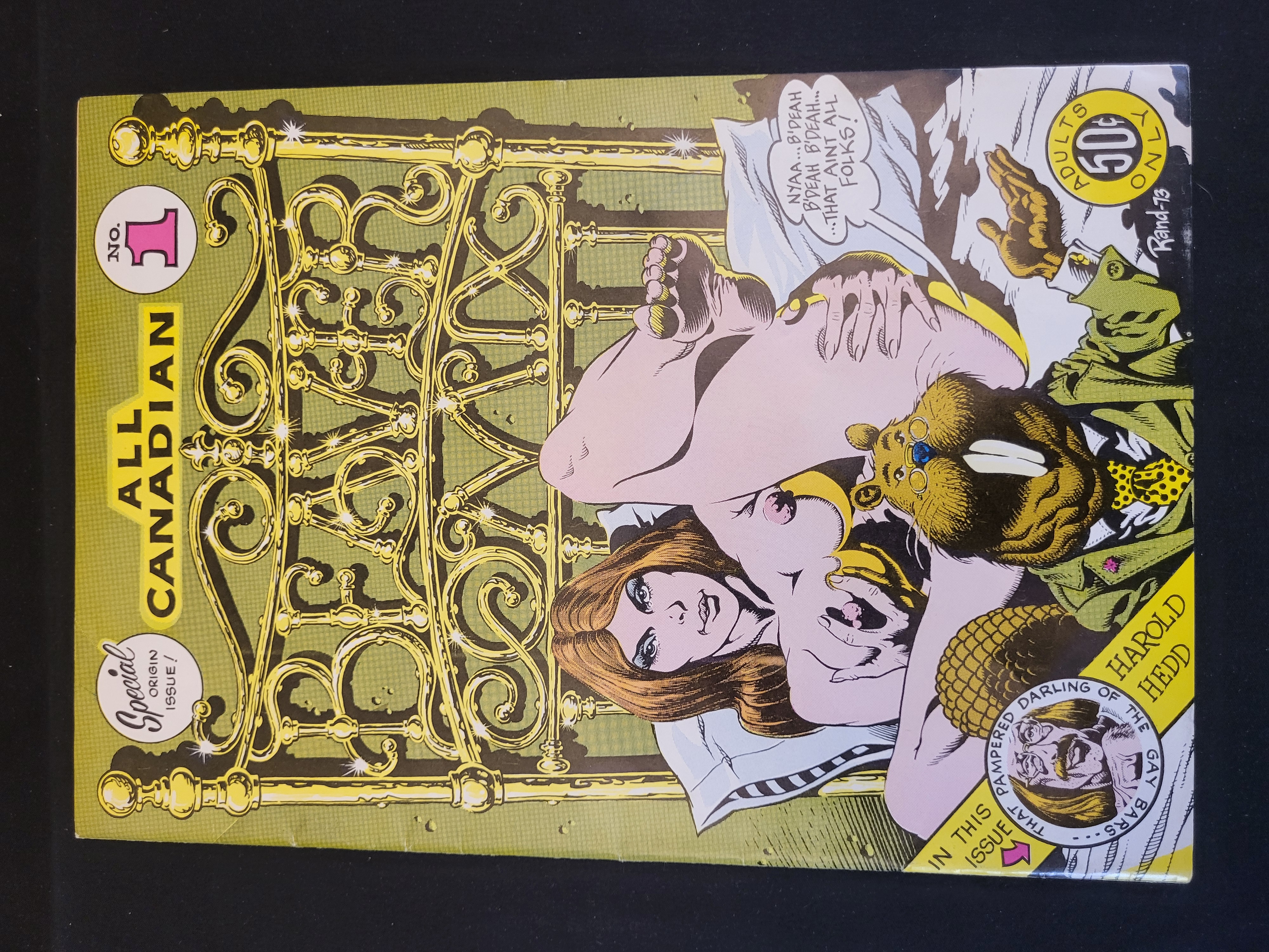 BID PER WHAT YOU SEE IN THE PHOTO, NOT THE AI GENERATED TITLES AND DESCRIPTIONS! A single issue of the underground comic book All Canadian Beaver No. 1, designated as a Special Origin Issue and published in 1973 by T.H.E. Georgia Straight. The front cover features a satirical illustration by artist Rand Holmes, signed Rand-73, depicting a woman on a brass bed frame configured to spell the title word Beaver. The cover is printed with an Adults Only advisory, a 50-cent price point, and promotional text for the character Harold Hedd. The back cover displays a full-color comic advertisement featuring the character Hastings Joe Mammoth, identified as a Roller Derby Hero. This publication is a first printing of the title.