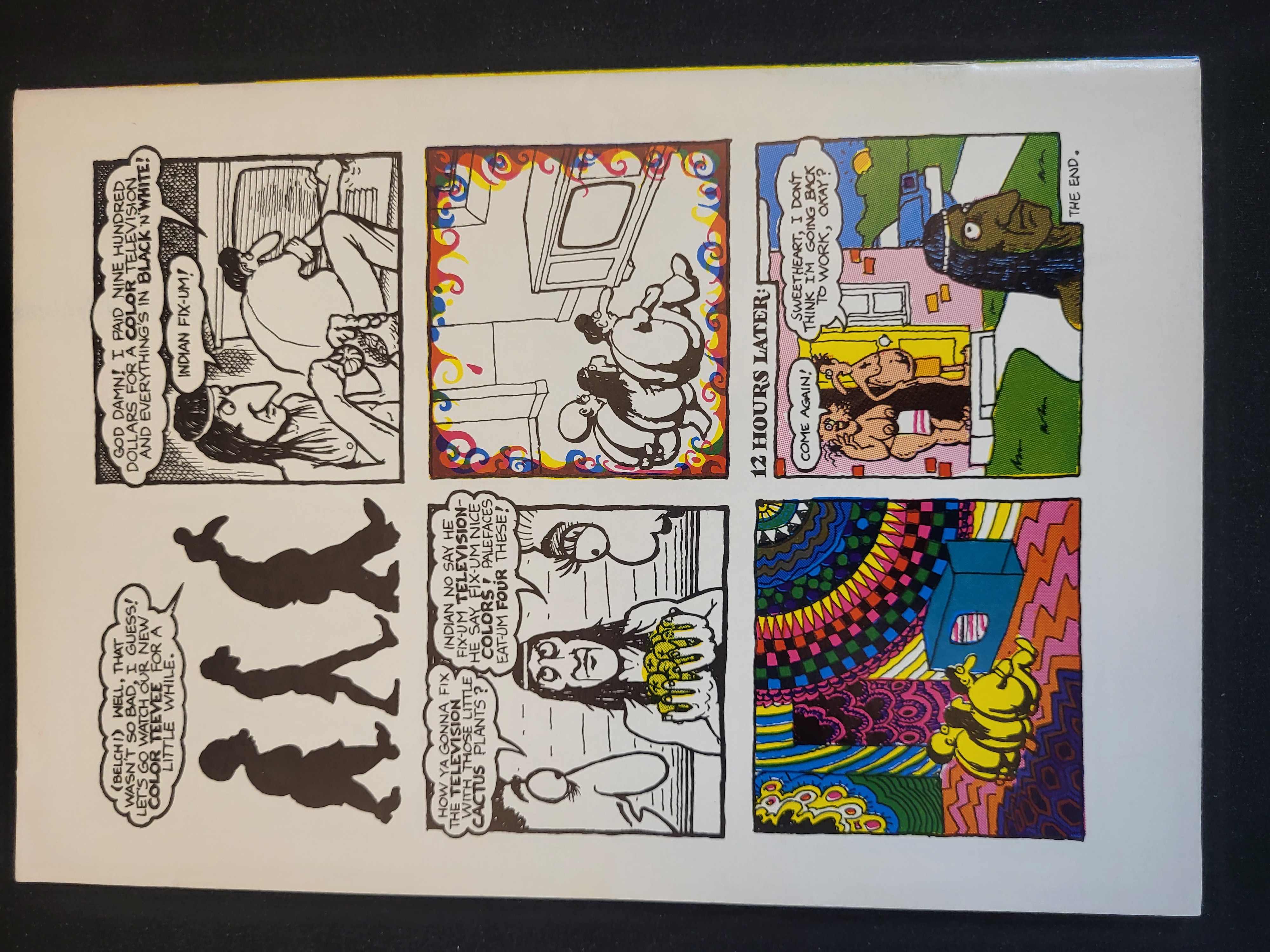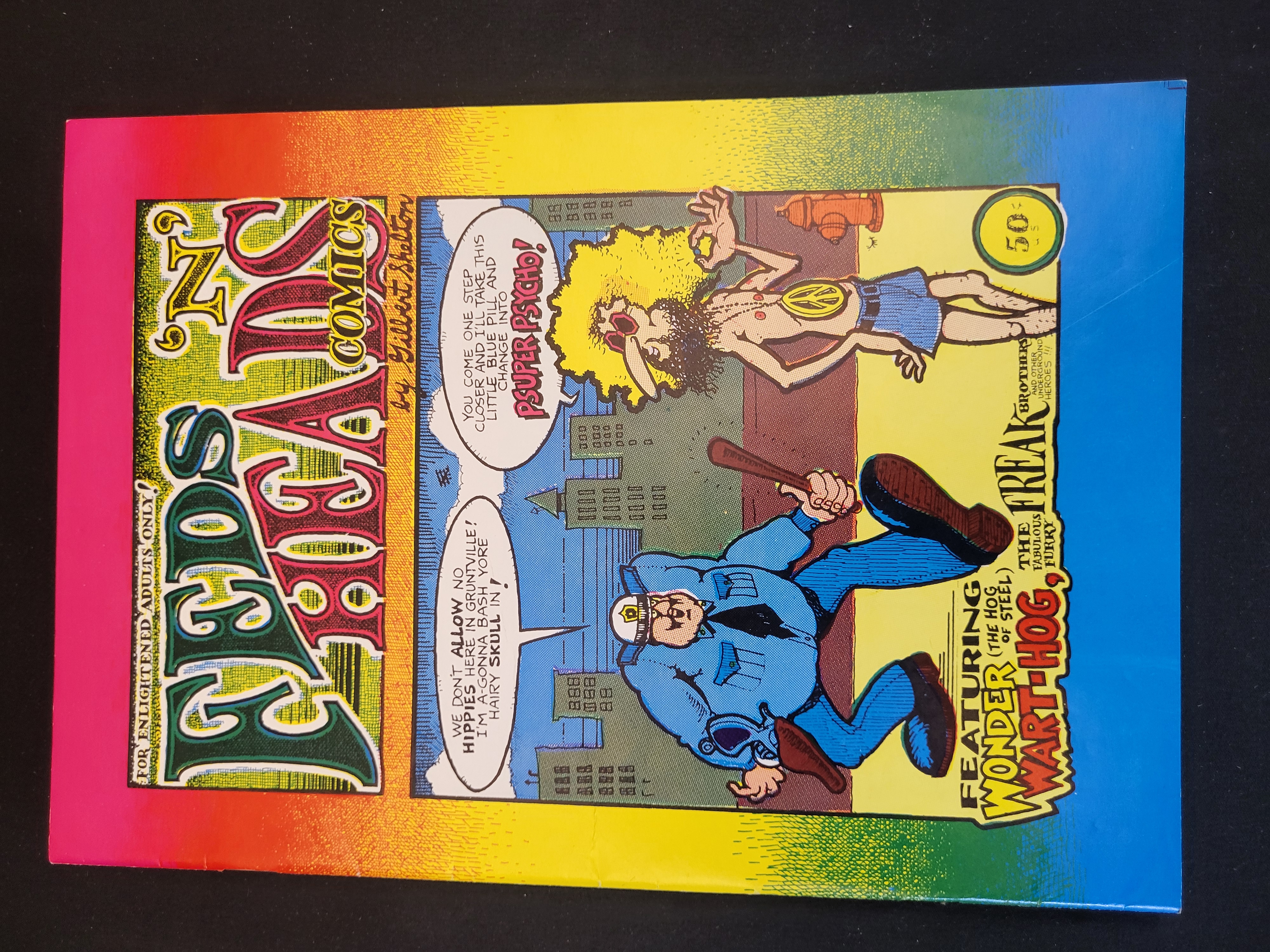BID PER WHAT YOU SEE IN THE PHOTO, NOT THE AI GENERATED TITLES AND DESCRIPTIONS! A copy of Feds ‘N’ Heads Comics No. 1, written and illustrated by Gilbert Shelton. This underground comix title features a softcover format with a rainbow-gradient border on the front cover. The central illustration depicts a police officer in a blue uniform confronting a counter-culture figure wearing a peace sign medallion. The cover includes the text For Enlightened Adults Only and a 50-cent price point, while highlighting the featured characters Wonder Wart-Hog and The Fabulous Furry Freak Brothers. The back cover displays a multi-panel color comic strip with psychedelic themes and stylized typography.