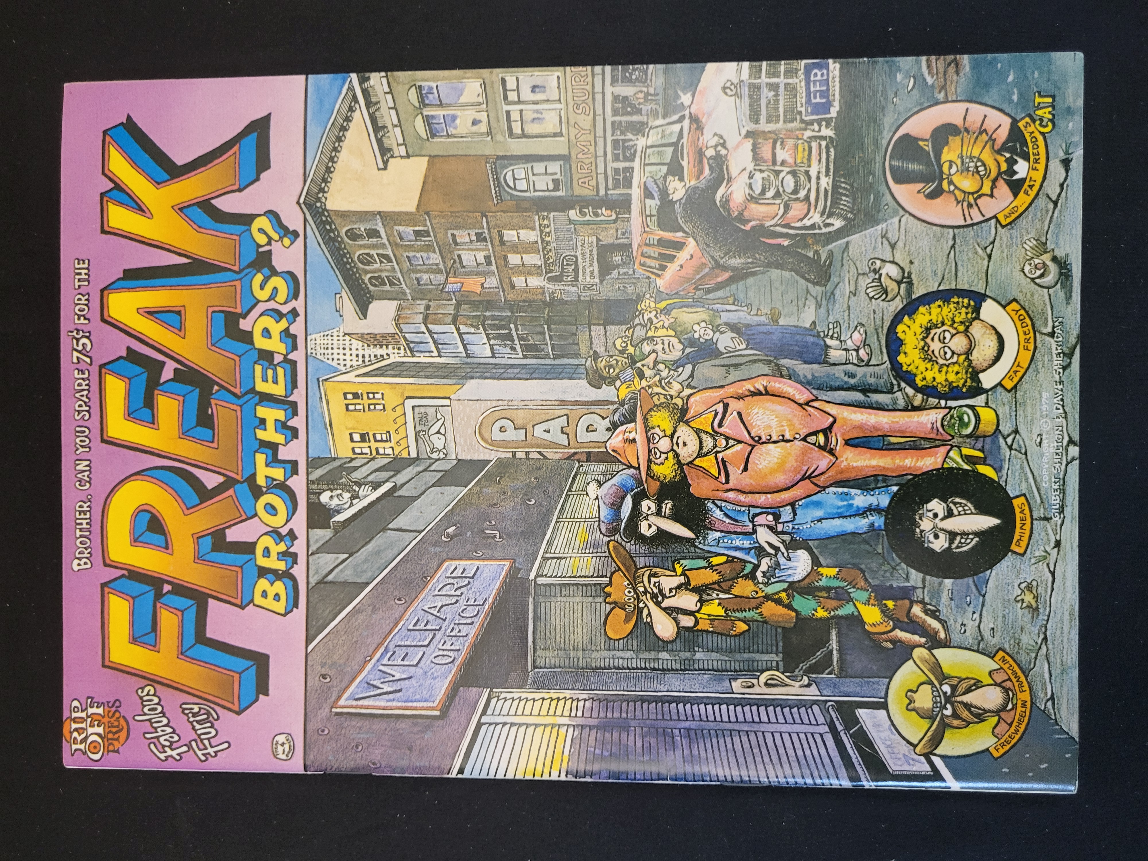 BID PER WHAT YOU SEE IN THE PHOTO, NOT THE AI GENERATED TITLES AND DESCRIPTIONS! The Fabulous Furry Freak Brothers #4, subtitled Brother, Can You Spare 75 Cents For The Freak Brothers?, published by Rip Off Press. This underground comic book features a 1975 copyright date. The cover art, executed by Gilbert Shelton and Dave Sheridan, illustrates characters Phineas, Freewheelin’ Franklin, Fat Freddy, and Fat Freddy’s Cat in a street scene outside a welfare office. The reverse features a parody of Henri Rousseau’s painting The Sleeping Gypsy, depicting Fat Freddy and a lion. The item is a staple-bound illustrated publication.