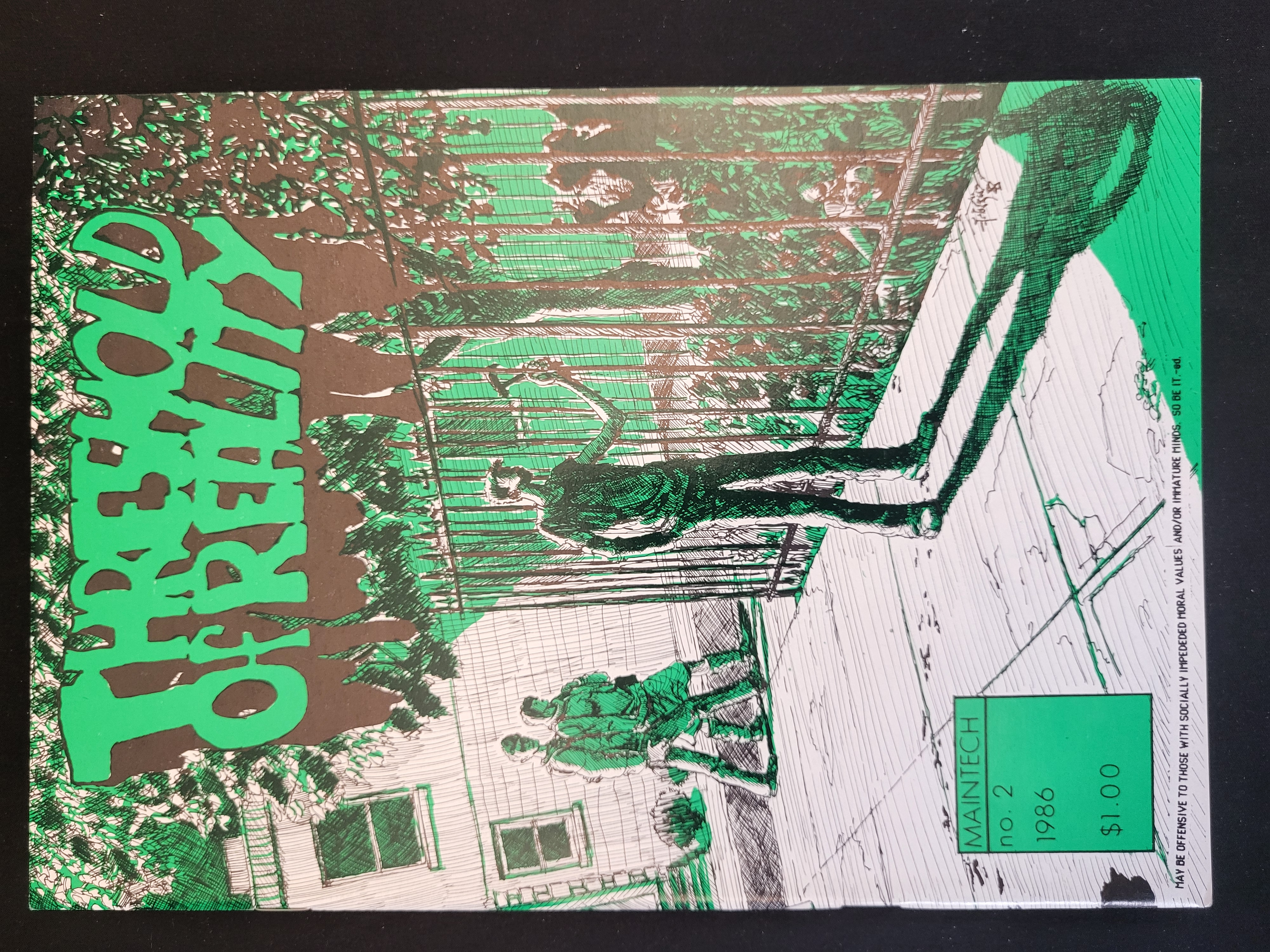 BID PER WHAT YOU SEE IN THE PHOTO, NOT THE AI GENERATED TITLES AND DESCRIPTIONS! Threshold of Reality no. 2 is a comic book published by MAINTECH in 1986. The cover features a high-contrast line art style executed in a palette of green, black, and white. The front cover displays the title in bold green lettering along with a printed price of $1.00. A disclaimer on the front cover reads, MAY BE OFFENSIVE TO THOSE WITH SOCIALLY IMPEDEDED MORAL VALUES AND/OR IMMATURE MINDS. The back cover features a graphic illustration depicting a building and a vehicle in the same stylistic treatment.