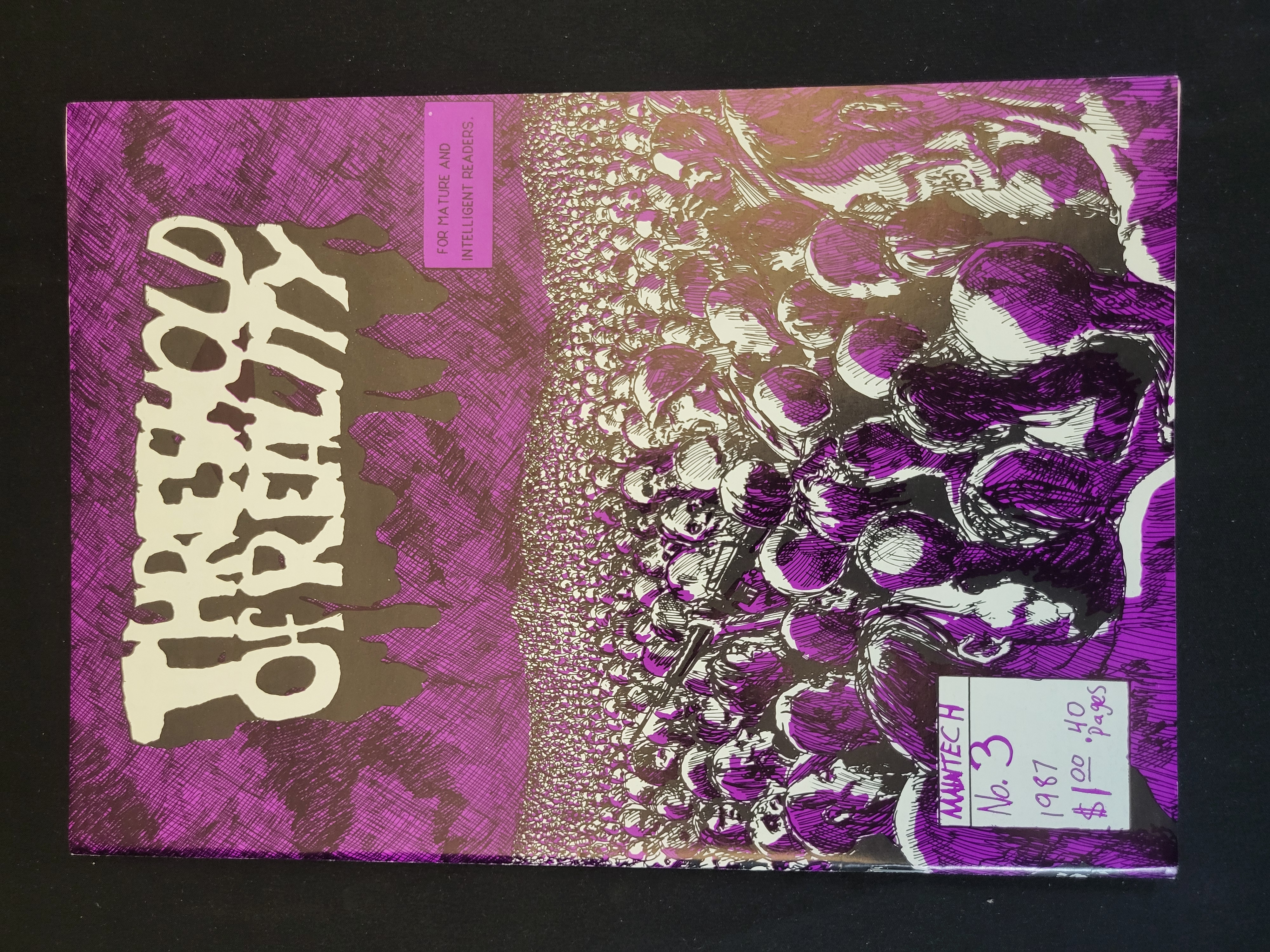 BID PER WHAT YOU SEE IN THE PHOTO, NOT THE AI GENERATED TITLES AND DESCRIPTIONS! Threshold of Reality issue number 3, an underground-style comic book published by Maintech in 1987. The cover art features a high-contrast illustration in purple, black, and white, depicting a mass of skulls and human forms. The front cover includes the title in a stylized font and the text FOR MATURE AND INTELLIGENT READERS. The reverse lists contributing artists including Reggie Byers, Milton Knight, Matt Howarth, and Gary Fields, and notes a full-page pin-up by Milton Knight.