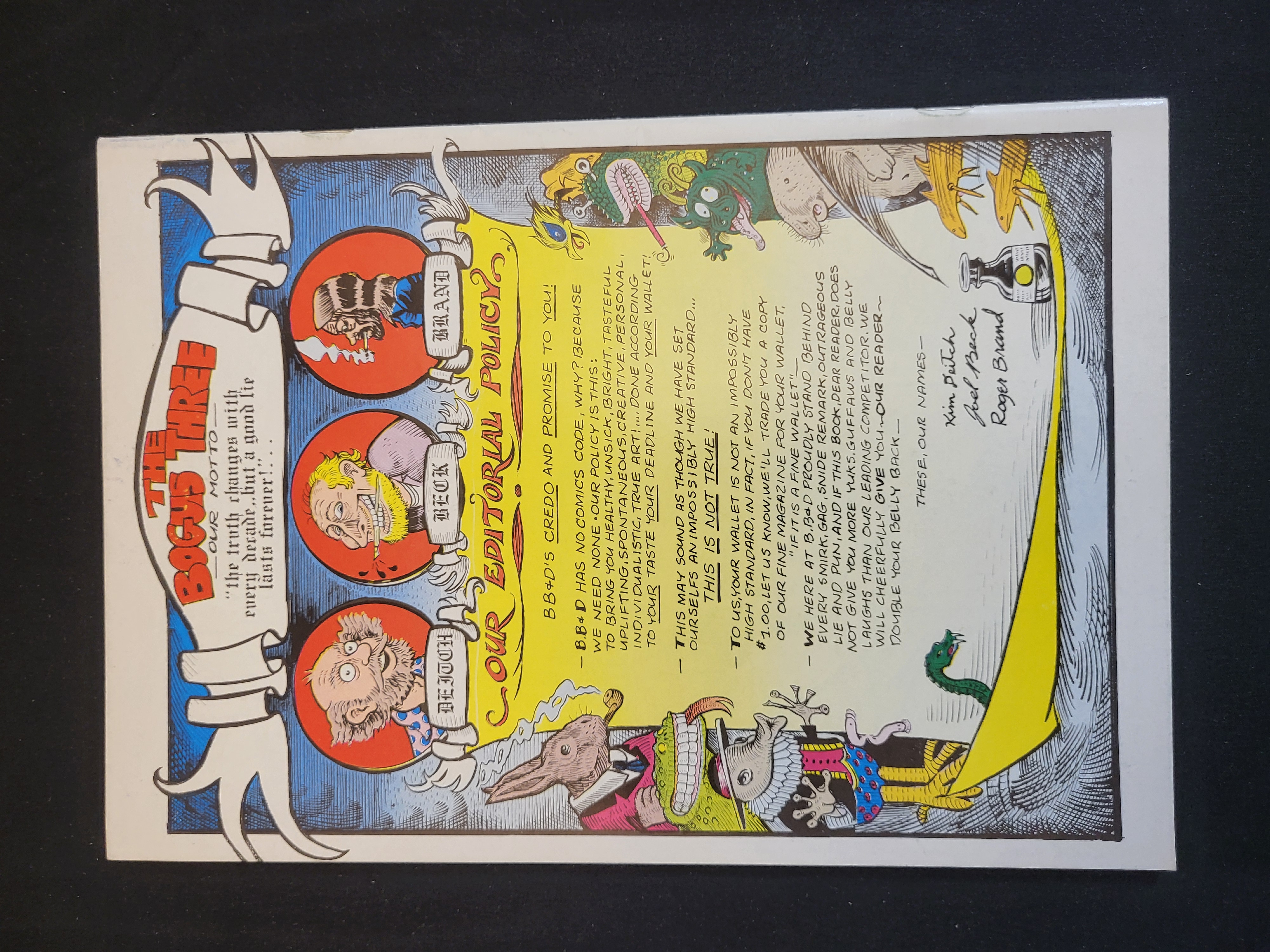 BID PER WHAT YOU SEE IN THE PHOTO, NOT THE AI GENERATED TITLES AND DESCRIPTIONS! A copy of Banzai! No. 1, an underground comic book published by Kitchen Sink Enterprises in 1978. This publication features the collaborative work of artists Kim Deitch, Joel Beck, and Roger Brand. The front cover displays the title in bold yellow lettering superimposed on a bat-winged figure, accompanied by three distinct illustrative panels. The cover is marked No. 1 ADULTS ONLY! with an original price of $1.00. The back cover is designed as a satirical editorial page titled The Bogus Three, containing a text block and caricature portraits of the three contributors with their printed signatures. The comic is printed on standard paper stock of the period.