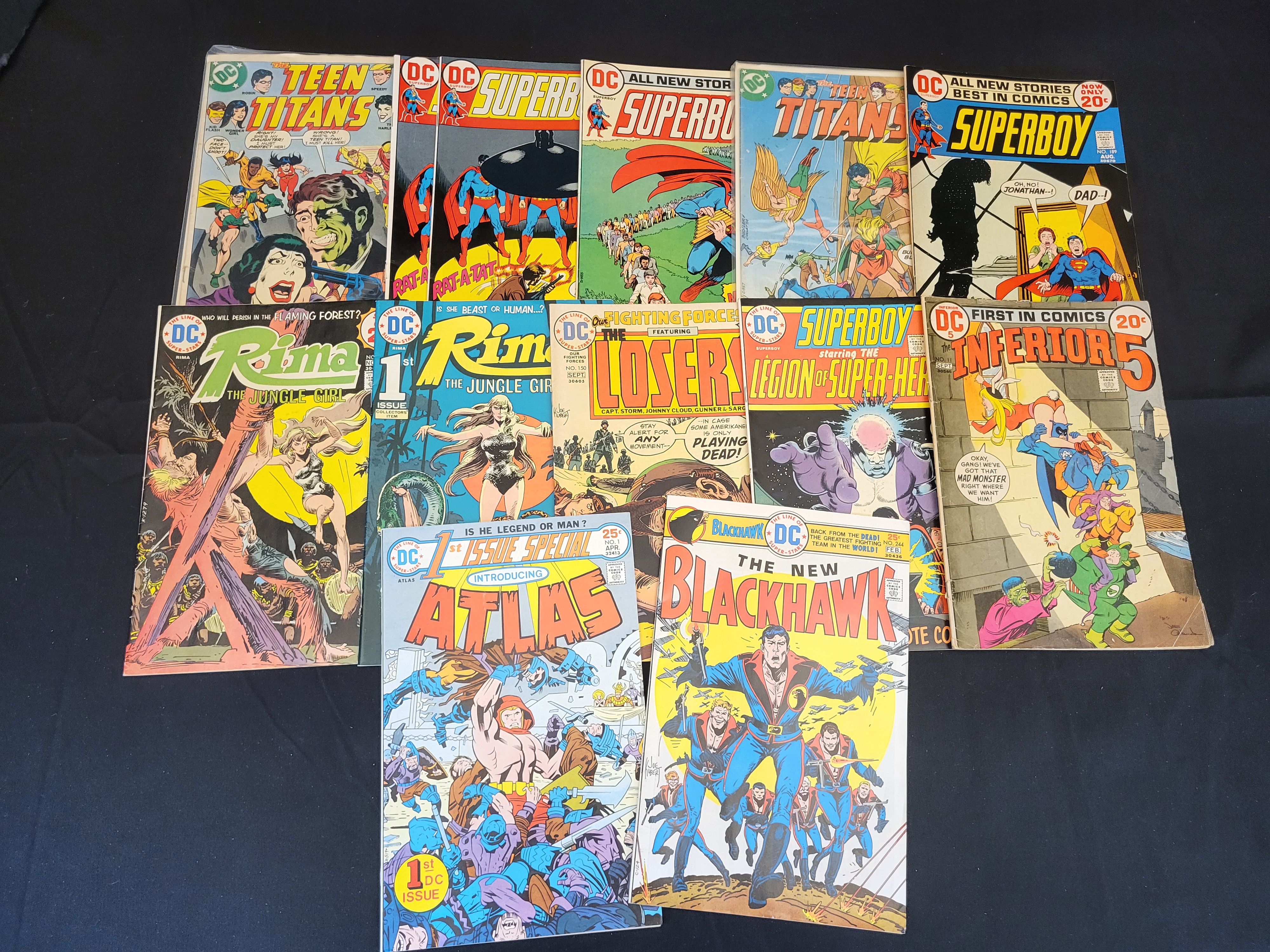 BID PER WHAT YOU SEE IN THE PHOTO, NOT THE AI GENERATED TITLES AND DESCRIPTIONS! This collection features several issues of Heavy Metal: The Adult Illustrated Fantasy Magazine alongside an assortment of vintage DC comic books. The Heavy Metal magazines date primarily from 1990 and 1991 and are housed in a black, pebble-textured slipcase with white logo branding. These issues feature science-fiction and fantasy cover art. The comic book selection includes multiple Bronze Age DC titles such as Teen Titans, Superboy, Rima the Jungle Girl, The Losers, The New Blackhawk, 1st Issue Special: Atlas, Inferior 5, and Legion of Super-Heroes. The comic books display original cover prices of 20 and 25 cents. Several items are presented in protective plastic sleeves.