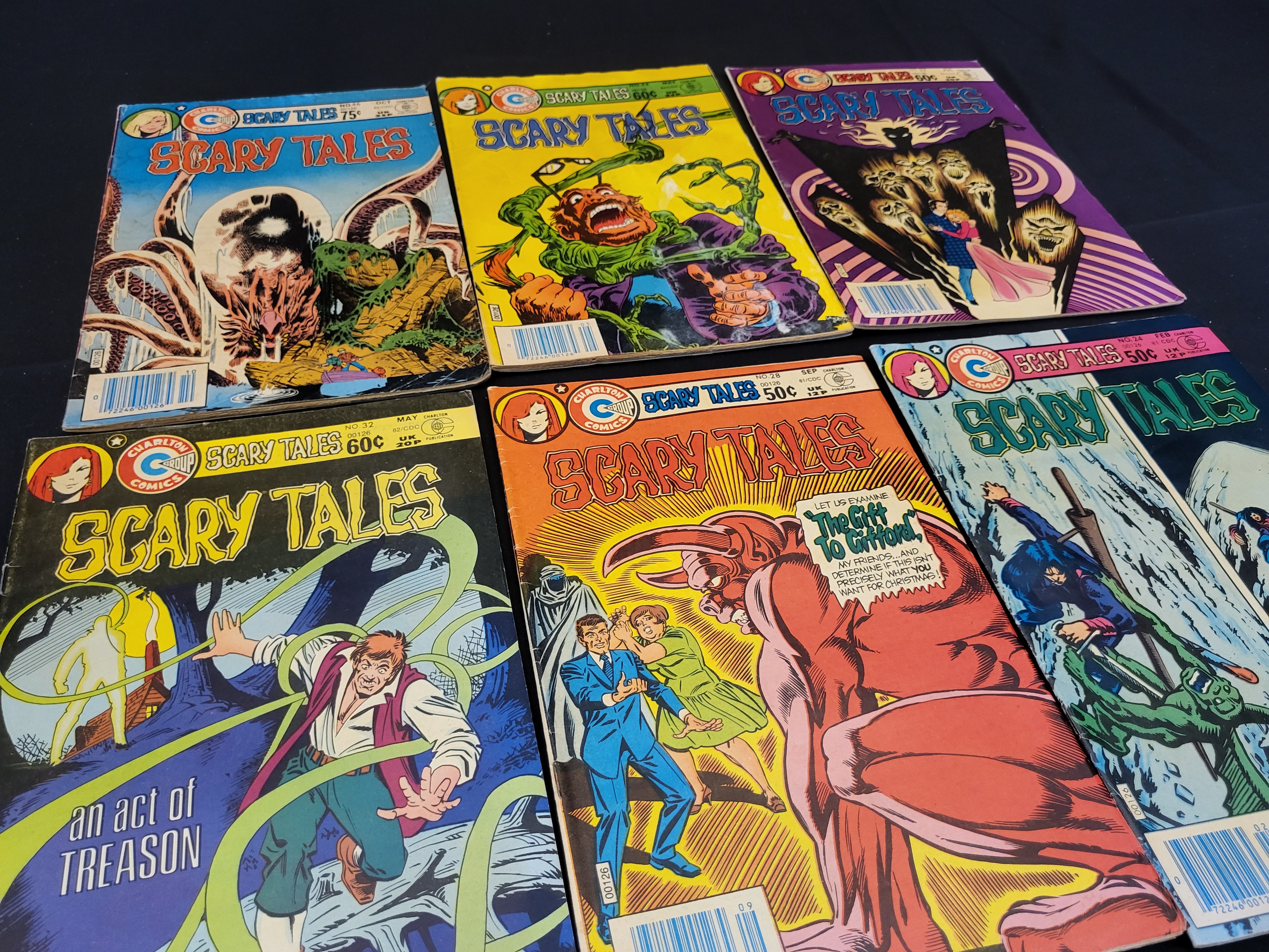 BID PER WHAT YOU SEE IN THE PHOTO, NOT THE AI GENERATED TITLES AND DESCRIPTIONS! A group of vintage horror-themed comic books from the Scary Tales series published by Charlton Comics. This collection includes issues No. 24 (February 1981), No. 28 (September 1981), No. 32 (May 1982), No. 33 (July 1982), No. 44 (May 1984), and No. 46 (October 1984). Each issue features full-color illustrated covers with the Charlton Group logo, issue numbers, publication months, and original cover prices ranging from 50 to 75 cents. The books are staple-bound with newsprint interiors.