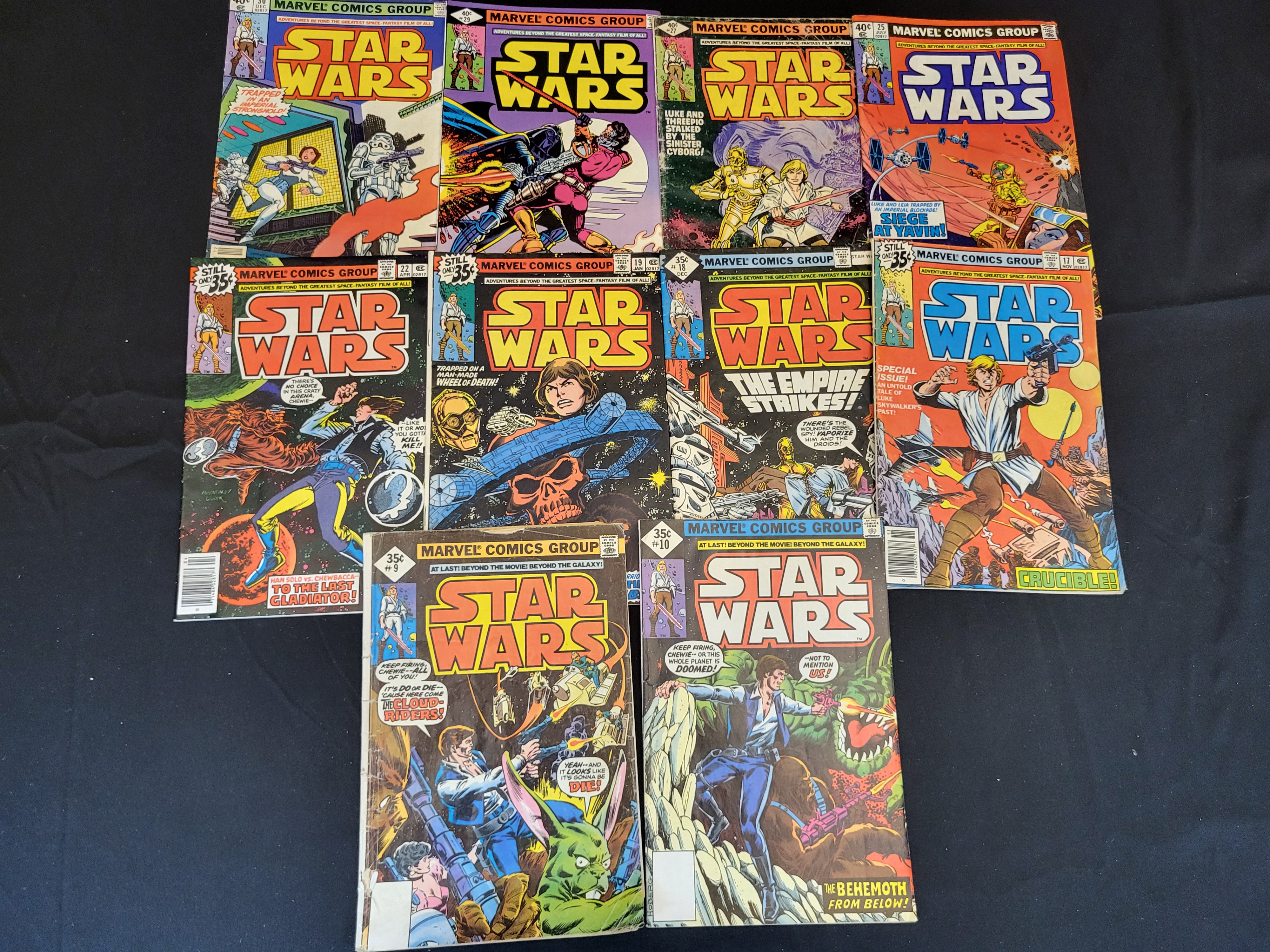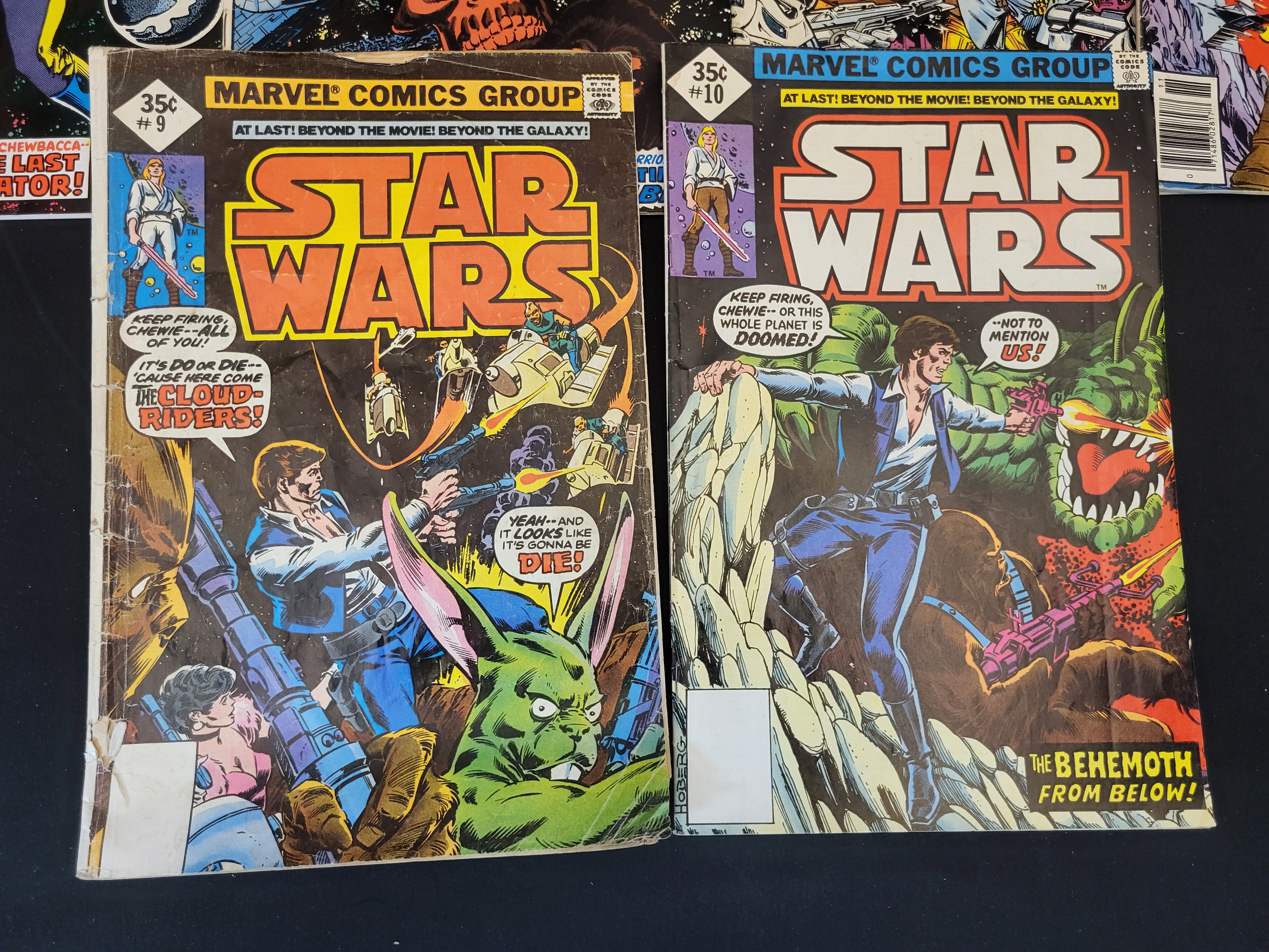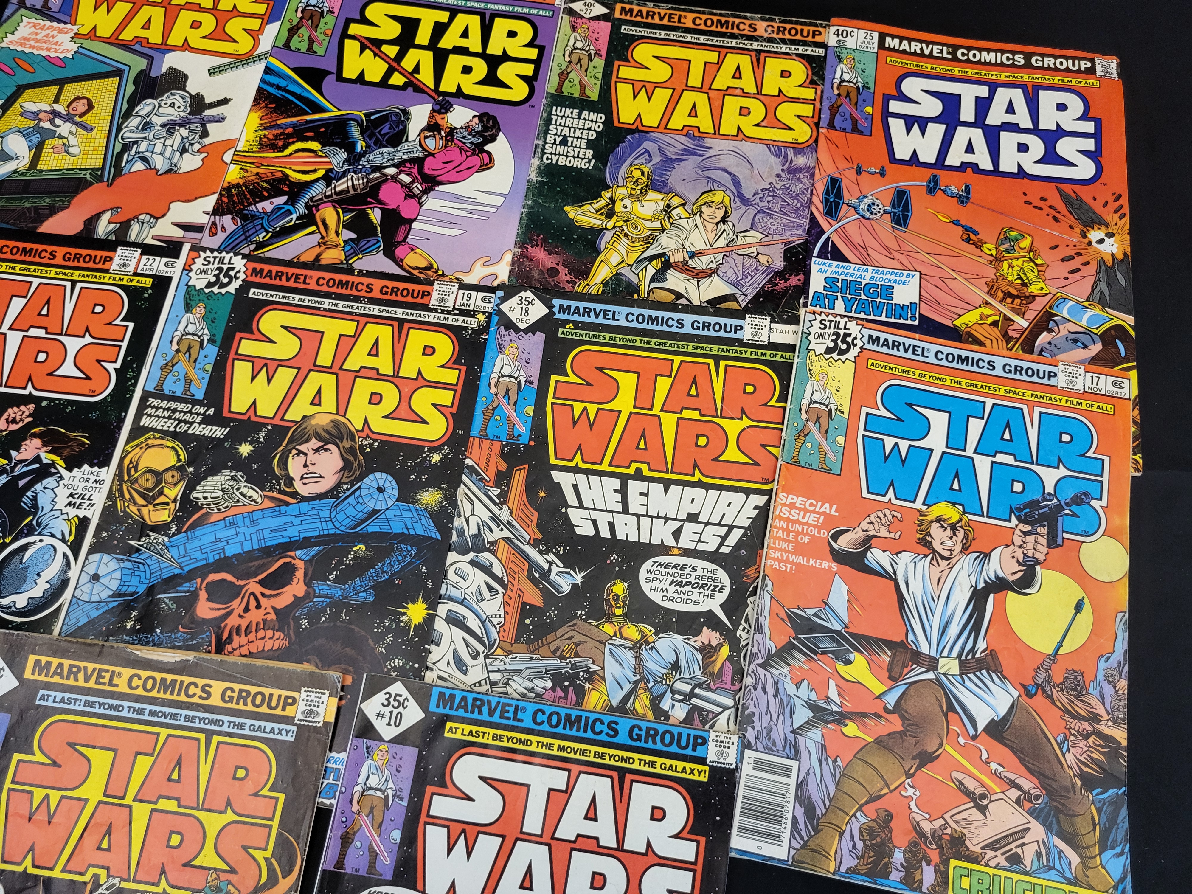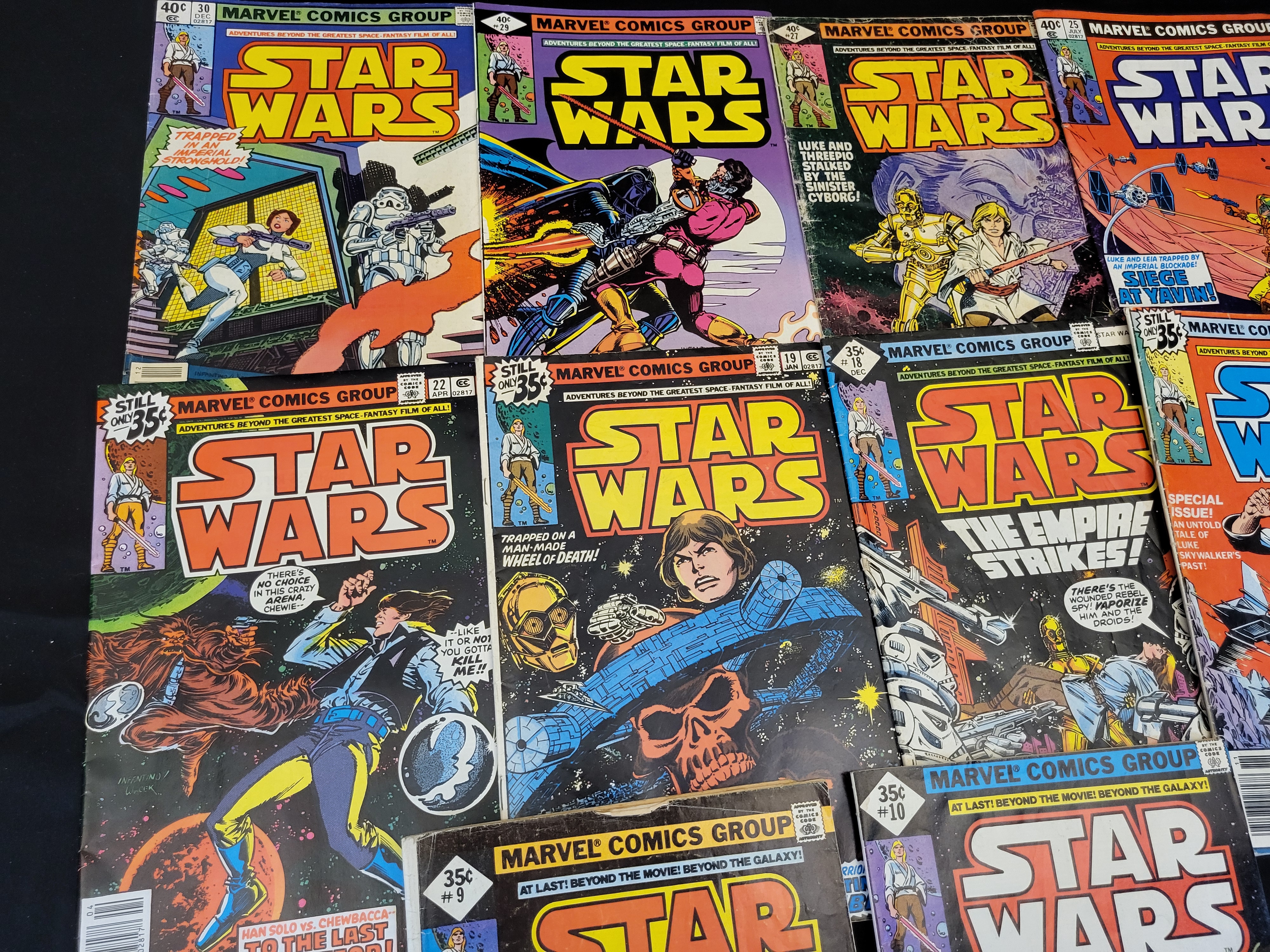 BID PER WHAT YOU SEE IN THE PHOTO, NOT THE AI GENERATED TITLES AND DESCRIPTIONS! A collection of vintage Star Wars comic books published by Marvel Comics Group during the late 1970s Bronze Age. The group includes various issue numbers such as 9, 10, 17, 18, 19, 22, 25, 27, 29, and 30. These issues feature original cover prices of 35 cents and 40 cents. The cover art depicts various characters and narrative scenes, including titles such as The Cloud Riders!, The Behemoth From Below!, and Siege at Yavin!. The publications are constructed with stapled newsprint and illustrated paper covers. Issues 9 and 10 are distinguished by diamond-shaped price boxes on the upper left corners.