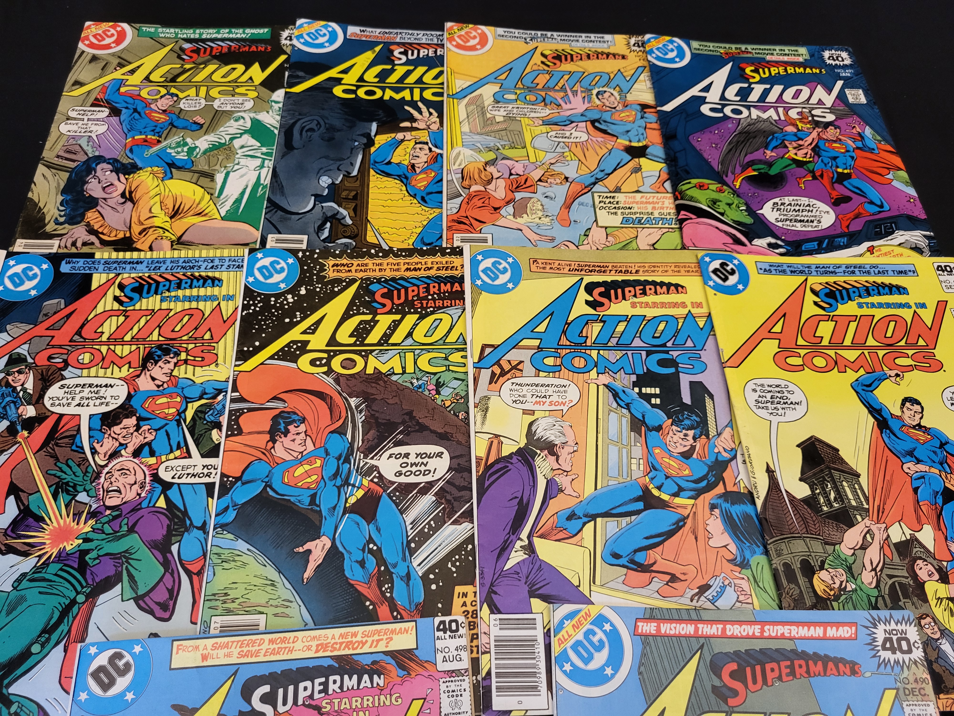 BID PER WHAT YOU SEE IN THE PHOTO, NOT THE AI GENERATED TITLES AND DESCRIPTIONS! A collection of DC Comics Action Comics featuring Superman, dating from the late 1970s to early 1980s. The group includes various Bronze Age issues such as No. 490, 491, 498, and 499. Based on market research, the collection contains Whitman variants, which are identified by their 40-cent original cover prices and specific distribution markings. These items are staple-bound newsprint periodicals featuring colorful cover art characteristic of the era.