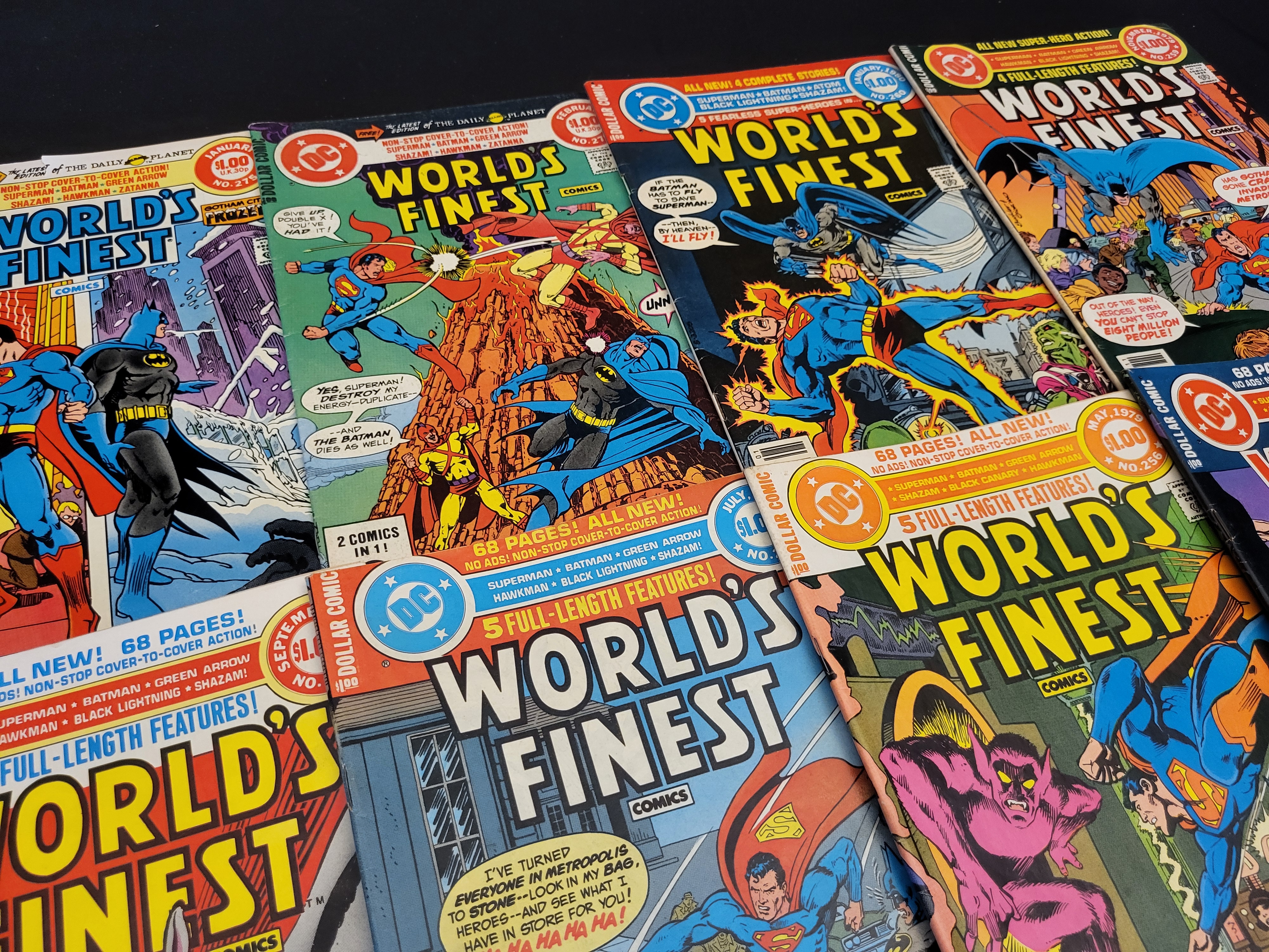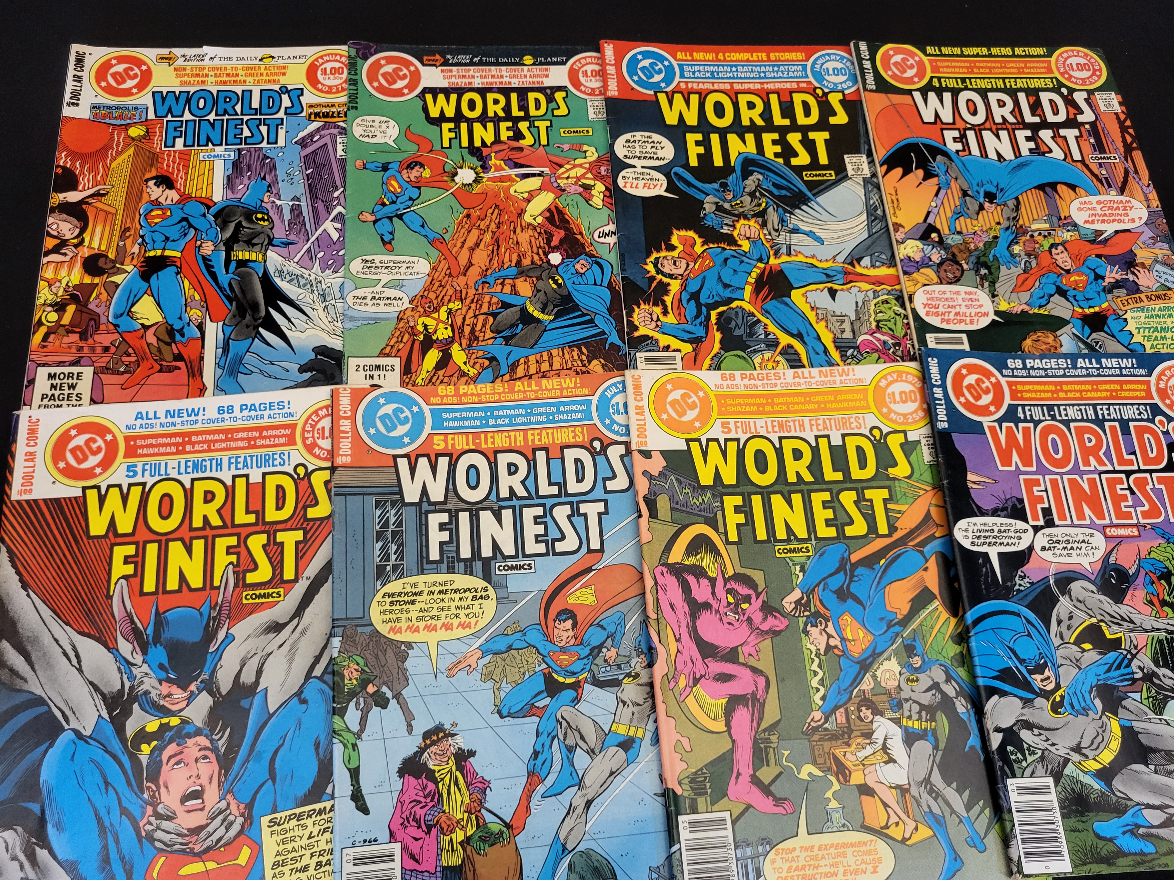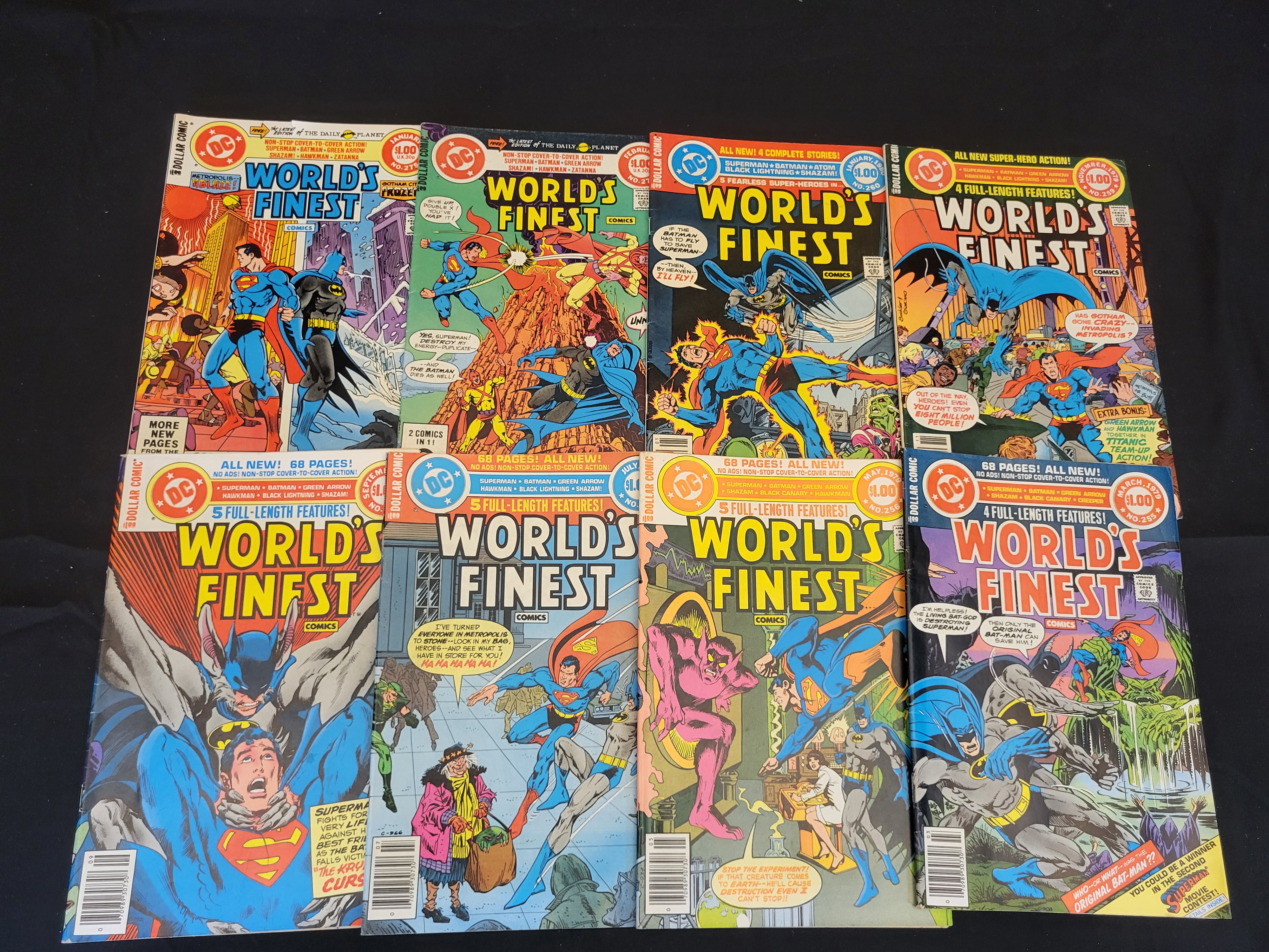 BID PER WHAT YOU SEE IN THE PHOTO, NOT THE AI GENERATED TITLES AND DESCRIPTIONS! A group of Bronze Age comic books from the DC series World’s Finest Comics, published between 1979 and 1981. These issues are presented in the Dollar Comic format, characterized by a higher page count and multiple stories per issue. The primary features include Superman and Batman, with additional stories featuring characters such as Green Arrow, Hawkman, and Shazam. The collection includes issue numbers 255, 256, 257, 258, 259, 260, 261, and 275. Each cover displays a printed price of one dollar.