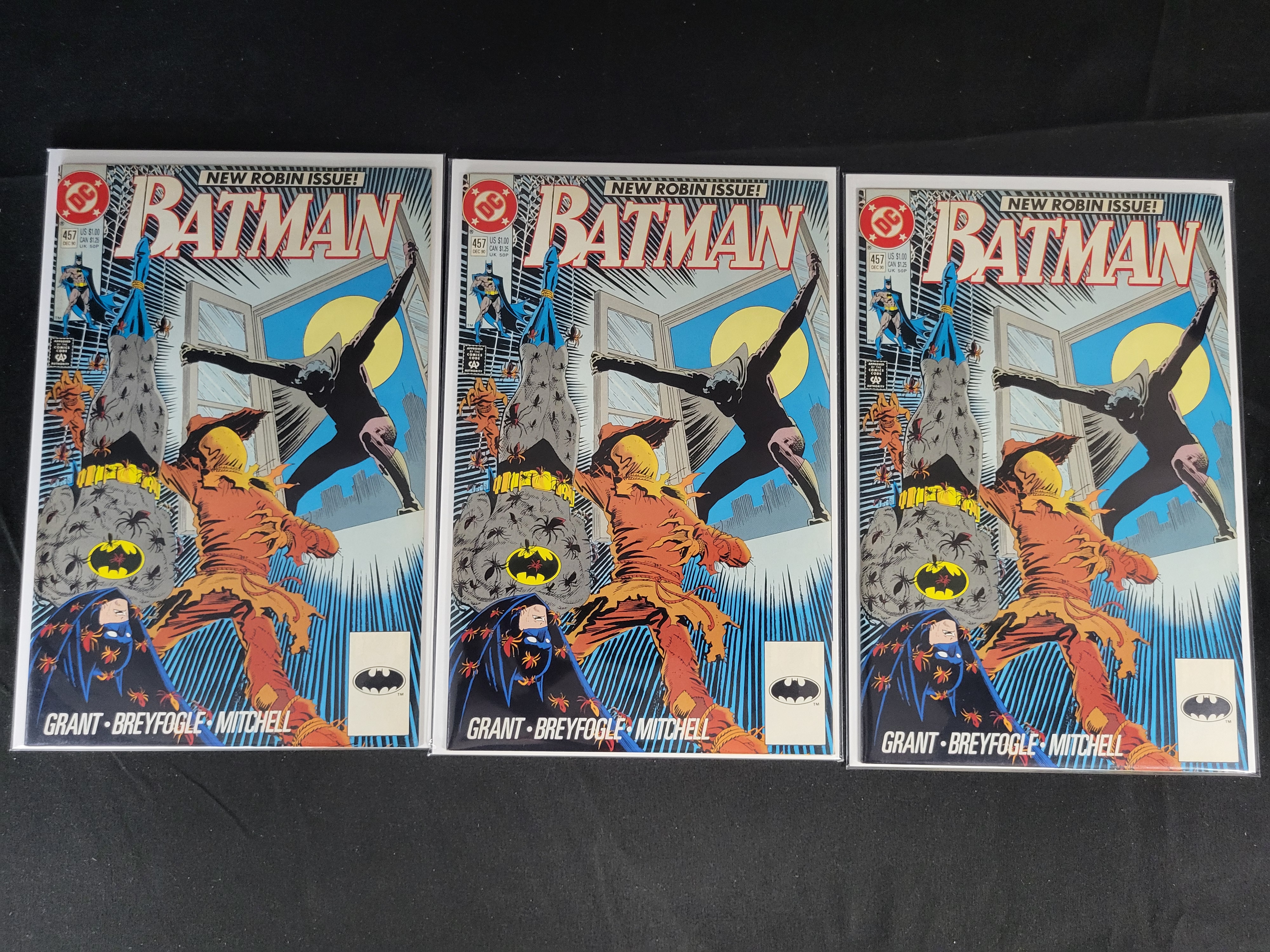 BID PER WHAT YOU SEE IN THE PHOTO, NOT THE AI GENERATED TITLES AND DESCRIPTIONS! A trio of DC Comics Batman issue No. 457, published in December 1990. This issue is recognized for the first appearance of Tim Drake as Robin, as noted by the NEW ROBIN ISSUE! text on the front cover. The creative credits include Alan Grant, Norm Breyfogle, and Steve Mitchell. The cover art depicts Batman, the Scarecrow, and Tim Drake. The comics are printed on standard paper stock. Each issue is individually housed in a clear plastic protective sleeve with a white backing board.