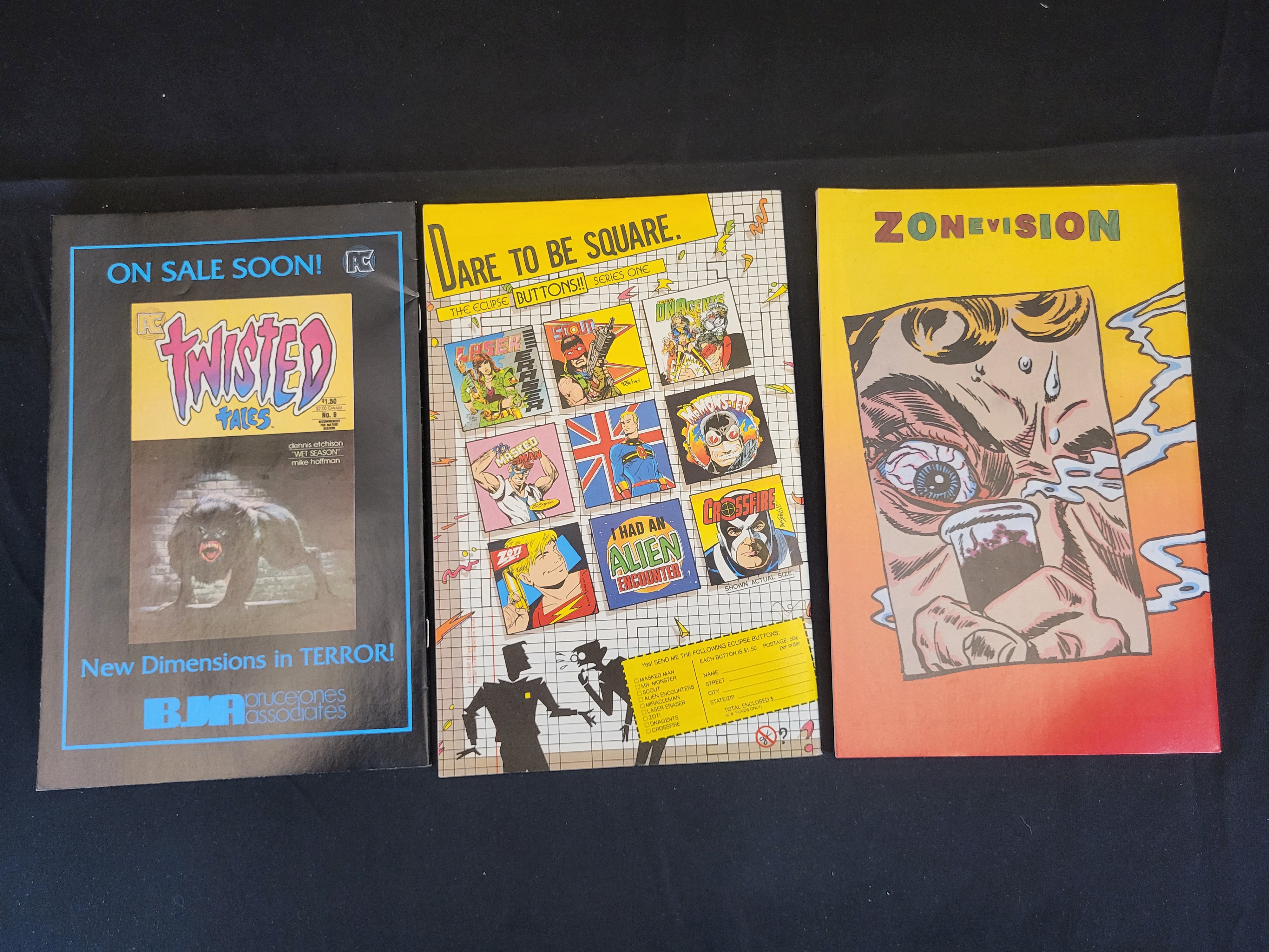 BID PER WHAT YOU SEE IN THE PHOTO, NOT THE AI GENERATED TITLES AND DESCRIPTIONS! A trio of independent 3D comic books published in the 1980s. The group includes 3-D Alien Terror No. 1 published by Eclipse Comics, featuring work by Bruce Jones and originally issued with 3D glasses. Also included are Alien Worlds 3-D No. 1 published by Pacific Comics and The 3-D Zone presents Wallace Wood in Dr. Jekyll and Mr. Hyde No. 1. These publications are staple-bound with color illustrated covers. The back covers feature advertisements for Twisted Tales, Eclipse promotional buttons, and Zonevision.