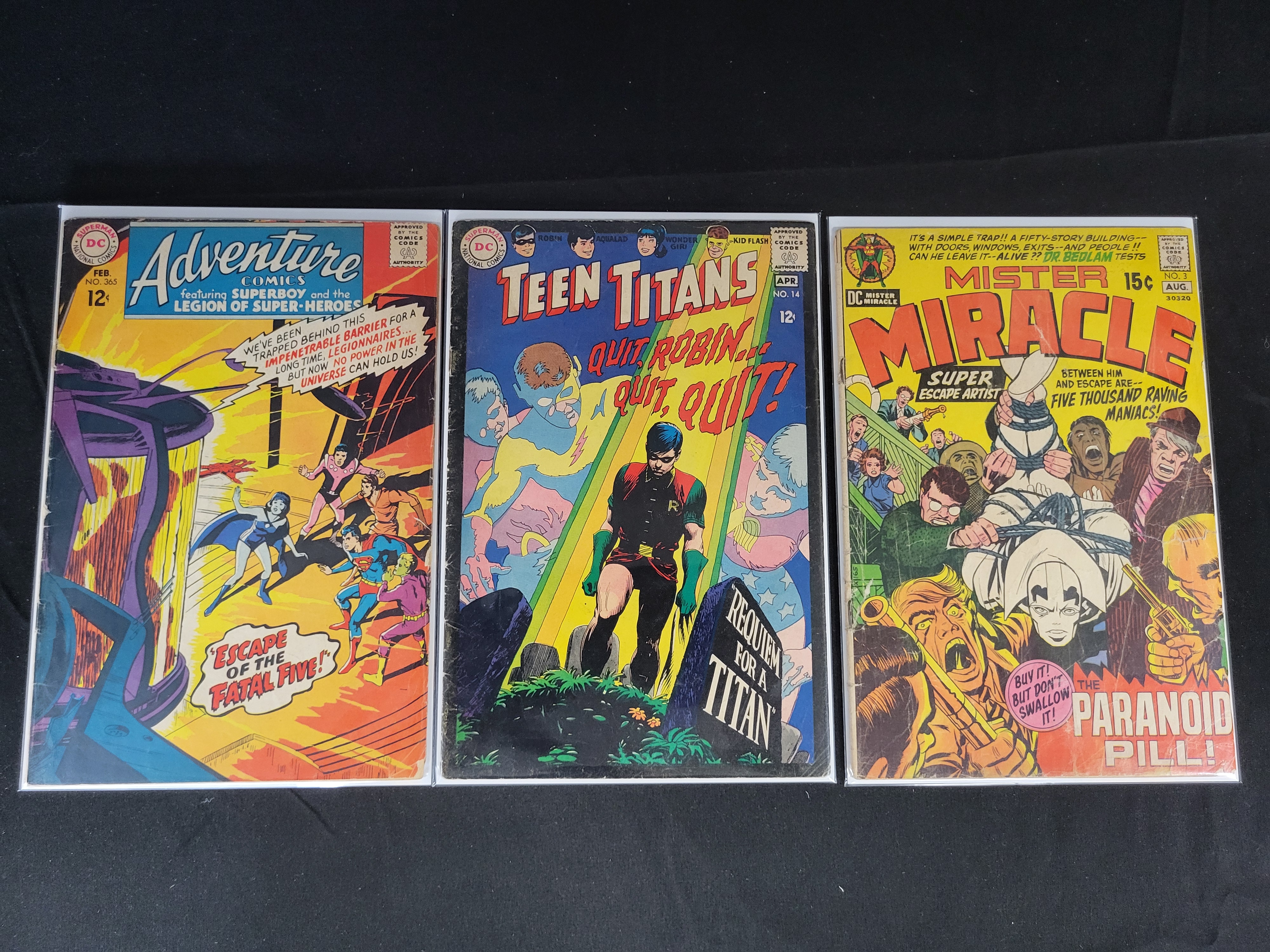BID PER WHAT YOU SEE IN THE PHOTO, NOT THE AI GENERATED TITLES AND DESCRIPTIONS! A collection of three vintage DC comic books comprising Adventure Comics No. 365 (February 1968), Teen Titans No. 14 (April 1968), and Mister Miracle No. 3 (August 1971). Adventure Comics No. 365 features Superboy and the Legion of Super-Heroes with the story Escape of the Fatal Five. Teen Titans No. 14, titled Requiem for a Titan, features the Robin Quits storyline with cover art by Nick Cardy. Mister Miracle No. 3, titled The Paranoid Pill, is an early issue from the Jack Kirby Fourth World era. The Adventure Comics and Teen Titans issues are 12-cent cover price editions, while the Mister Miracle issue is a 15-cent edition. Each comic is presented in a clear protective sleeve with a white backing board.