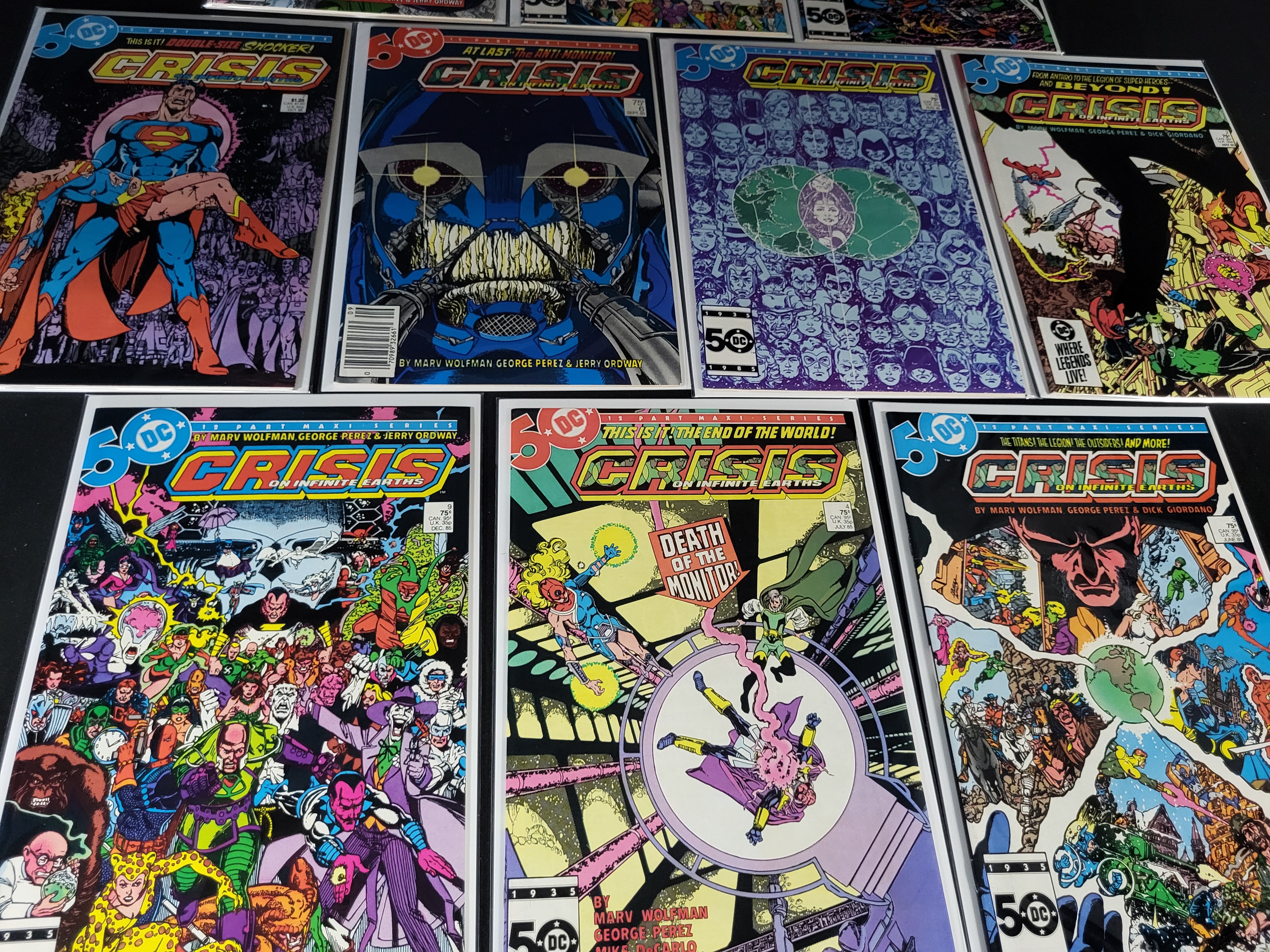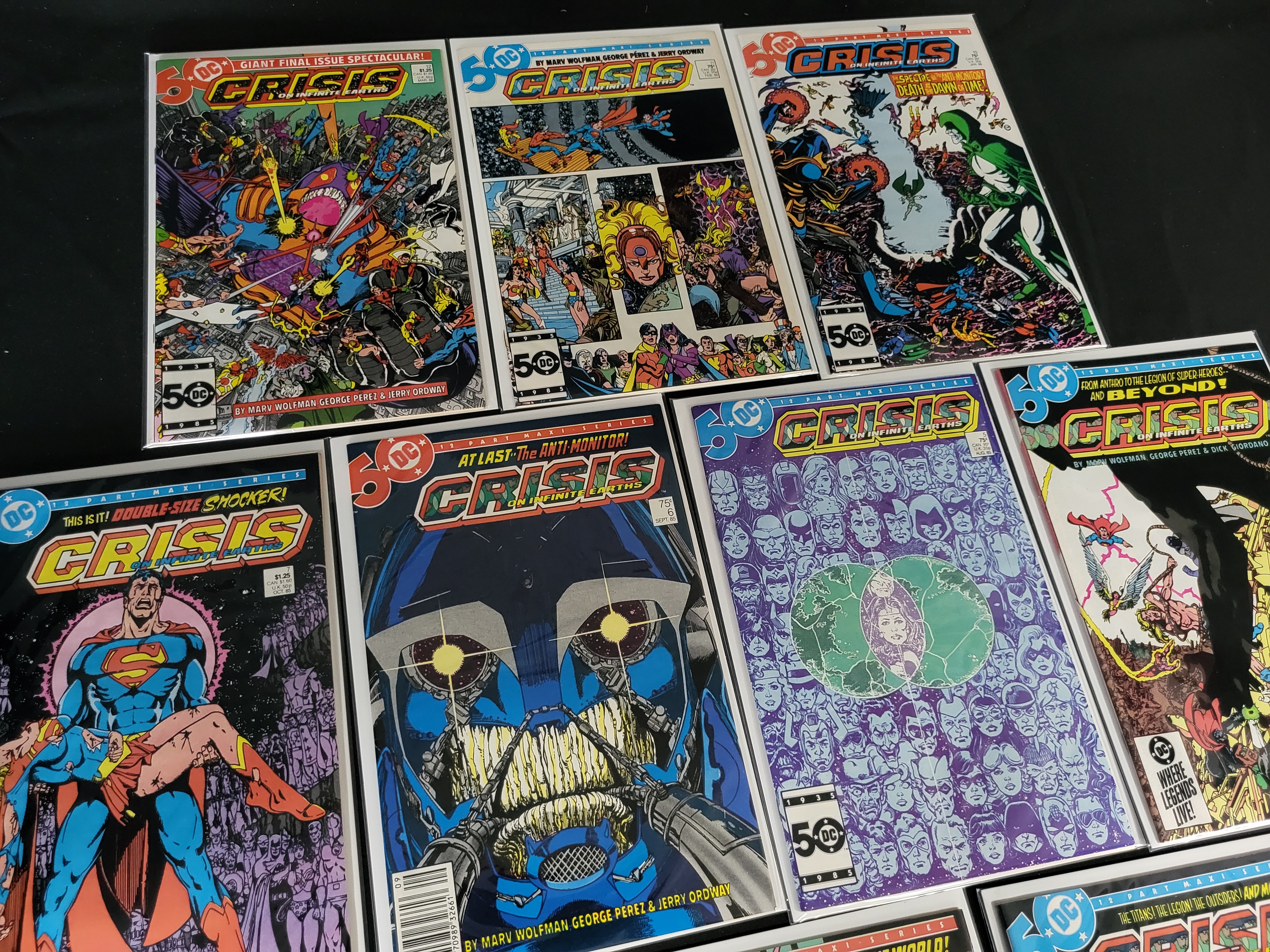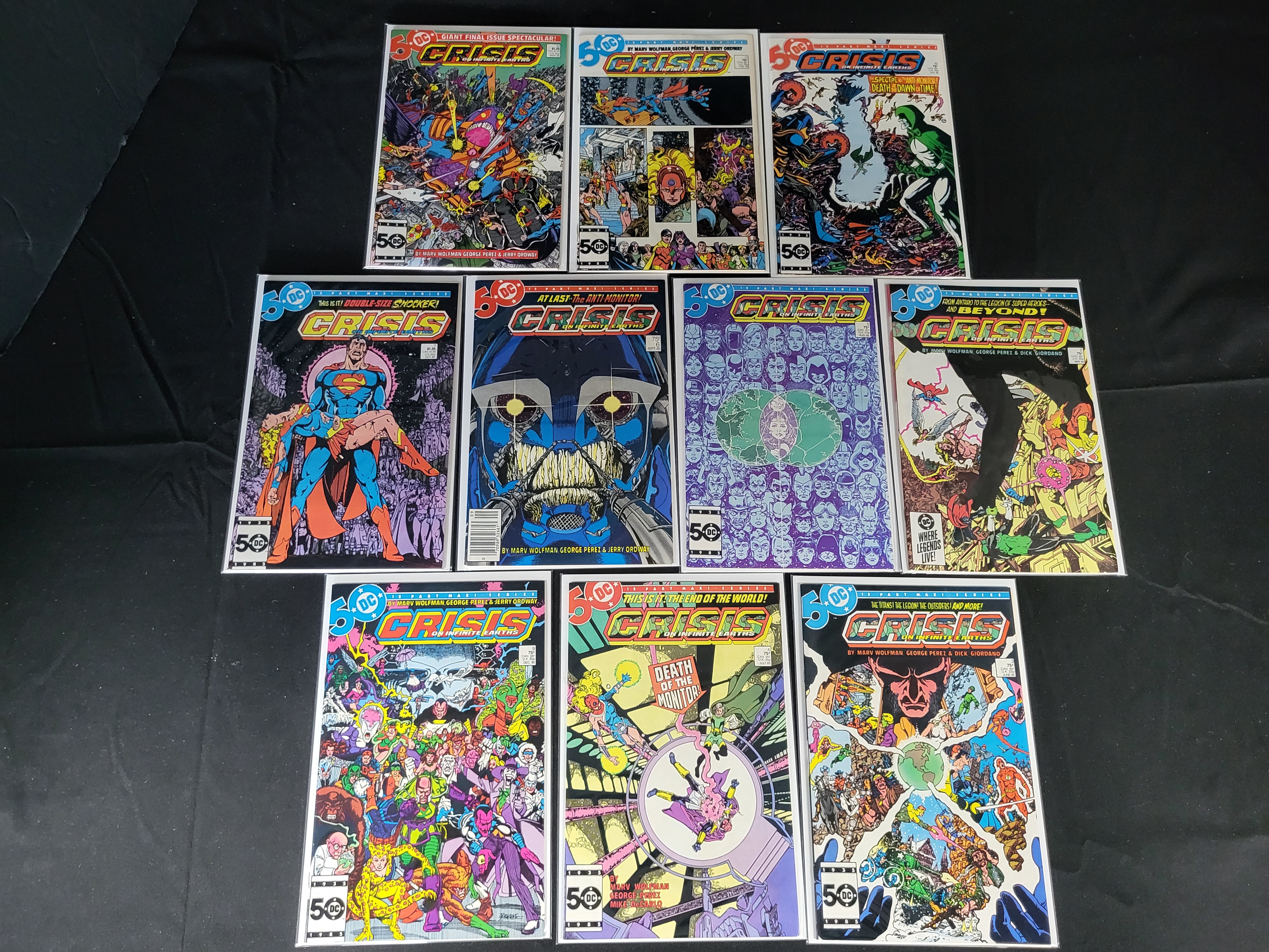 BID PER WHAT YOU SEE IN THE PHOTO, NOT THE AI GENERATED TITLES AND DESCRIPTIONS! A collection of DC Comics Crisis on Infinite Earths comic books from the 1985 twelve-part maxi-series. These staple-bound comic books are constructed of newsprint with glossy covers. The group includes various issues such as numbers 4 through 12, featuring cover art and story contributions from creators Marv Wolfman, George Perez, Jerry Ordway, and Dick Giordano. Each comic displays the 50 DC anniversary logo and original cover prices ranging from $0.75 to $1.25. The items are individually housed in protective plastic sleeves with white backing boards. The collection includes key issues such as number 4, which features the death of the Monitor and multiple first appearances, as well as number 7 and number 12.