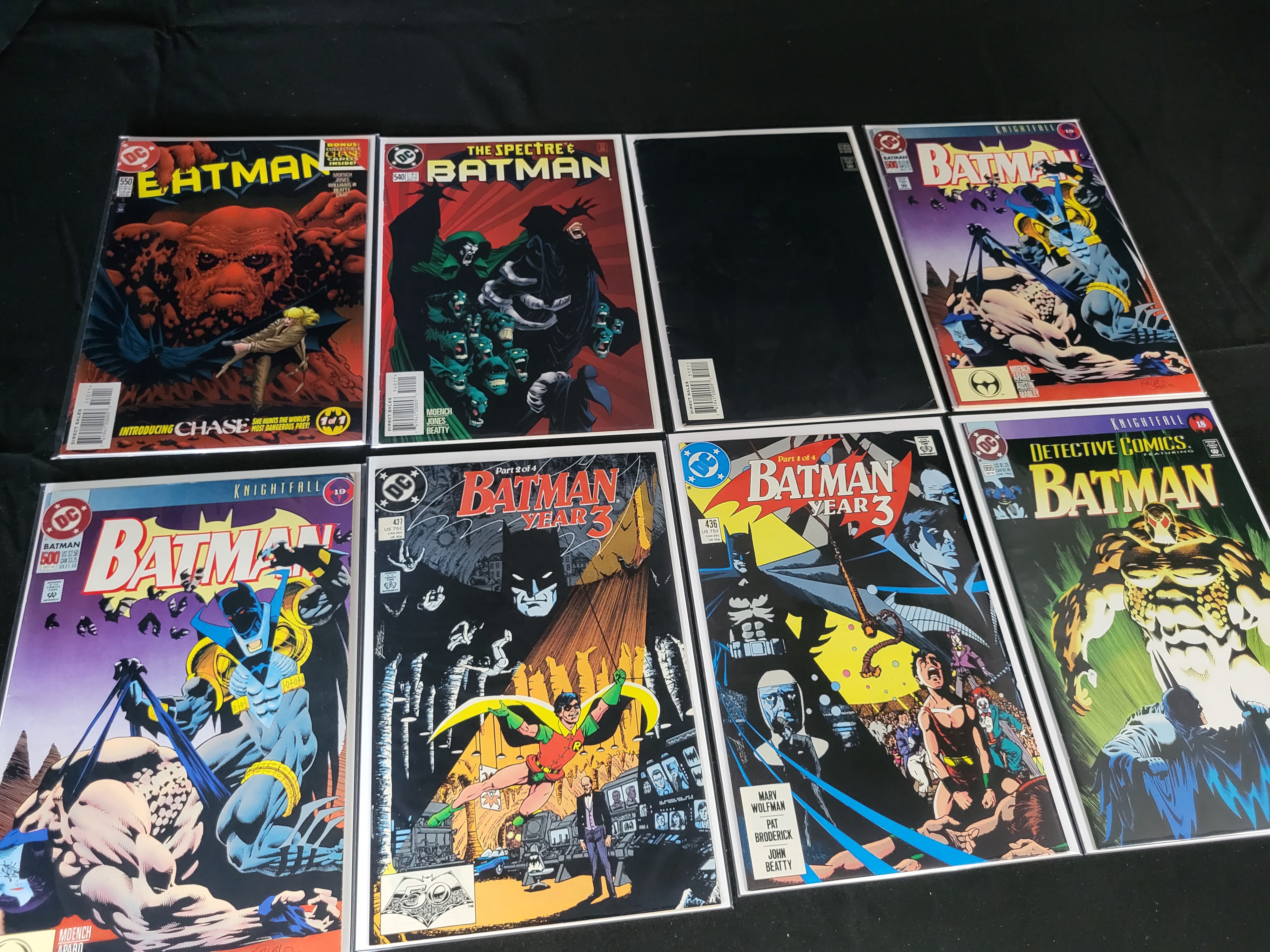 BID PER WHAT YOU SEE IN THE PHOTO, NOT THE AI GENERATED TITLES AND DESCRIPTIONS! A collection of Modern Age DC comic books primarily from the Batman and Detective Comics series, dating from the late 1980s and 1990s. The group includes Batman #436 and #437, which are parts of the Year 3 storyline, with issue #436 featuring the first appearance of Tim Drake. The lot contains multiple copies of Batman #500 from the Knightfall saga, including a black embossed variant cover. Additional issues include Batman #540 featuring The Spectre, Batman #550 introducing the character Chase, and Detective Comics #666, which is part of the Knightfall crossover. Credits for the issues include industry figures such as Marv Wolfman, Pat Broderick, Doug Moench, Kelley Jones, and Jim Aparo. Each item is presented in a protective plastic sleeve with a backing board.