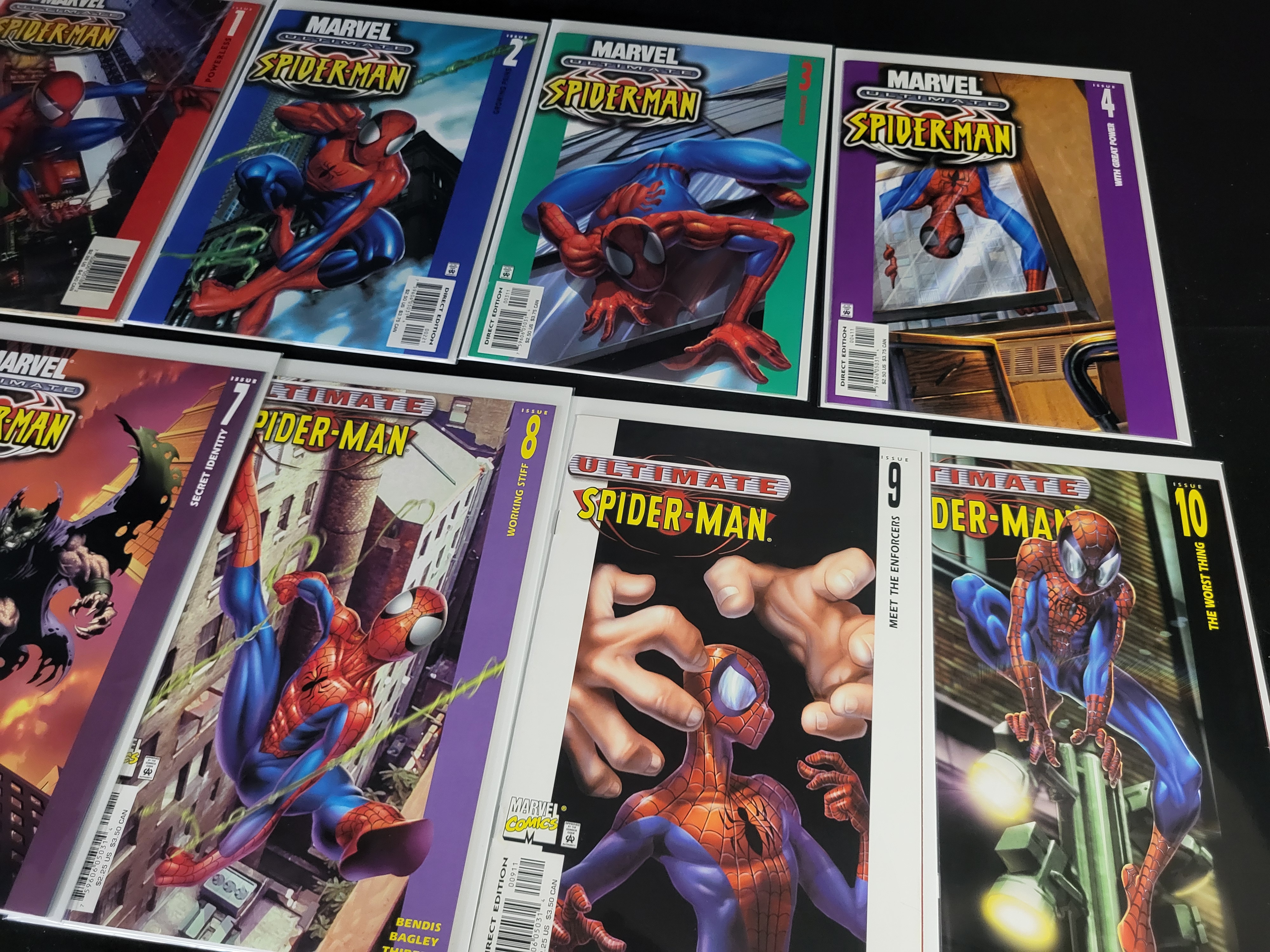 BID PER WHAT YOU SEE IN THE PHOTO, NOT THE AI GENERATED TITLES AND DESCRIPTIONS! This collection of Marvel Comics Ultimate Spider-Man comic books consists of issues from the series published in the early 2000s. The group includes consecutive issues 1 through 10 and the Ultimate Spider-Man Super Special 1. The series features writing by Brian Michael Bendis and illustrations by Mark Bagley and Art Thibert. Cover subtitles include Powerless, Growing Pains, With Great Power, Life Lessons, Big Time Super Hero, Secret Identity, Working Stiff, Meet the Enforcers, and The Worst Thing. All issues are direct editions and are presented in individual protective plastic sleeves with backing boards.