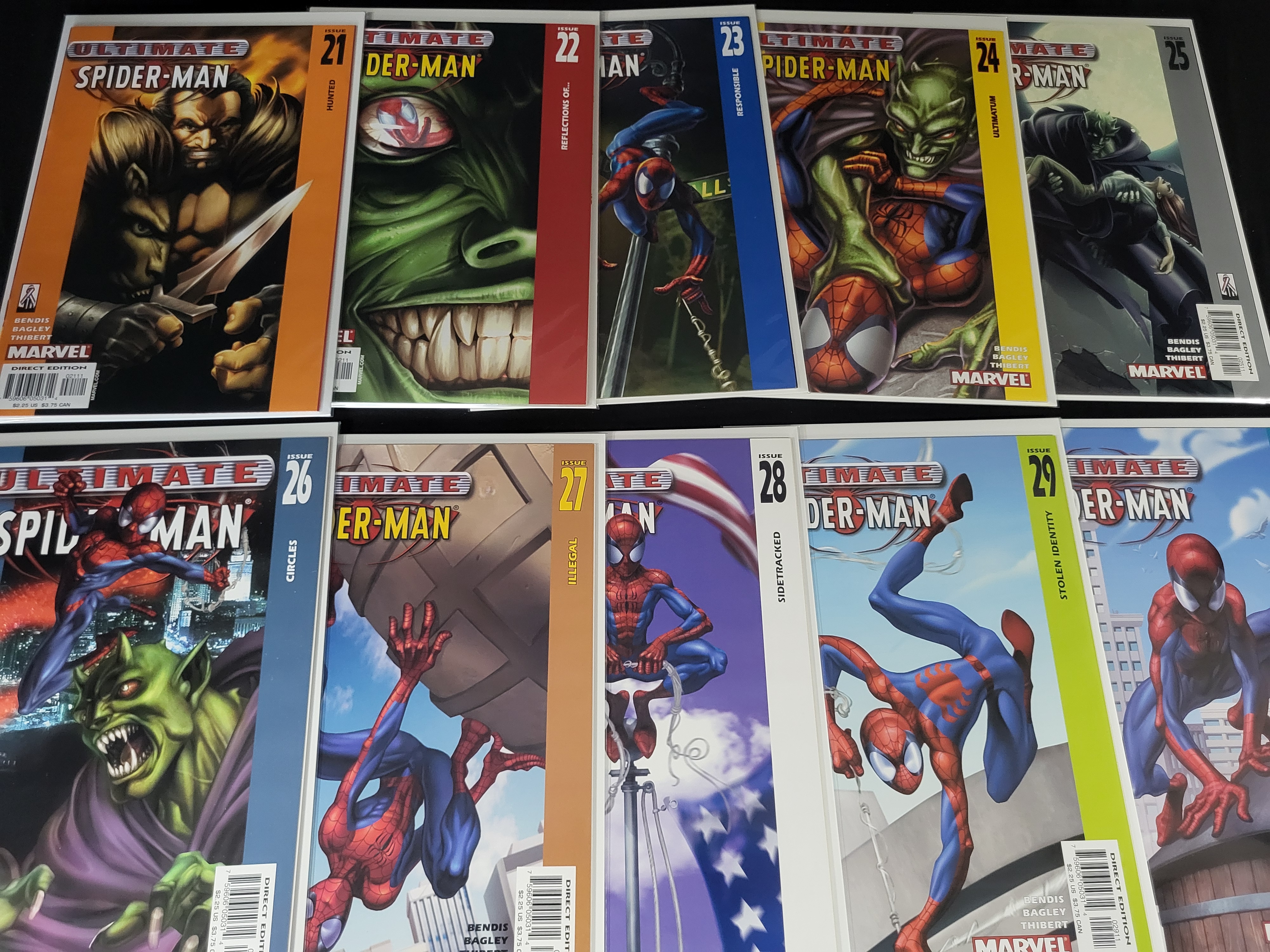 BID PER WHAT YOU SEE IN THE PHOTO, NOT THE AI GENERATED TITLES AND DESCRIPTIONS! A collection of Ultimate Spider-Man comic books published by Marvel Comics, featuring a consecutive run from issue 21 through issue 30. These modern age superhero comics are authored by Brian Michael Bendis with illustrations by Mark Bagley and Art Thibert. Each issue is a Direct Edition and displays its respective title on the right-hand vertical margin, including Hunted, Reflections Of…, Responsible, Ultimatum, Circles, Illegal, Sidetracked, Stolen Identity, and Emergency. The covers feature various characters including Spider-Man, Kraven the Hunter, and the Green Goblin. Each comic is individually housed in a clear protective sleeve with a white backing board.