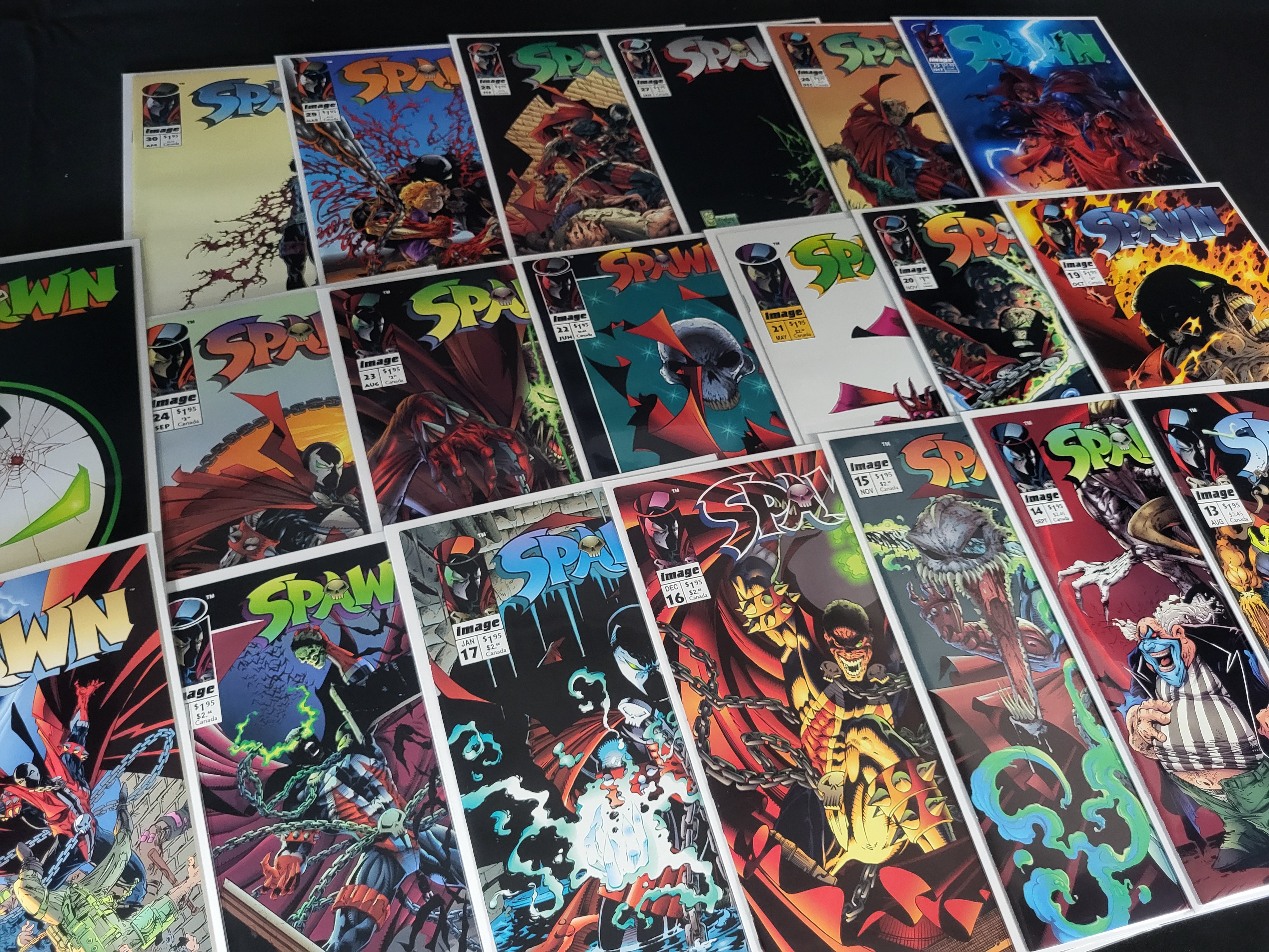 BID PER WHAT YOU SEE IN THE PHOTO, NOT THE AI GENERATED TITLES AND DESCRIPTIONS! A collection of Image Comics Spawn comic books, featuring a series of issues ranging from number 11 to 30. These publications were created by Todd McFarlane and released during the early-to-mid 1990s. The items are staple-bound paper periodicals with illustrated covers. Each comic is individually housed in a protective plastic sleeve with a backing board. The covers display standard trade dress including the publisher logo, series title, issue numbering, and original retail pricing.