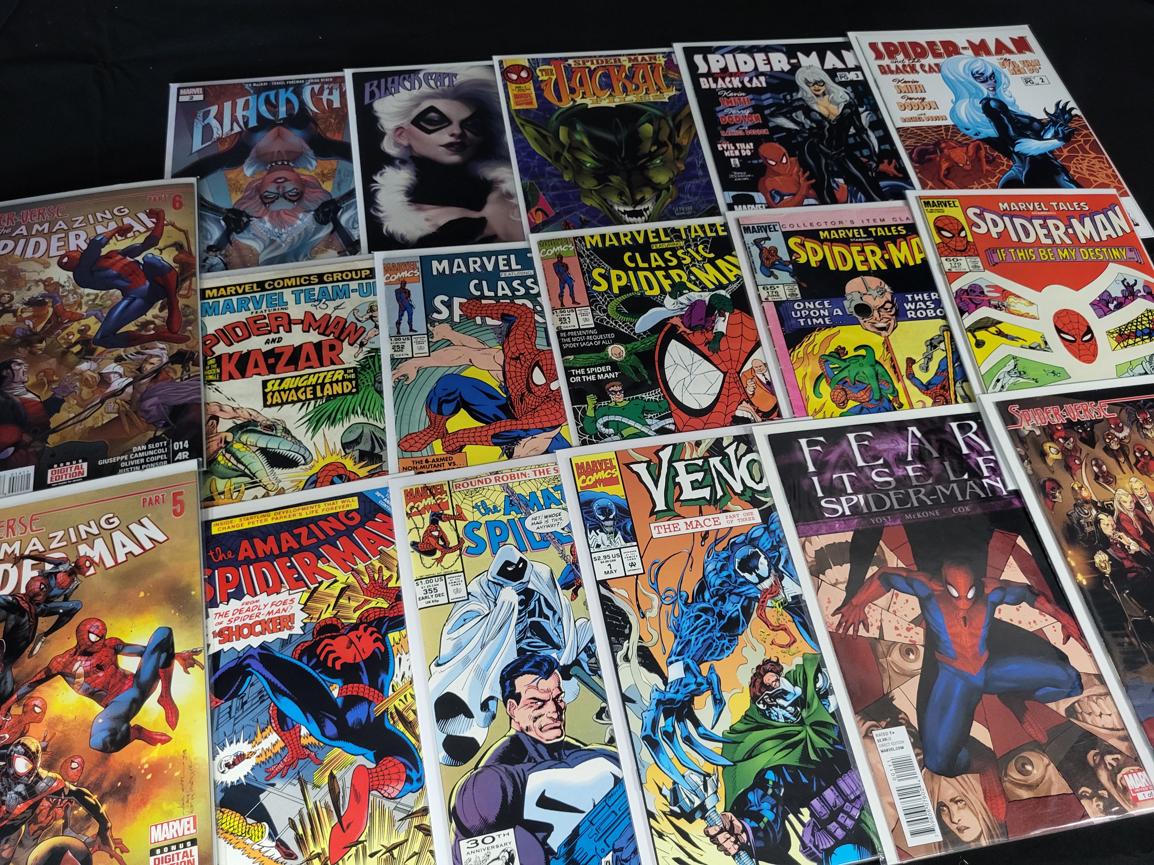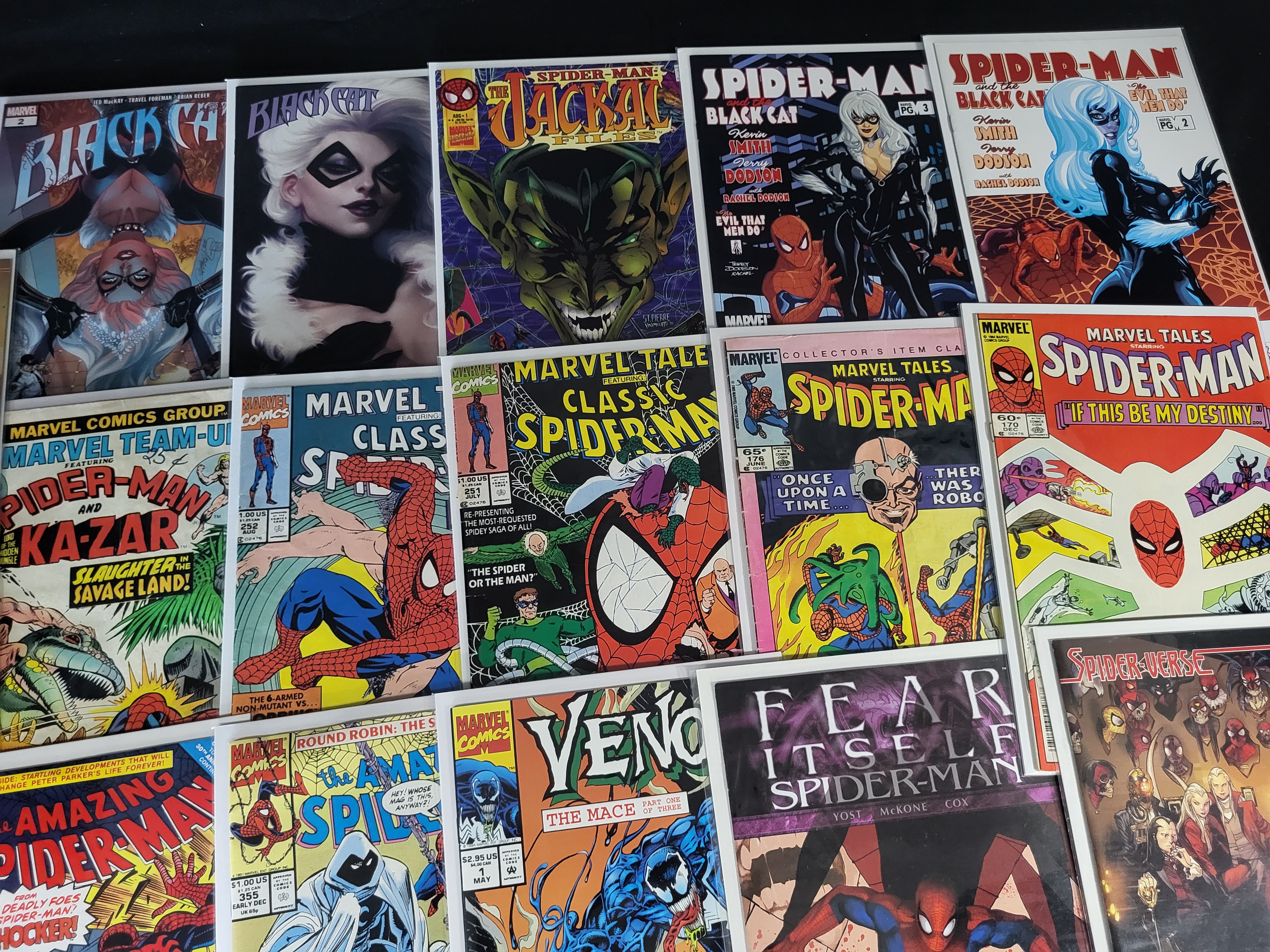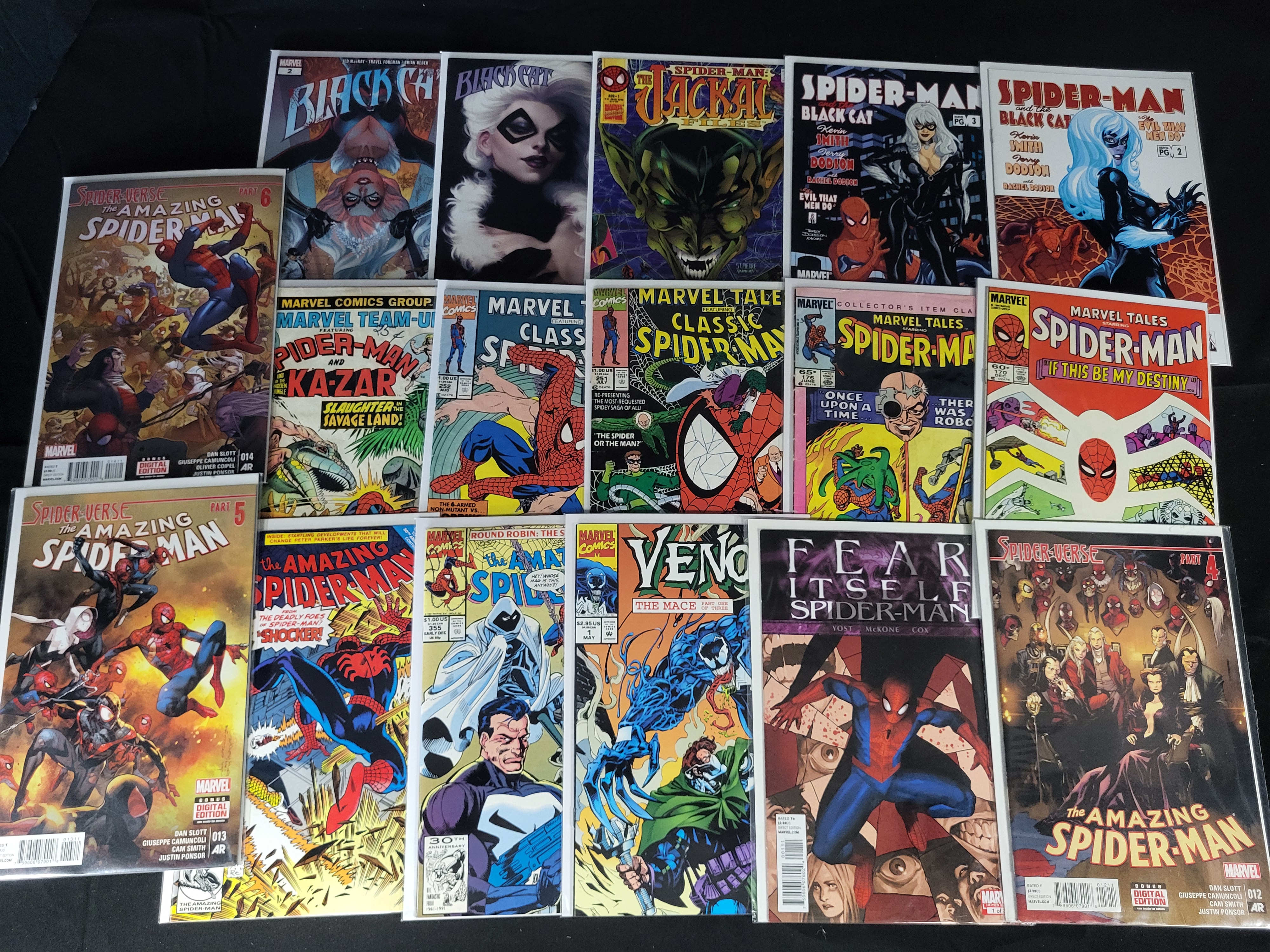 BID PER WHAT YOU SEE IN THE PHOTO, NOT THE AI GENERATED TITLES AND DESCRIPTIONS! A collection of Marvel comic books primarily featuring Spider-Man and associated characters, spanning the Bronze Age through the modern era. The group includes various titles such as The Amazing Spider-Man, including installments from the Spider-Verse story arc, Black Cat, and Spider-Man and the Black Cat: The Evil That Men Do. Also present are issues of Marvel Tales, Marvel Team-Up, Venom: The Mace, and Fear Itself: Spider-Man. Specific notable issues include The Amazing Spider-Man number 335, The Jackal Files number 1, and several Marvel Tales reprints featuring appearances by the Punisher, Moon Knight, and Ka-Zar. The collection features work by creators including Dan Slott, Kevin Smith, and Terry Dodson. The comics are printed on standard comic stock and are individually housed in protective plastic sleeves with cardboard backings.