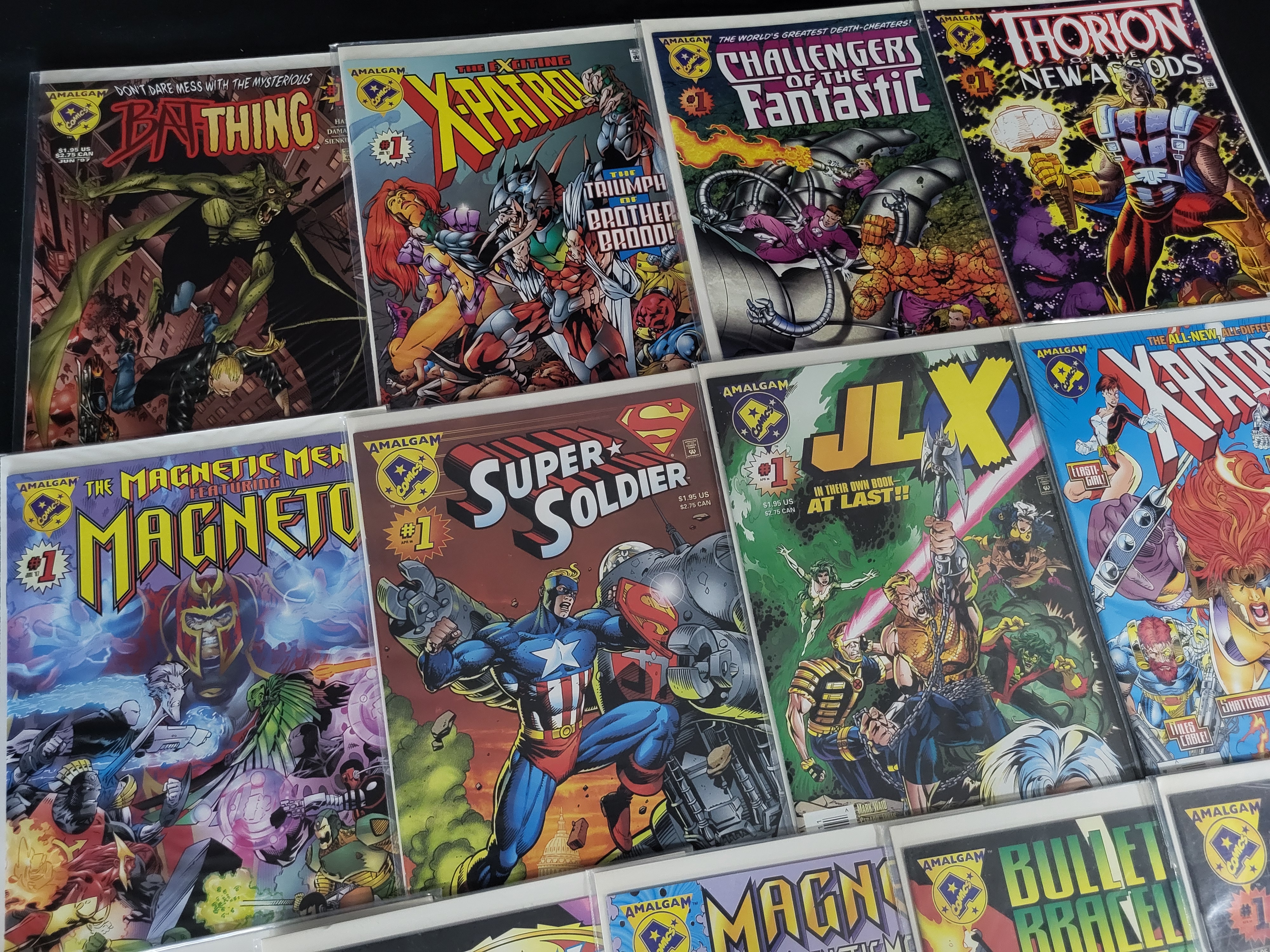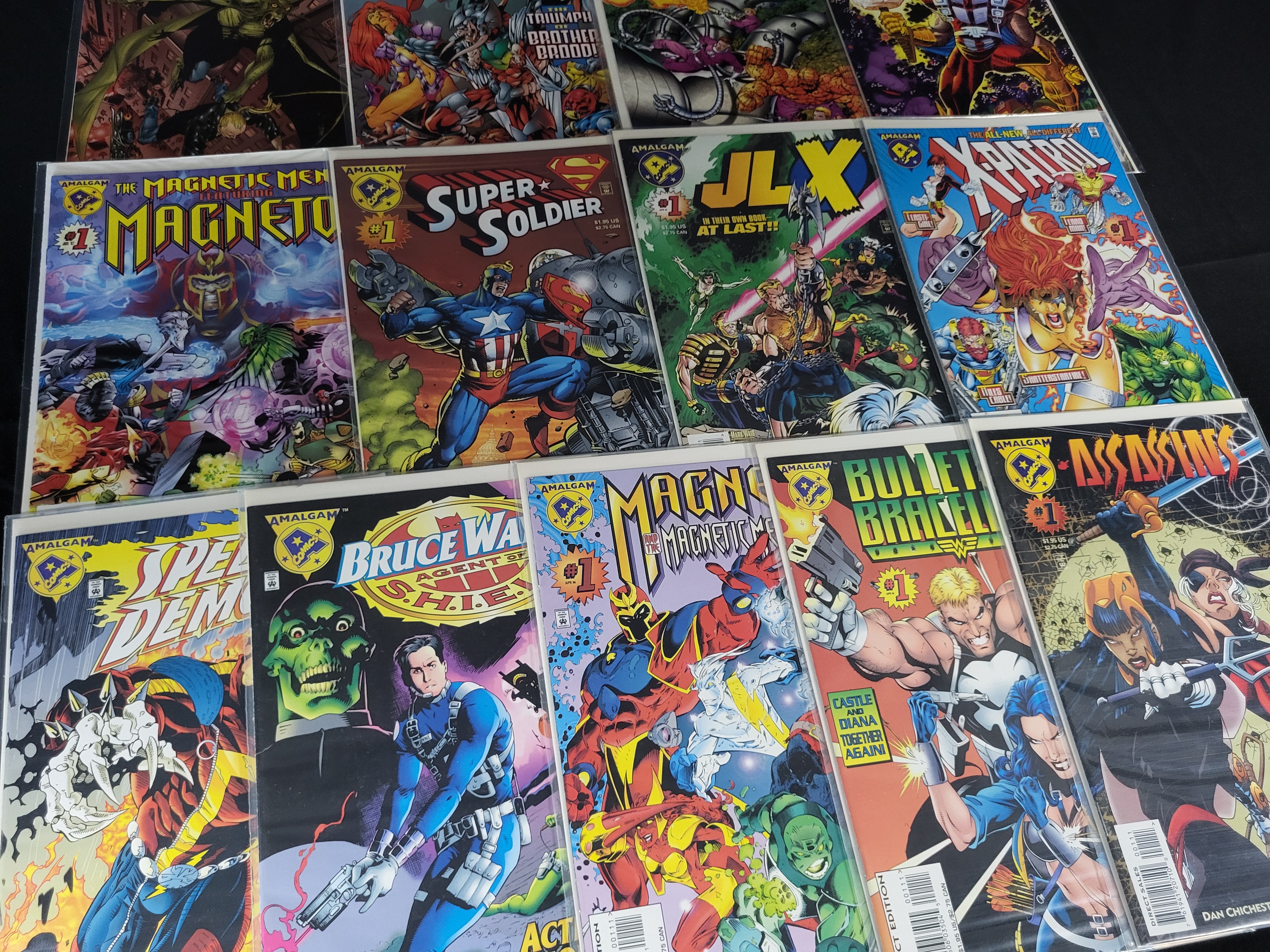 BID PER WHAT YOU SEE IN THE PHOTO, NOT THE AI GENERATED TITLES AND DESCRIPTIONS! A collection of comic books from the Amalgam Comics imprint, a collaborative publishing venture between DC Comics and Marvel Comics released in the late 1990s. The group consists of various issue number 1 titles featuring hybrid characters from both universes. Visible titles include Super Soldier, Bruce Wayne: Agent of S.H.I.E.L.D., JLX, Speed Demon, Bat-Thing, Thorion of the New Asgods, Assassins, Magneto and the Magnetic Men, Challengers of the Fantastic, X-Patrol, and Bullets and Bracelets. Each comic is printed on standard comic stock with color illustrations and is individually housed in a clear protective plastic sleeve with a cardboard backing board.