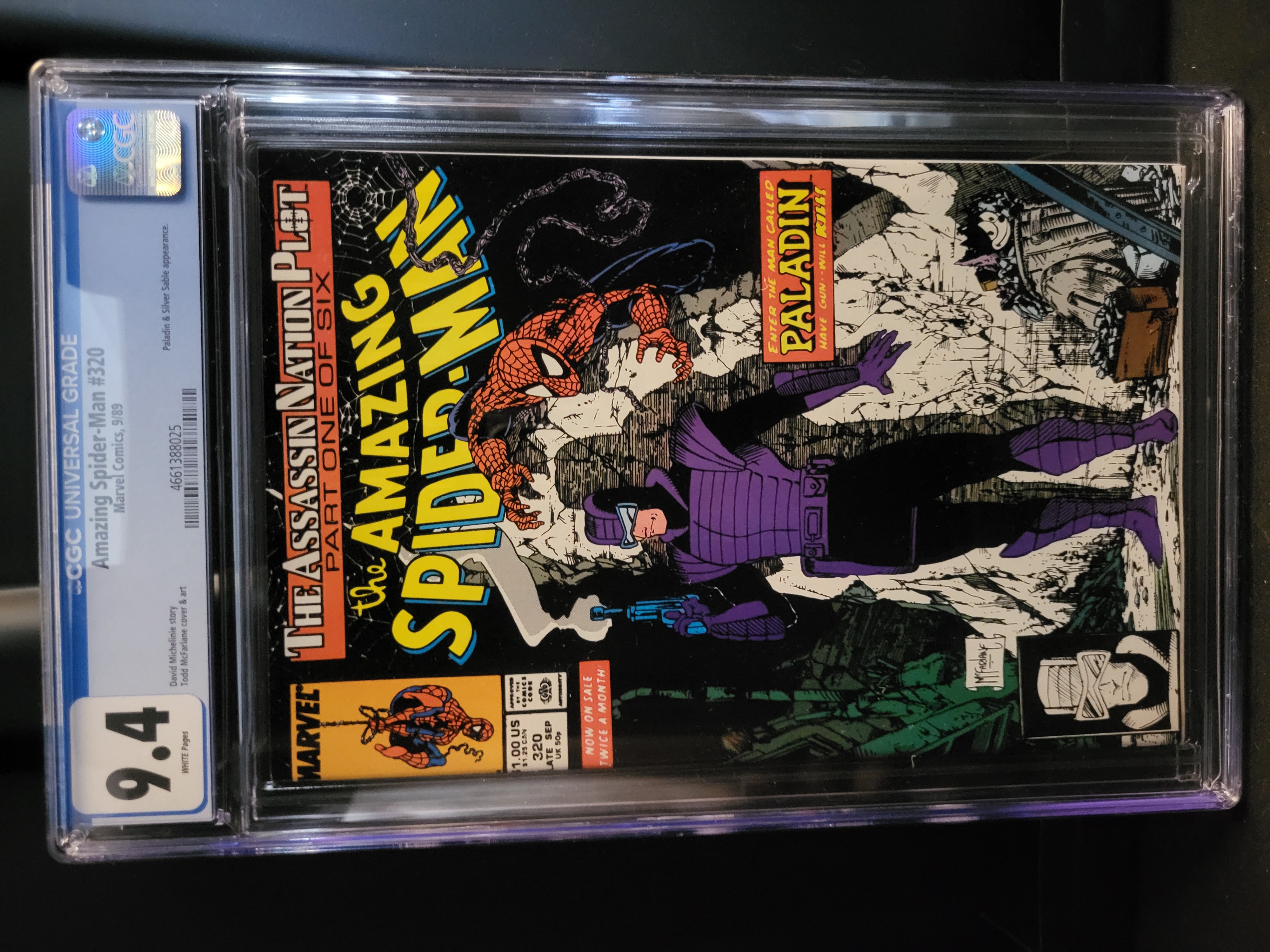 BID PER WHAT YOU SEE IN THE PHOTO, NOT THE AI GENERATED TITLES AND DESCRIPTIONS! This lot features a copy of The Amazing Spider-Man #320, published by Marvel Comics in September 1989. The issue contains part one of the Assassin Nation Plot storyline. The cover and interior art are by Todd McFarlane, and the story is written by David Michelinie. The front cover illustrates Spider-Man alongside Paladin. The reverse of the comic displays a full-page color advertisement for Schwinn bicycles. The item is professionally encapsulated in a tamper-evident holder by the Certified Guaranty Company (CGC).