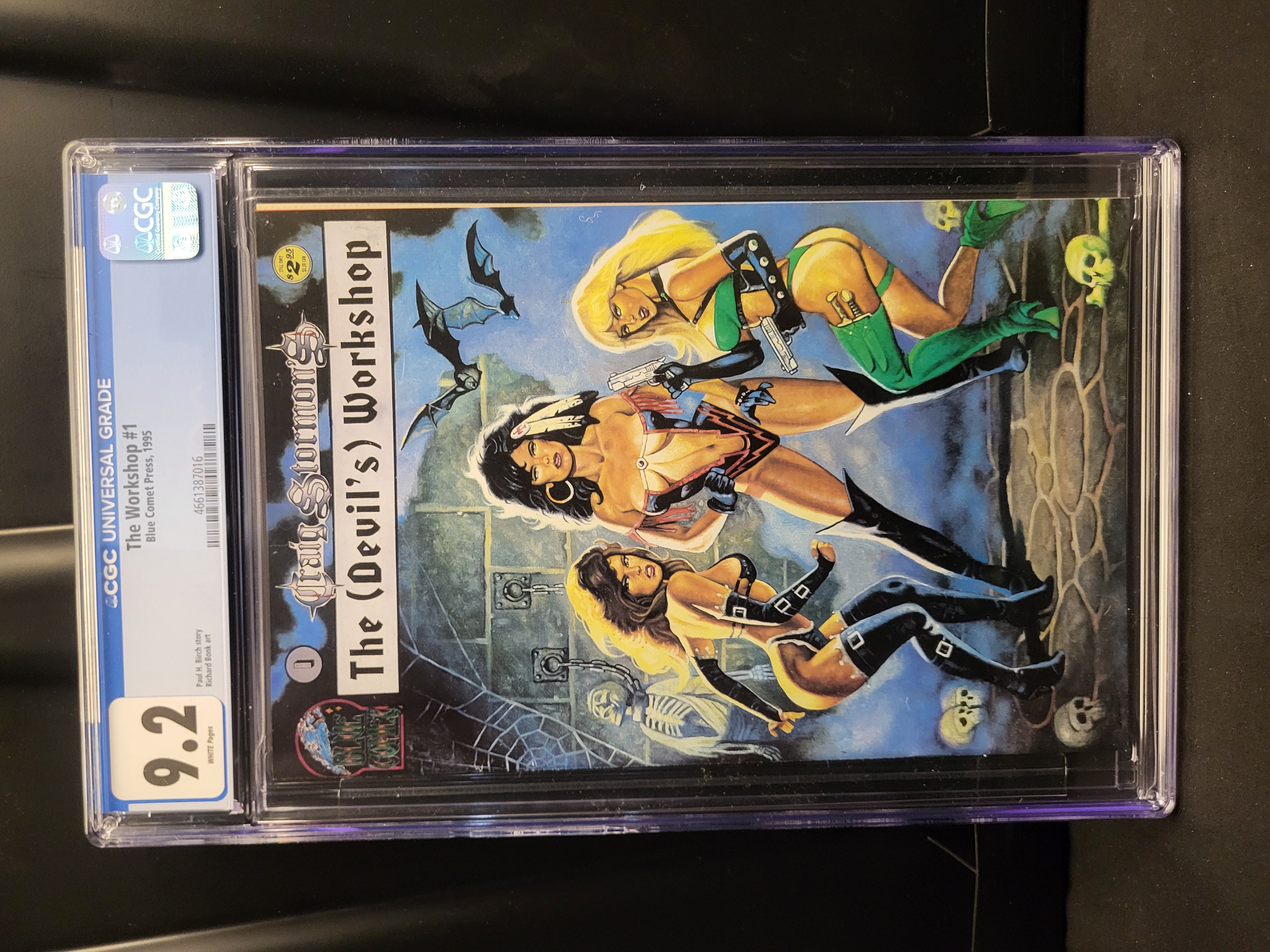 BID PER WHAT YOU SEE IN THE PHOTO, NOT THE AI GENERATED TITLES AND DESCRIPTIONS! This lot consists of a single copy of Craig Stormon’s The (Devil’s) Workshop #1, published by Blue Comet Press in 1995. The comic features a story by Paul H. Birch and artwork by Richard Bonk. The front cover displays color fantasy-style illustrations of three female figures in stylized attire set against a night sky with bats and skulls. The back cover contains a black and white illustration titled The Cursed Worlds along with the publisher’s address and contact information. The comic is professionally encapsulated in a tamper-evident plastic slab from the Certified Guaranty Company (CGC).