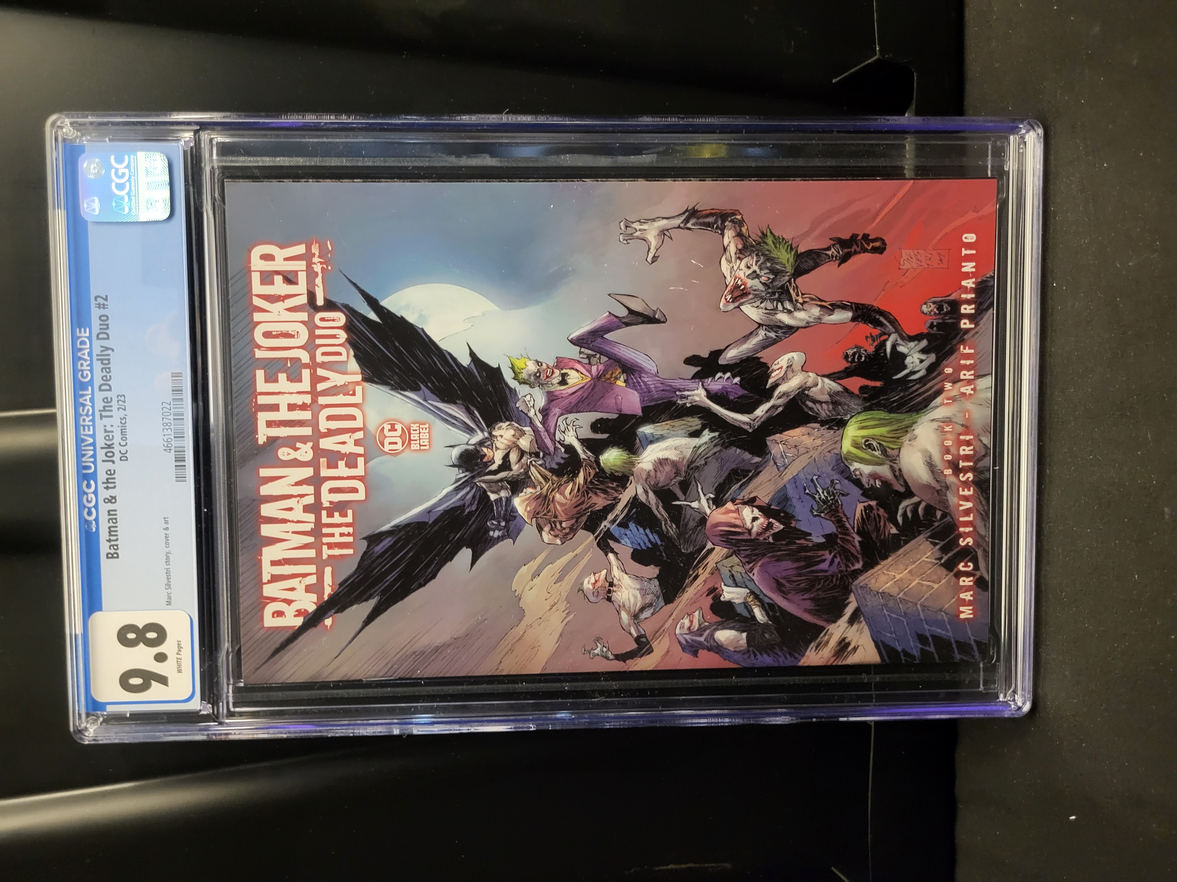 BID PER WHAT YOU SEE IN THE PHOTO, NOT THE AI GENERATED TITLES AND DESCRIPTIONS! A copy of the comic book Batman & The Joker: The Deadly Duo #2, published by DC Comics under the Black Label imprint in February 2023. This issue is part of a seven-issue limited series featuring story and cover art by Marc Silvestri with coloring by Arif Prianto. The front cover, designated as Cover A, depicts Batman and the Joker in combat against several monstrous figures. The back cover is predominantly black with a centered black-and-white illustration, a quote from Batman, and a barcode with retail information. The comic is professionally graded and encapsulated by the Certified Guaranty Company (CGC).