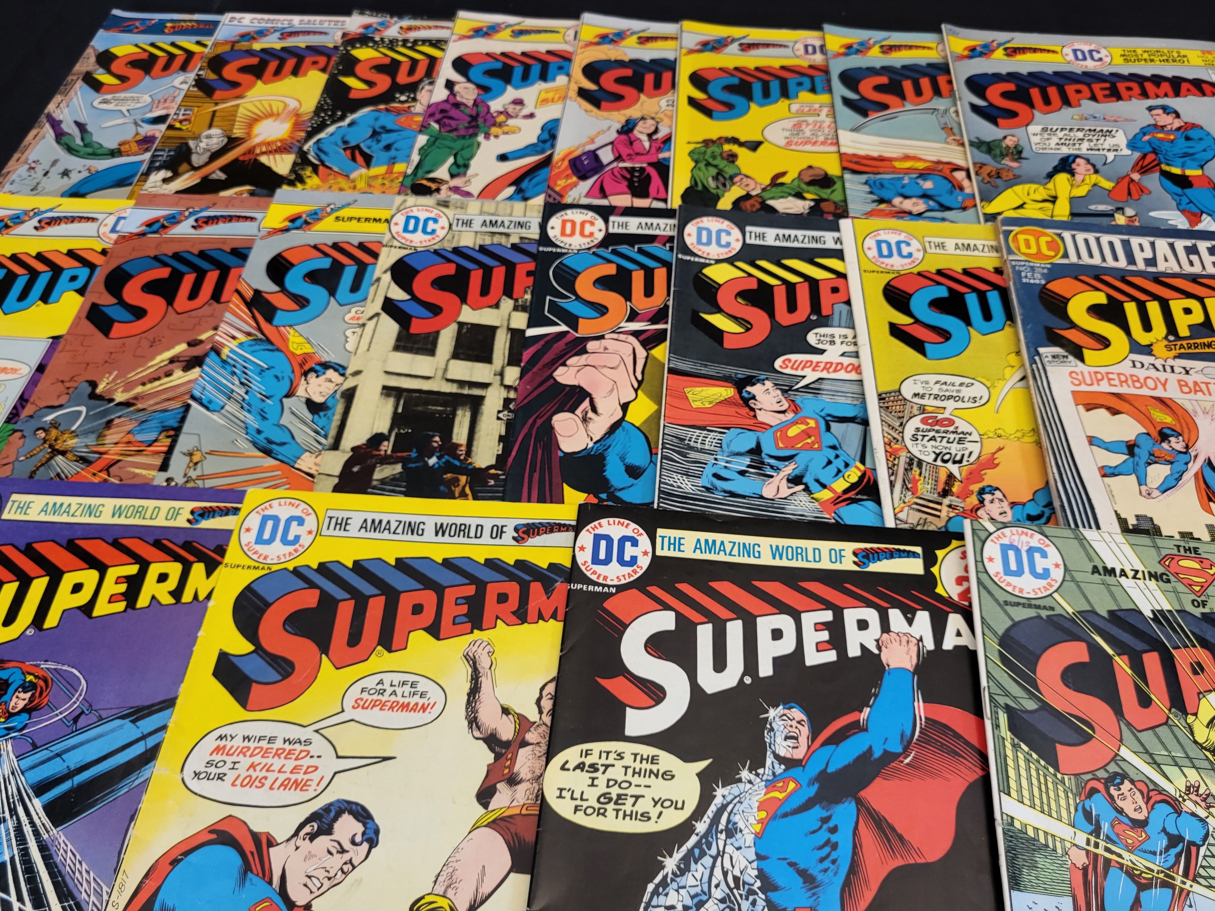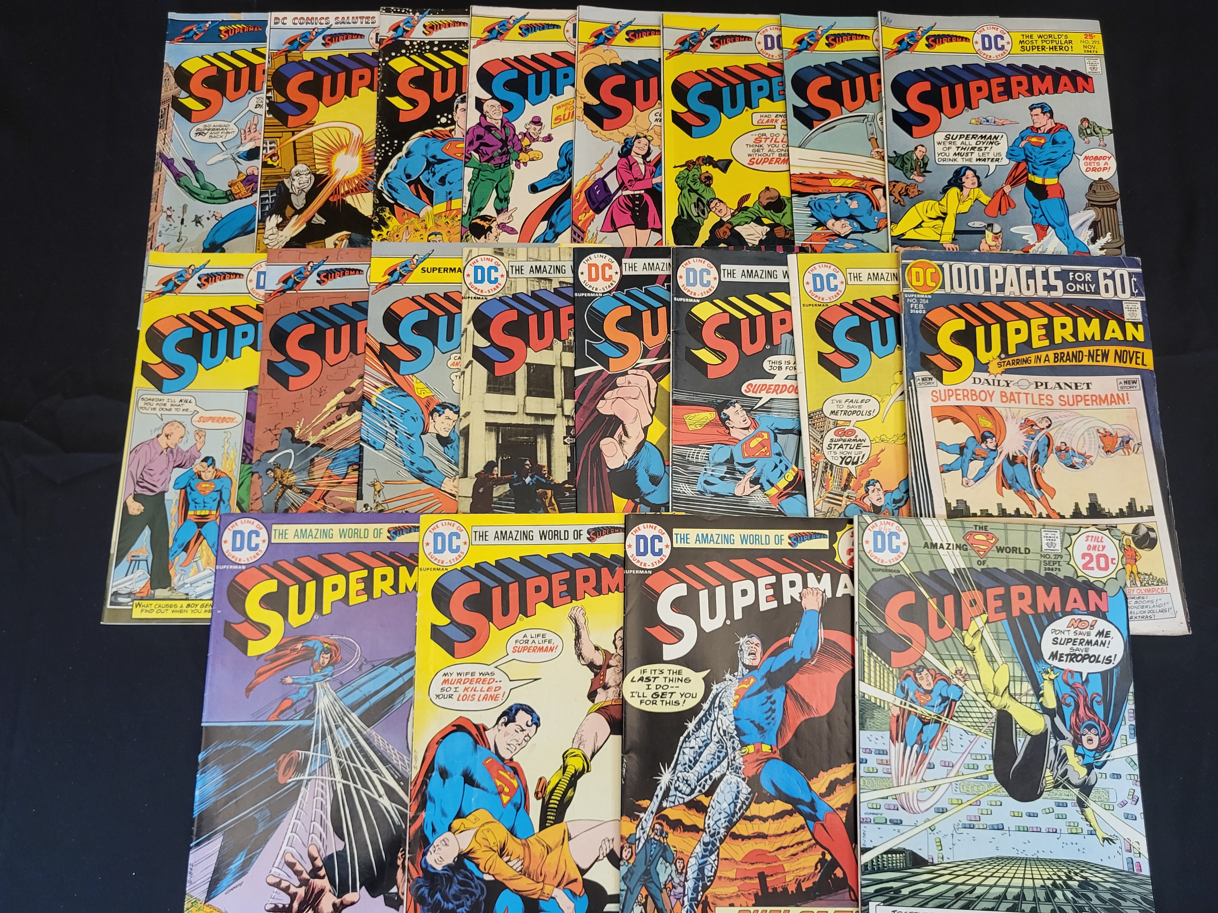 BID PER WHAT YOU SEE IN THE PHOTO, NOT THE AI GENERATED TITLES AND DESCRIPTIONS! A collection of vintage DC Comics Superman comic books dating from the Bronze Age, primarily the mid-1970s. The group includes various standard monthly issues and a 100-page giant edition, issue number 284. Other visible issue numbers include 279 and 290. The covers feature the DC bullet logo and The Line of Super-Stars branding. Original cover prices range from 20 cents to 60 cents. The publications are printed on standard comic book newsprint with color illustrated covers.