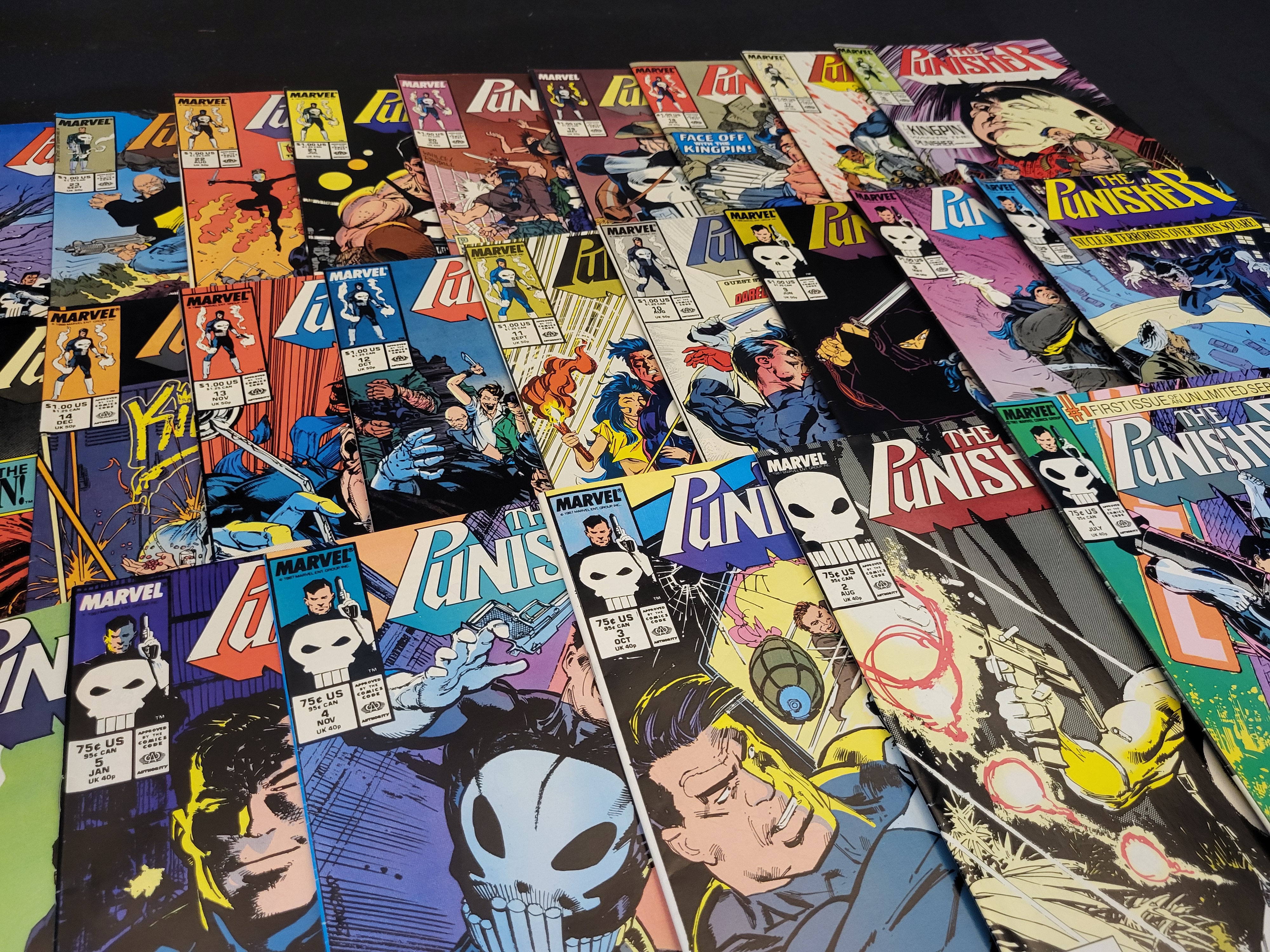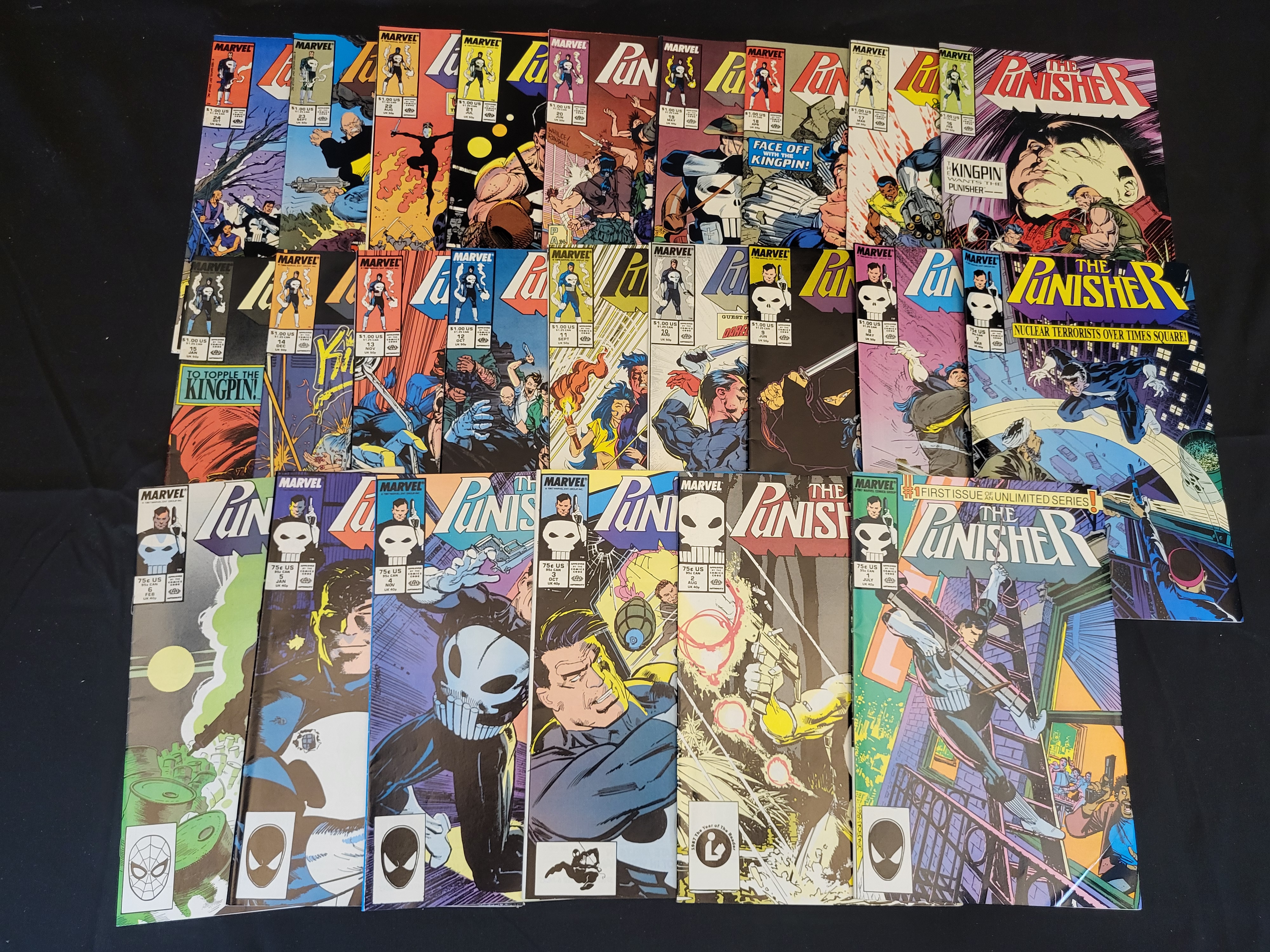 BID PER WHAT YOU SEE IN THE PHOTO, NOT THE AI GENERATED TITLES AND DESCRIPTIONS! A collection of vintage comic books featuring The Punisher, published by Marvel Comics. This group primarily consists of issues from the second ongoing series, Vol. 2, which commenced in 1987. The collection includes issue number 1 from July 1987, noted as the first issue of the unlimited series. The assortment contains various consecutive and non-consecutive issues dating from the late 1980s, with issue numbers ranging up to 24. Each comic features the standard Marvel trade dress of the period, including original cover prices between 75 cents and 1.00 dollar. The items are printed on standard comic paper with illustrated color covers.